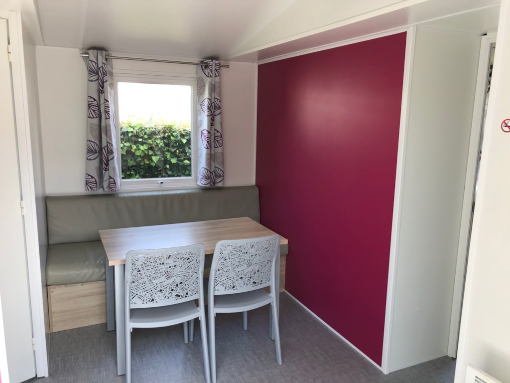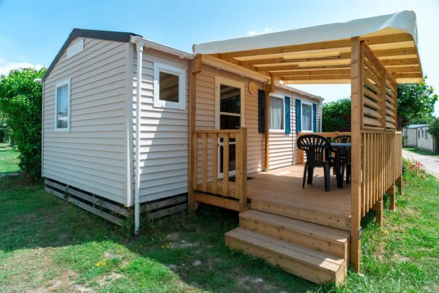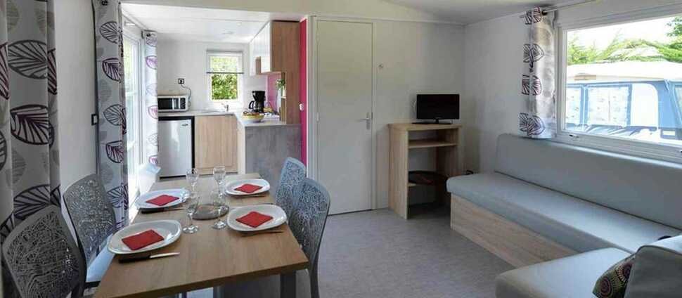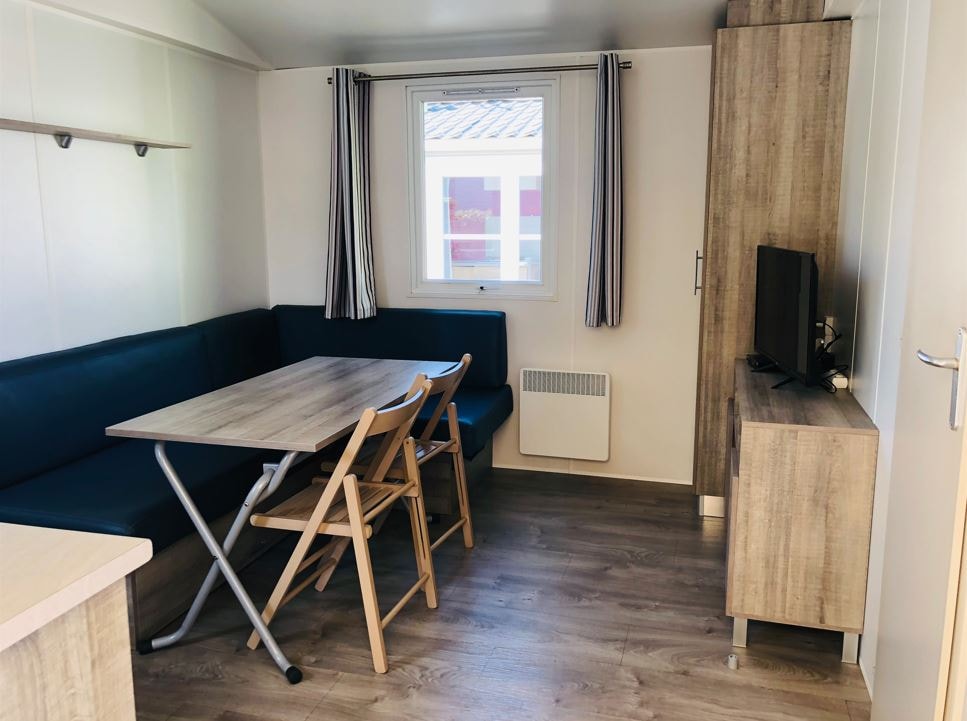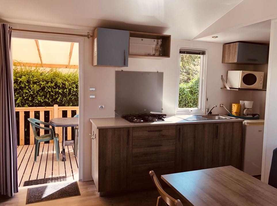 The mobile home two bedrooms comfort has two bedrooms, one with a 140 cm bed and one with two beds of 80 cm. The kitchen is equipped for 4 people. You can eat either inside or on the terrace with a table and chairs. The toilet is separate from the bathroom. Animals are not allowed in the rentals.