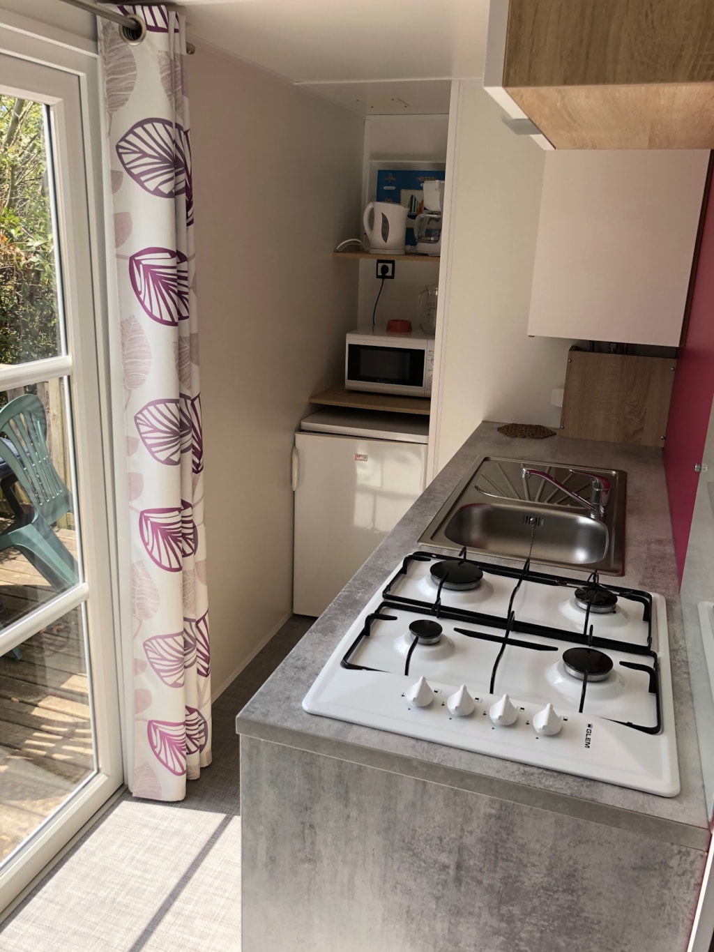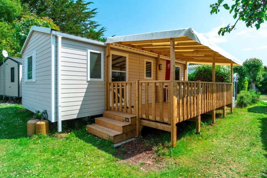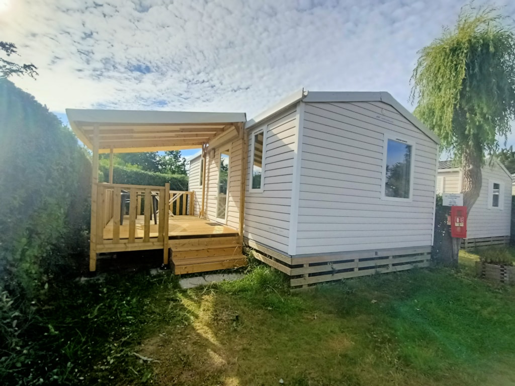 The mobile home Classic is a cozy mobile home one bedroom with double bed, a sofa in the living room and a fully equipped kitchen. The bathroom has a shower and toilet. There is an outdoor terrace to enjoy the sunny days with a parasol. Perfect for a stay alone or as a couple !