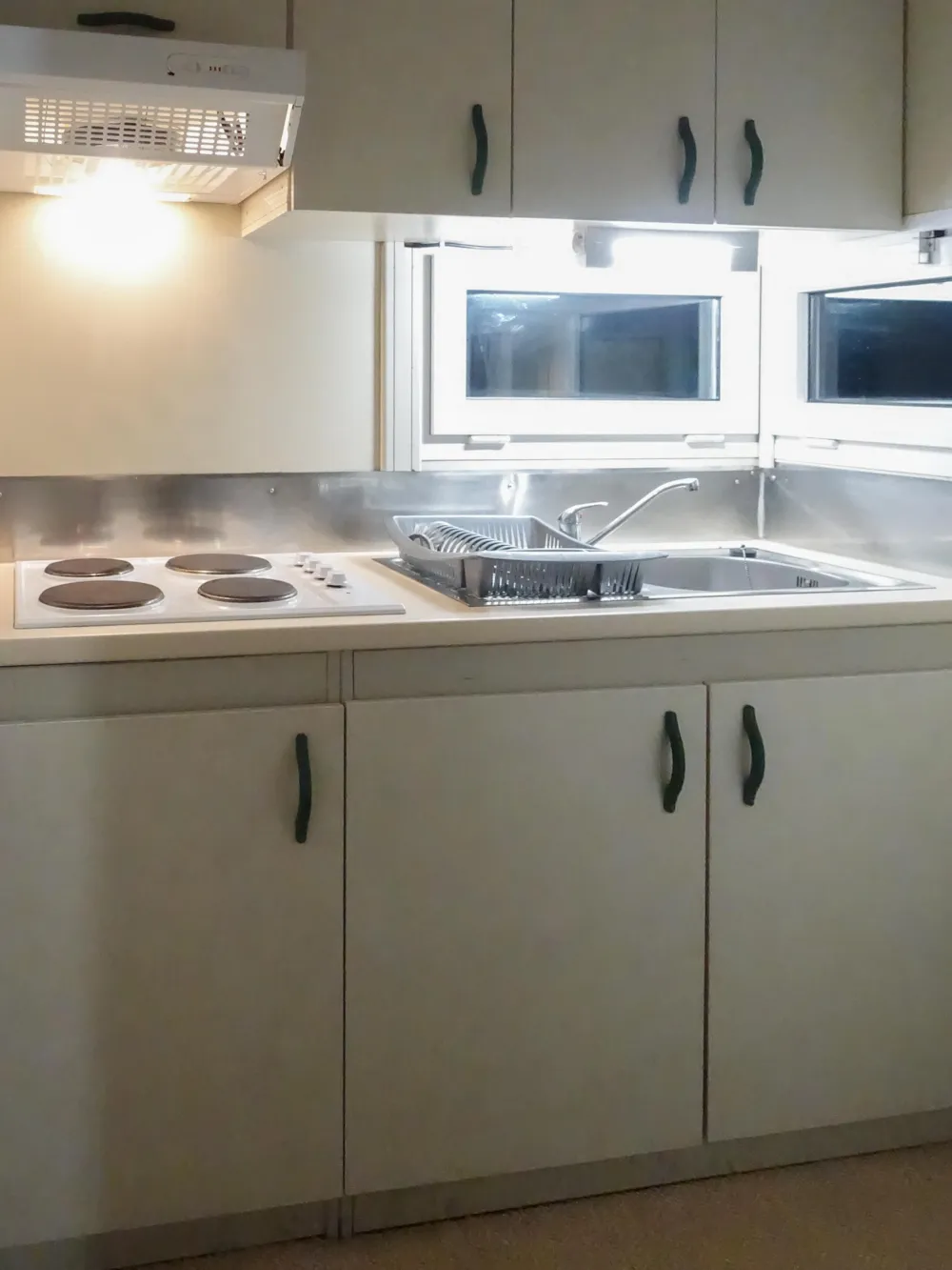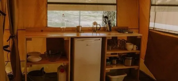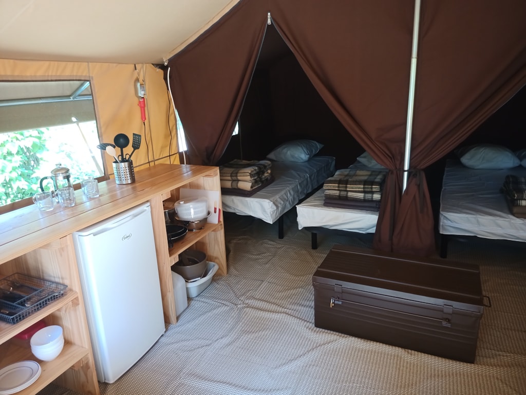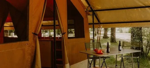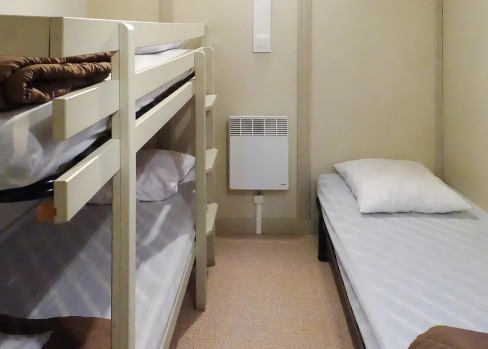 Dieses komplett ausgestattete Holzchalet umfasst 2 Schlafzimmer: eines mit einem Doppelbett (140x200) und eines mit 2 Etagenbetten (80x200) und einem zusätzlichen Einzelbett (80x200). Decken und Kopfkissen werden gestellt, aber keine Bettwäsche. Profitieren Sie von einer voll ausgestatteten Küche (Kühlschrank, Kaffeemaschine, Mikrowelle, 2 Gaskochstellen, Geschirr). Dieses Chalet umfasst außerdem ein Badezimmer mit Dusche und separaten Sanitäranlagen. Angenehme Terrasse von 12m², um den Aufenthalt im Freien zu genießen.