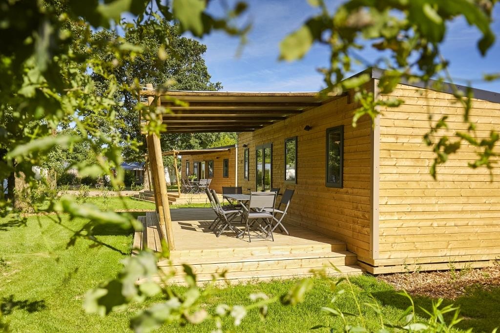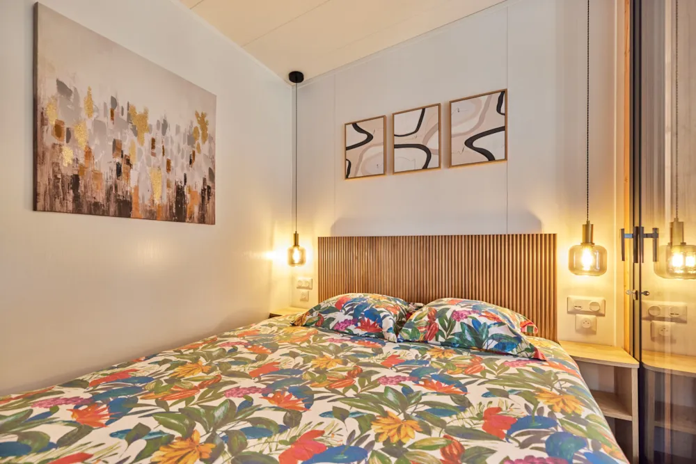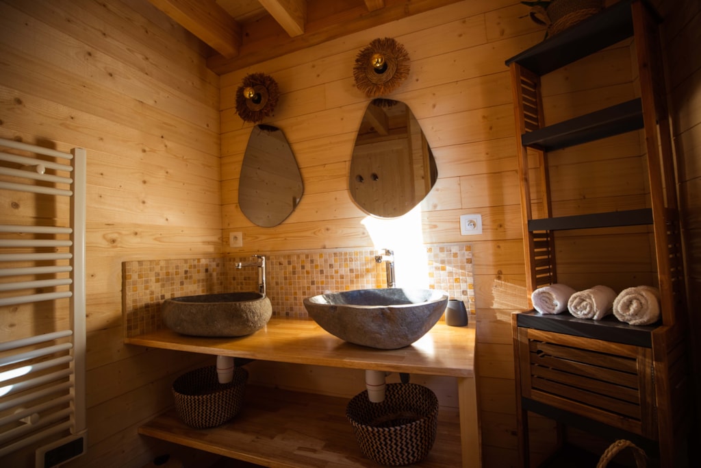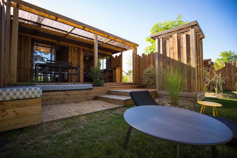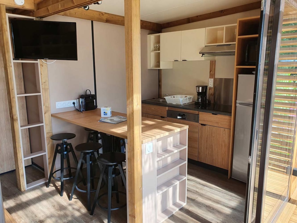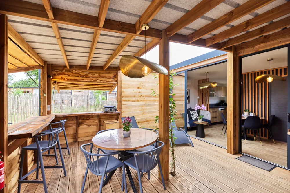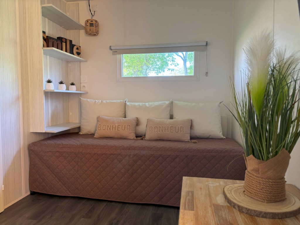 This sublime 35m² Cabane Côté Nature with Spa is spacious and modern, with a master bedroom overlooking the Spa, a second bedroom with a single bed, 1 cross bed and a trundle bed, a fully-equipped kitchen with dishwasher, a double washbasin bathroom and separate WC. You will love the 35m² covered and enclosed terrace, which is open via the entrance door, the shutters and the skylight that lights up the interior vegetation. It is equipped with a griddle, garden furniture, an outdoor table, a mini bar, a bench with a coffee table, sun loungers and, above all, a private 5-seater spa for relaxing after a long day!
