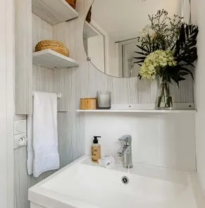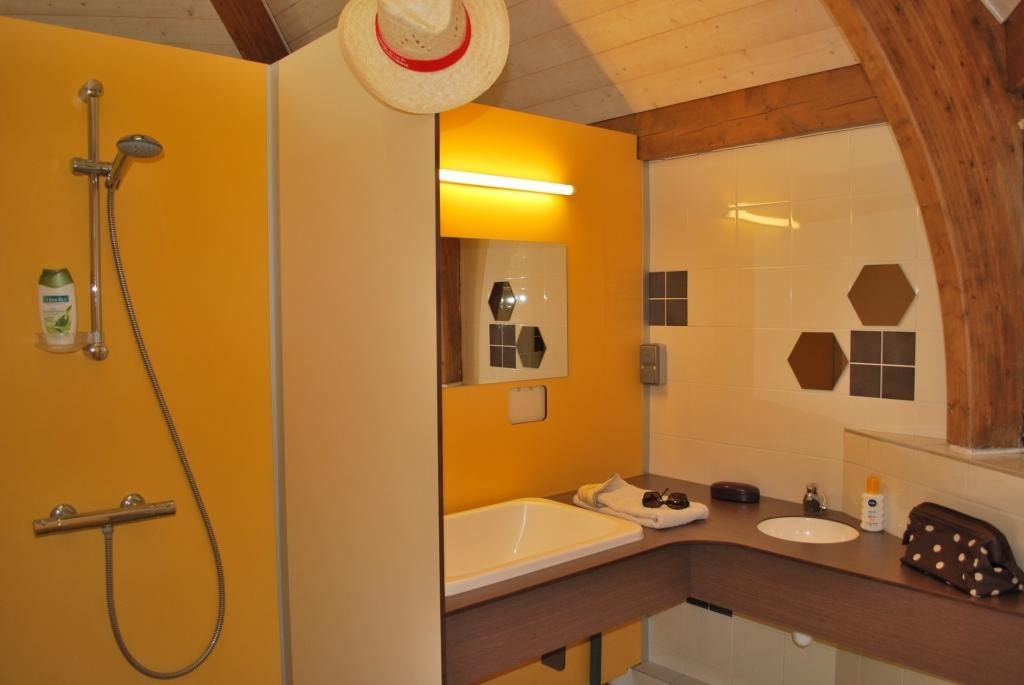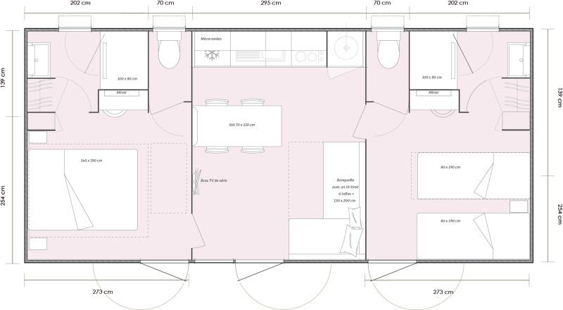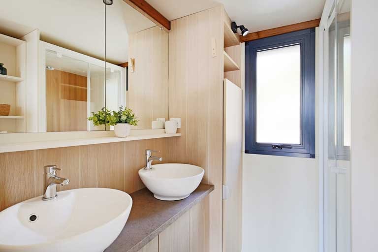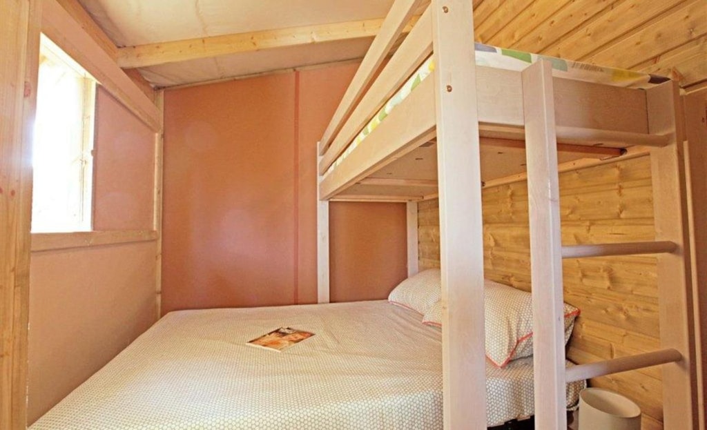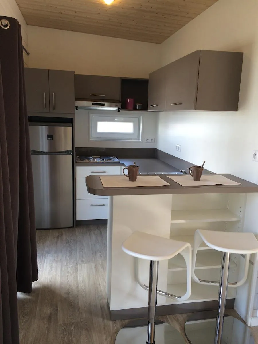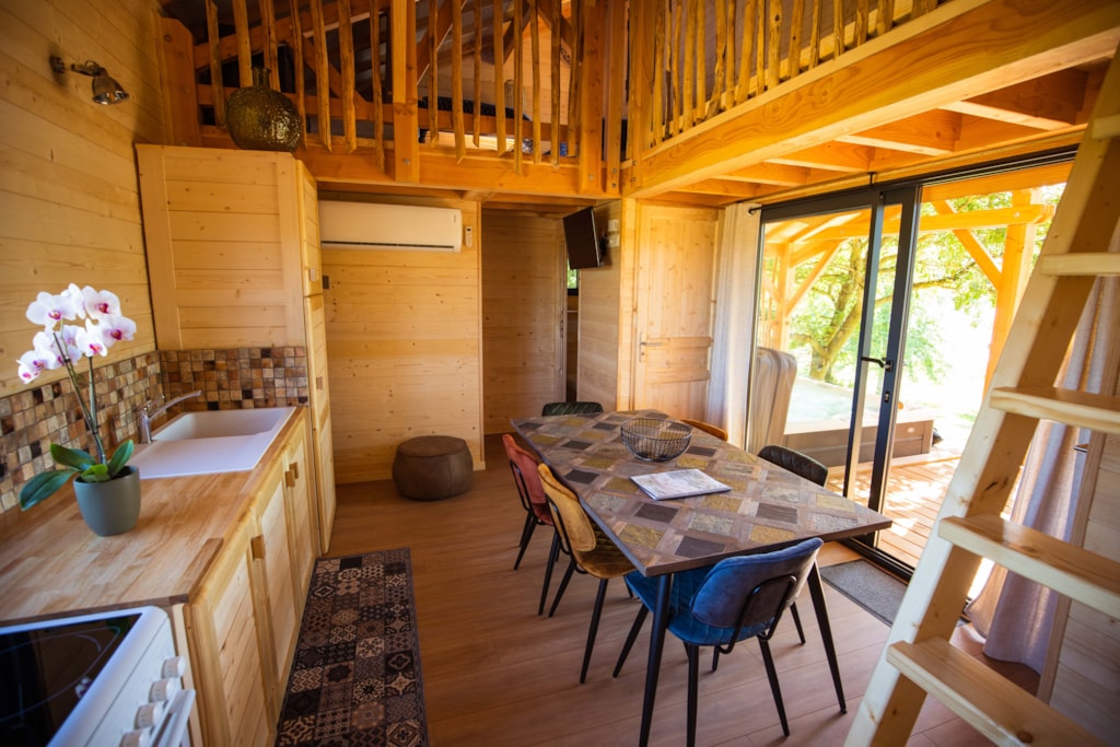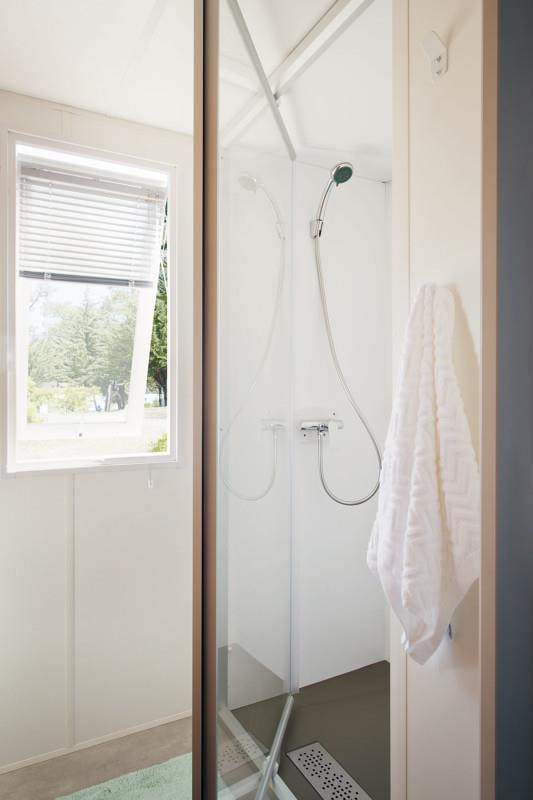 This sublime 35m² Cabane Côté Nature with Spa is spacious and modern, with a master bedroom overlooking the Spa, a second bedroom with a single bed, 1 cross bed and a trundle bed, a fully-equipped kitchen with dishwasher, a double washbasin bathroom and separate WC. You will love the 35m² covered and enclosed terrace, which is open via the entrance door, the shutters and the skylight that lights up the interior vegetation. It is equipped with a griddle, garden furniture, an outdoor table, a mini bar, a bench with a coffee table, sun loungers and, above all, a private 5-seater spa for relaxing after a long day!