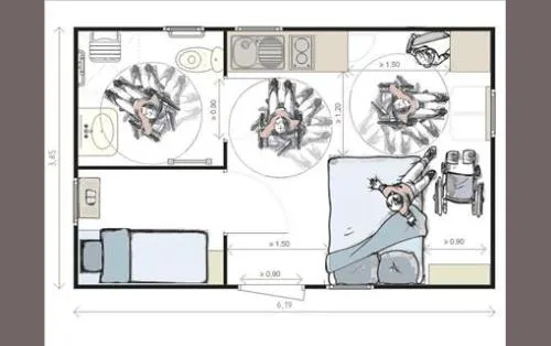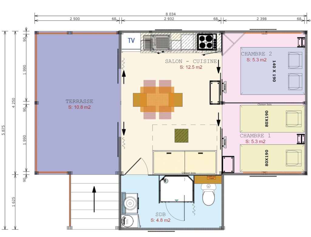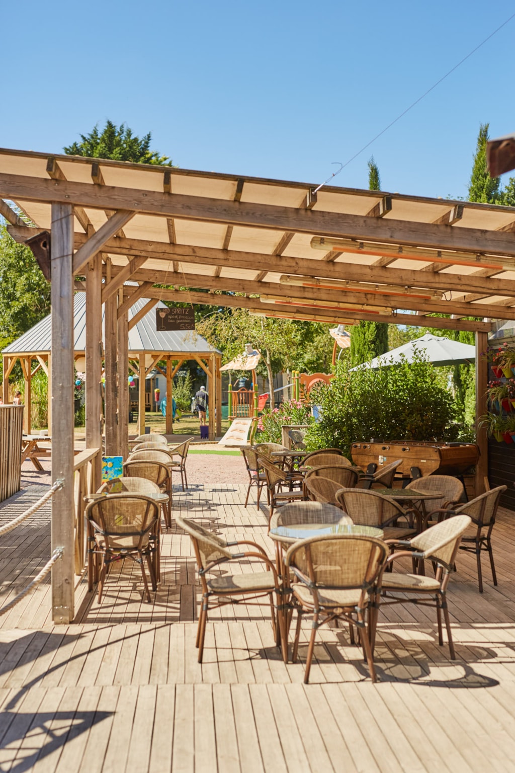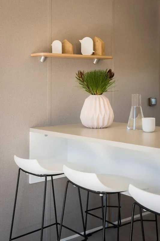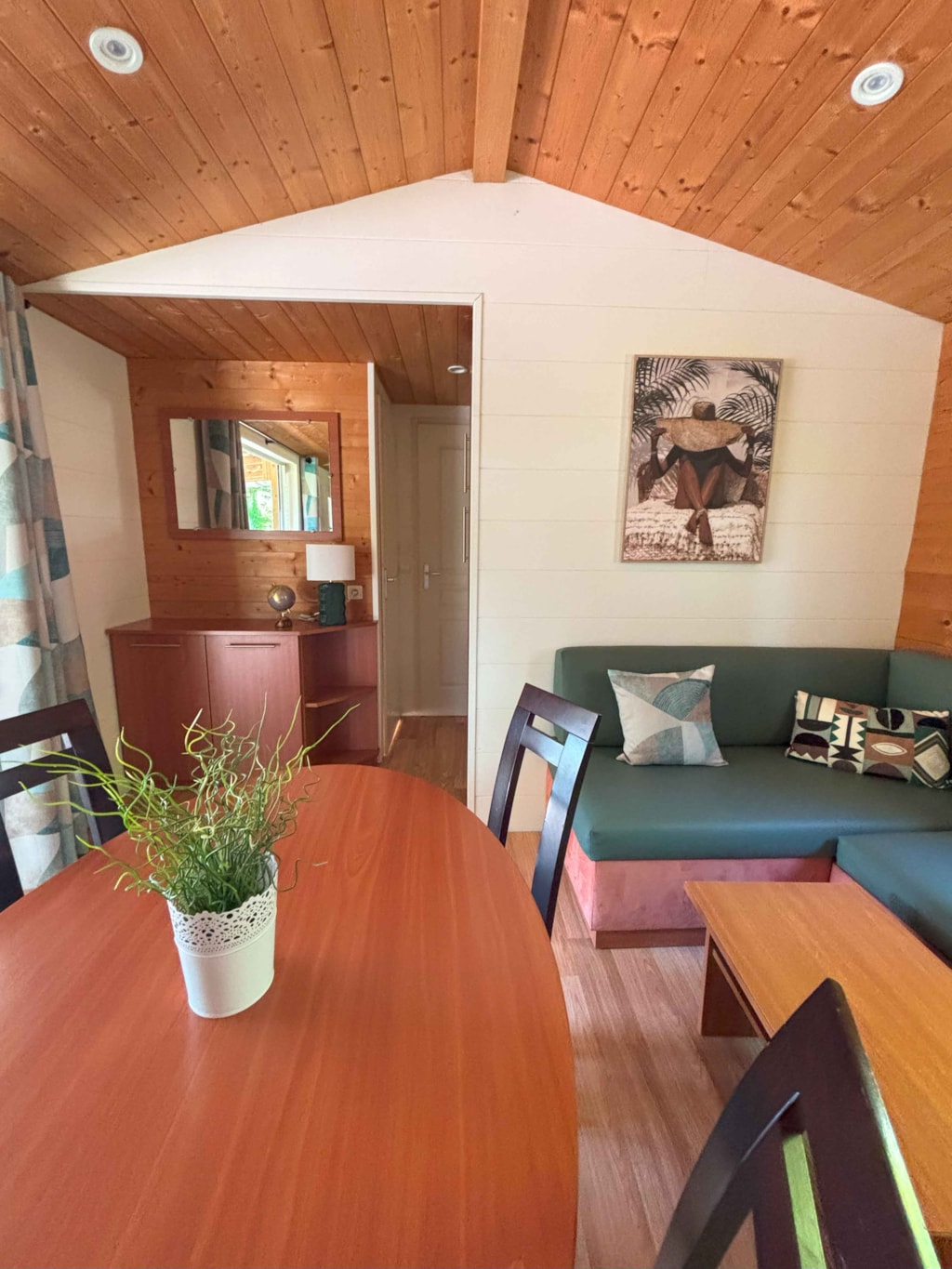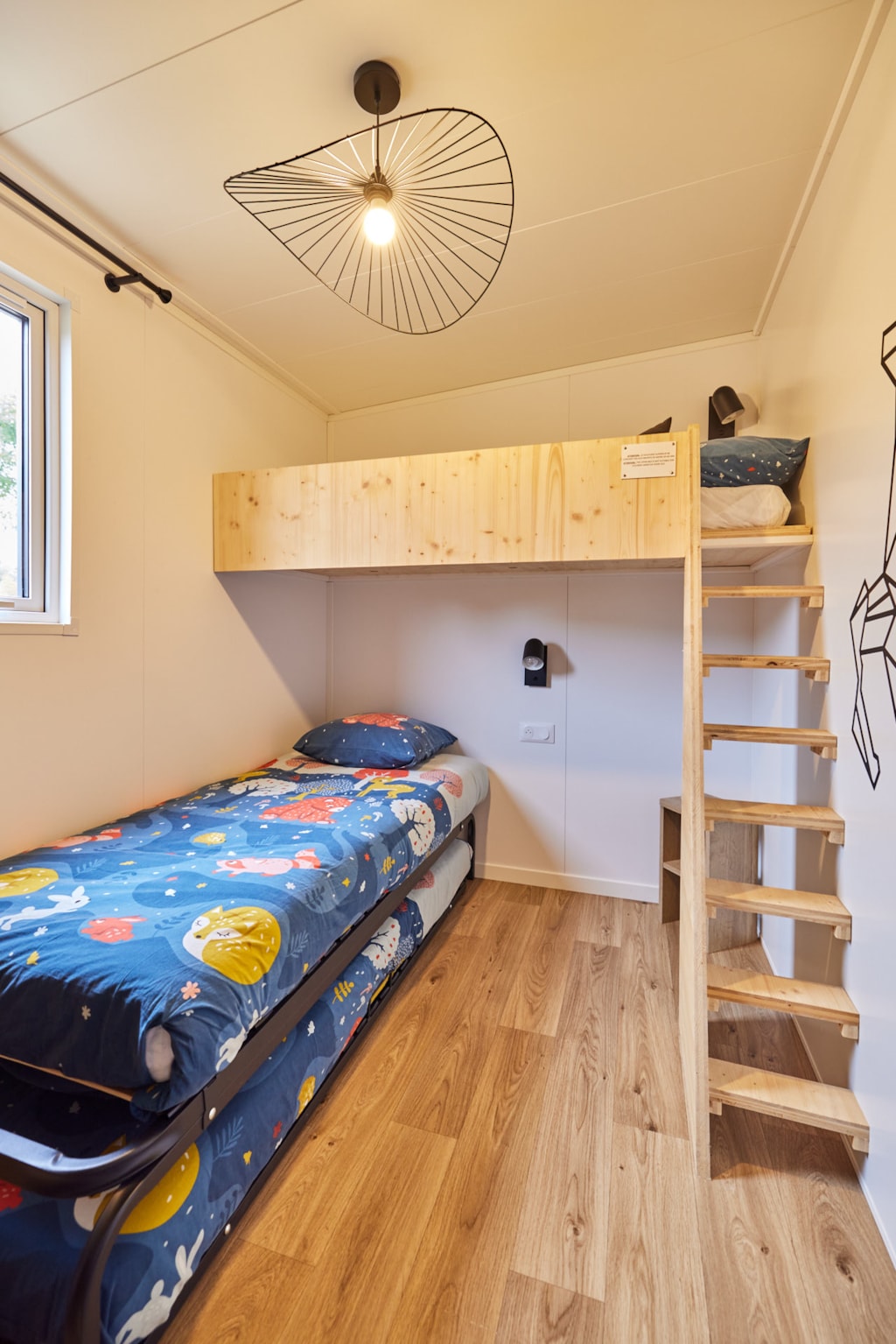 This sublime 35m² Cabane Côté Nature with Spa is spacious and modern, with a master bedroom overlooking the Spa, a second bedroom with a single bed, 1 cross bed and a trundle bed, a fully-equipped kitchen with dishwasher, a double washbasin bathroom and separate WC. You will love the 35m² covered and enclosed terrace, which is open via the entrance door, the shutters and the skylight that lights up the interior vegetation. It is equipped with a griddle, garden furniture, an outdoor table, a mini bar, a bench with a coffee table, sun loungers and, above all, a private 5-seater spa for relaxing after a long day!