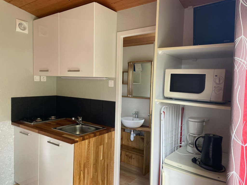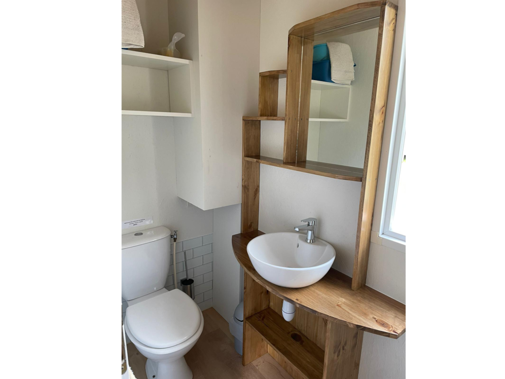 NEW - Are you looking for a vacation closer to nature, but with a little something extra? How about a pitch with private sanitary facilities? On your freecamp pitch you have access to a kitchen area, large open and covered spaces with its guinguette side. It is also plenty of storage, a wooden table, as well as a private bathroom. Your holidays take on a new dimension with the Freecamp, you won't be able to do without it! Located on your 200m² plot, this new generation cabin is equipped with large open and covered spaces on the outside, a kitchen area with fridge, microwave, gas hob with 2 burners and a large table in wood, a private bathroom with shower and sink and a separate toilet. Connected to water and electricity, it will be ideal for your stay in a tent, caravan or motorhome. It will add originality, intimacy, comfort and memorable memories to your stay. To try it is to adopt it ! In the current context, this new package is very valuable to make the most of your stay on a bare pitch in complete health safety!