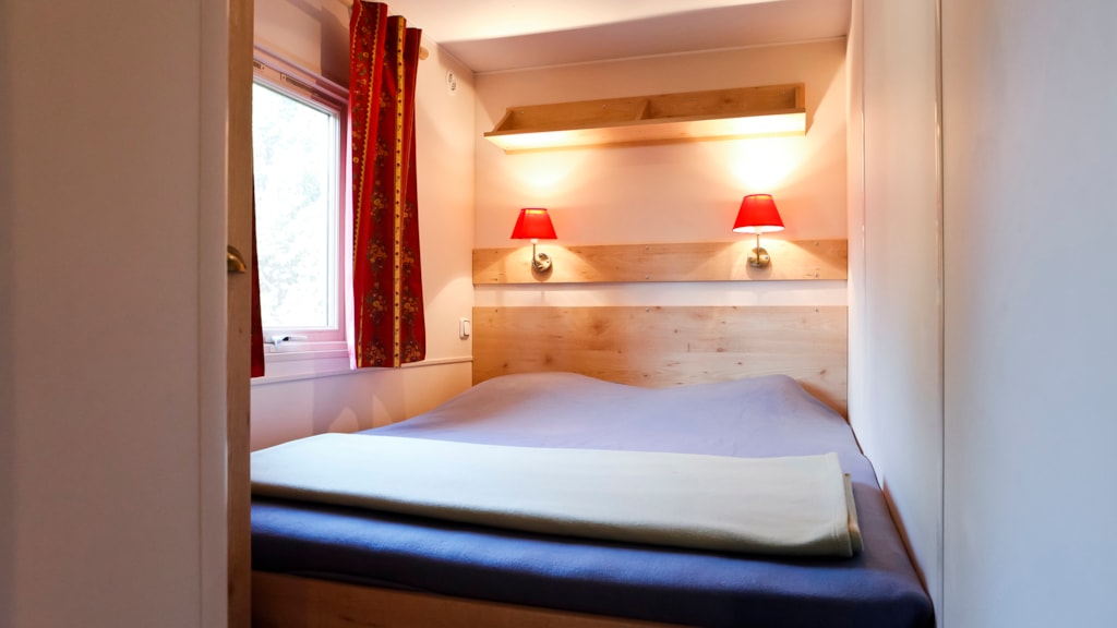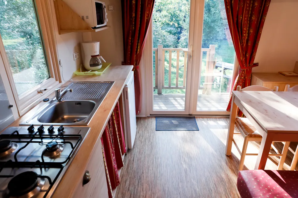 Für 5 Personen -25 m² Wohnfläche Ein Tuch unter den Sternen… Absoluter Komfort!Wohnbereich mit Küchenecke (zweiflammiger Gaskocher, Kühlschrank, Abflageflächen, Spüle, Geschirr) und Essecke mit Tisch und Stühlen. Einige Modelle verfügen sogar über einen Holzofen.*Badezimmer mit Dusche, Waschbecken und WC.Schlafbereich: Elternschlafecke mit Doppelbett (140 × 200 cm) und Kinderschlafecke mit einem Doppelbett (140 x 190 cm) mit einem Hochbett (90 x 190 cm).Außenbereich: Holzterrasse, Sonnenschirm, 2 Faltstühle
