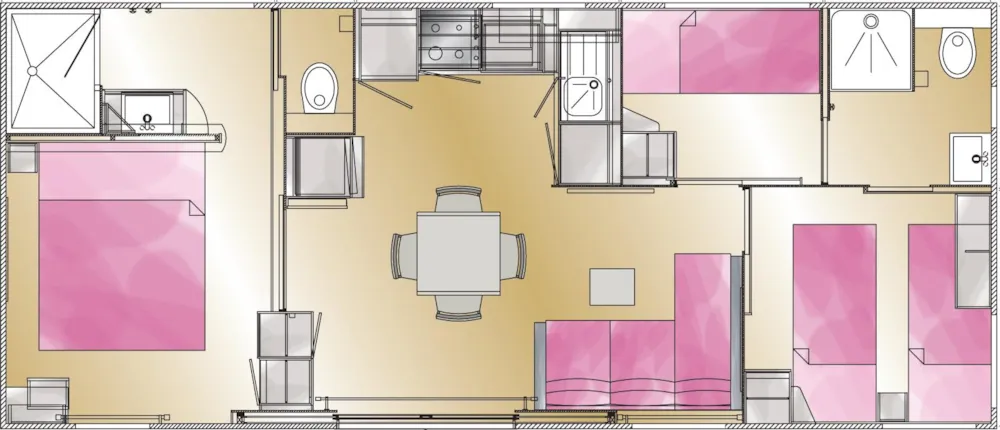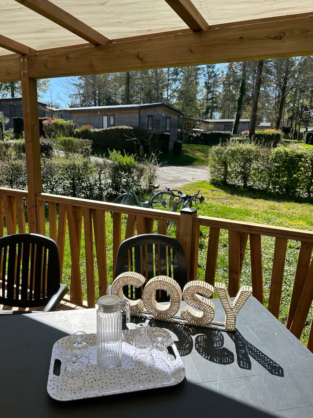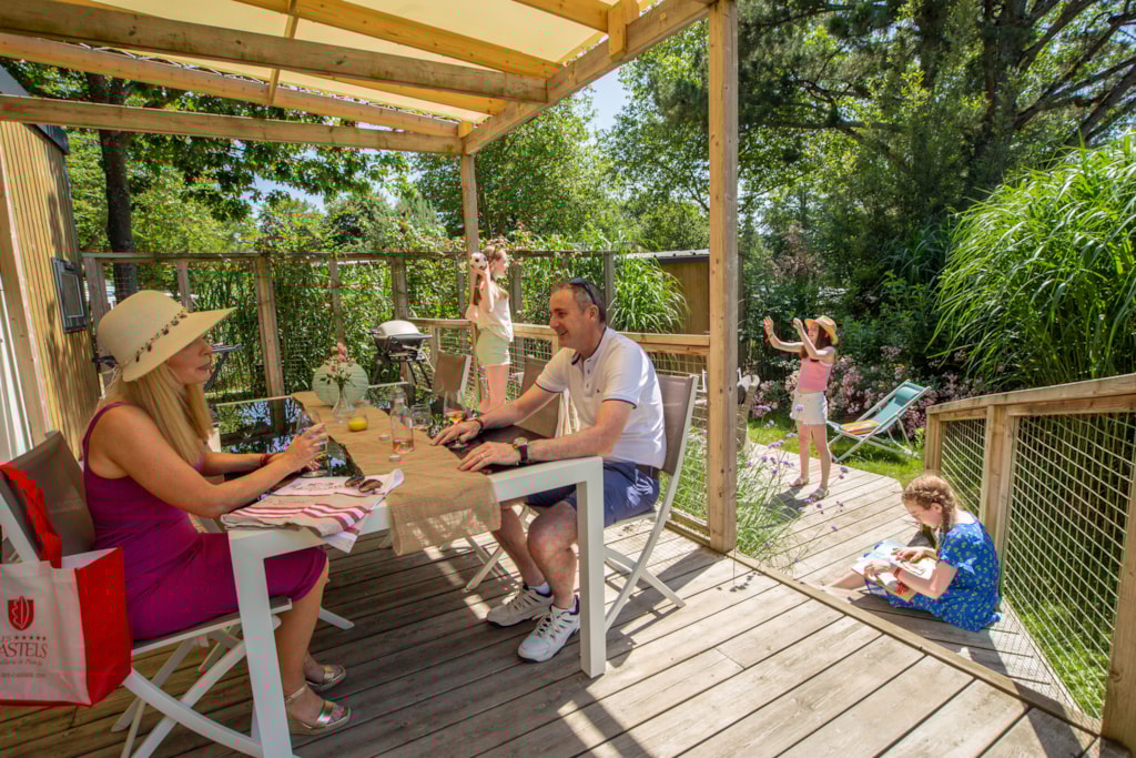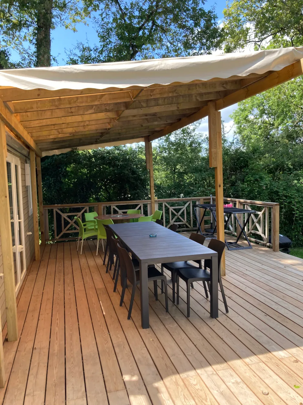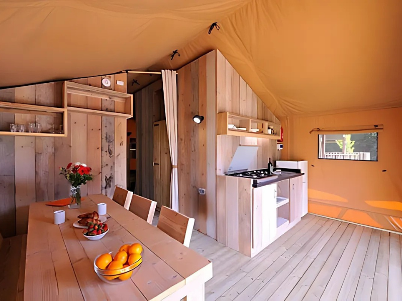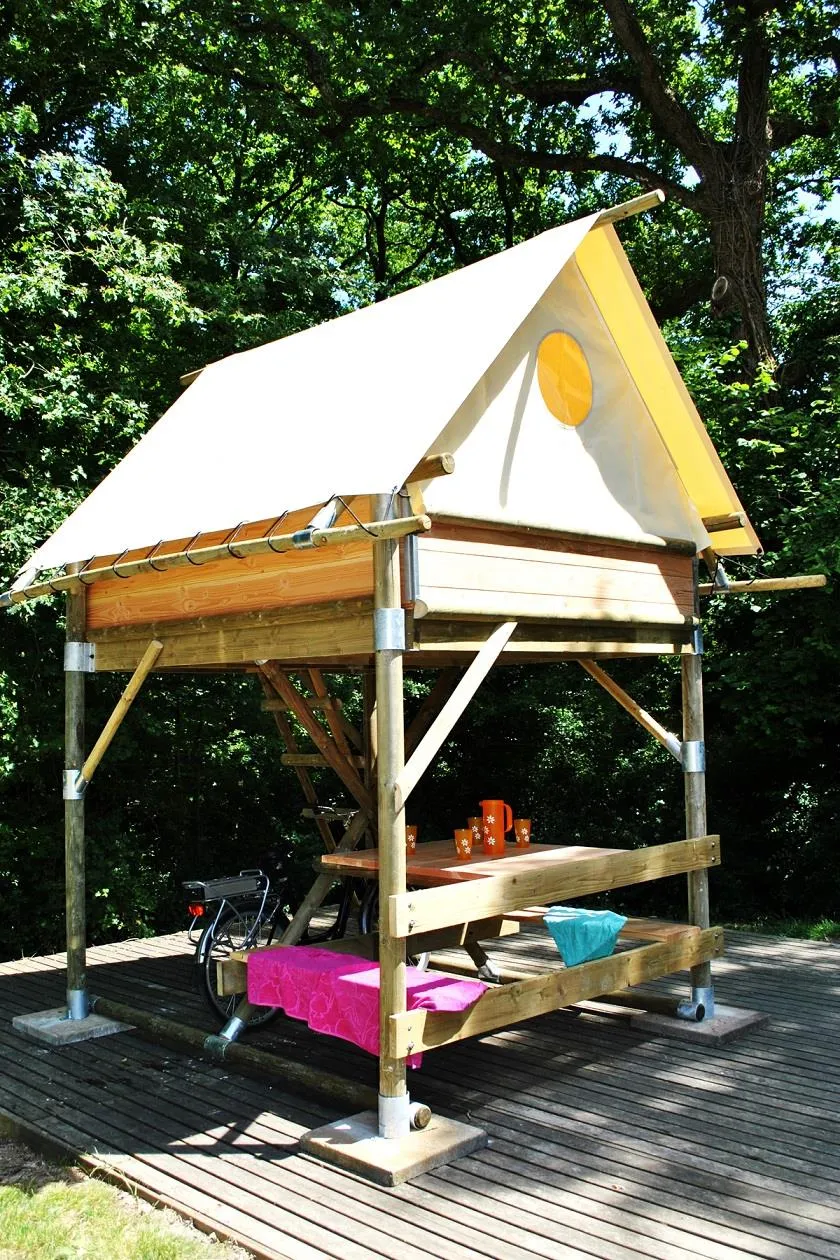 Im Erdgeschoss gibt es ein Picknick-Tisch mit Bänken, unter dem Schutz des Zeltes.