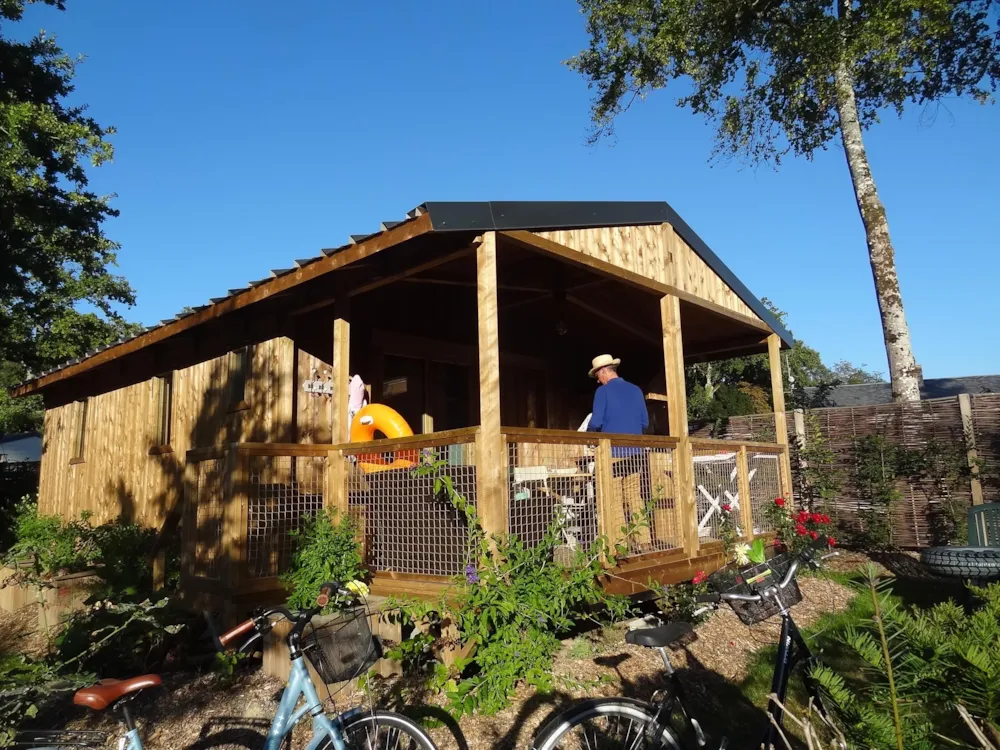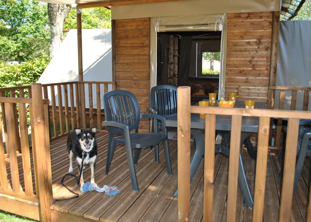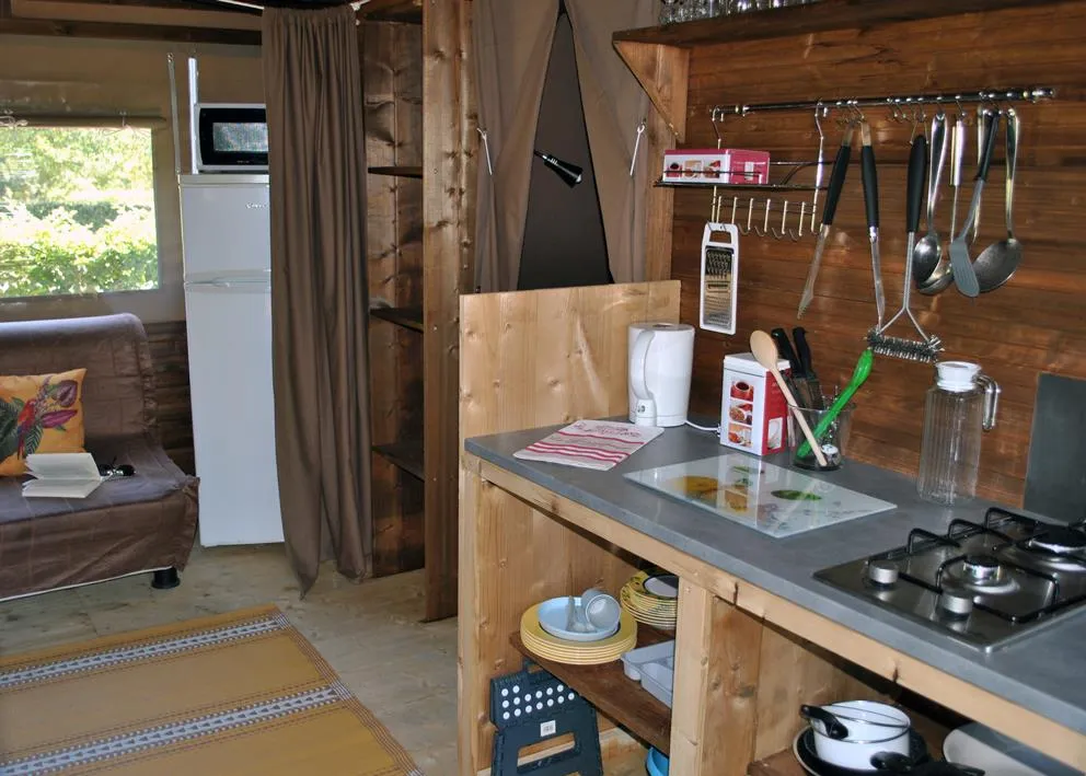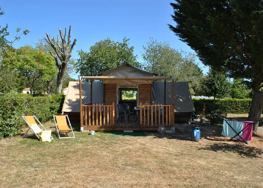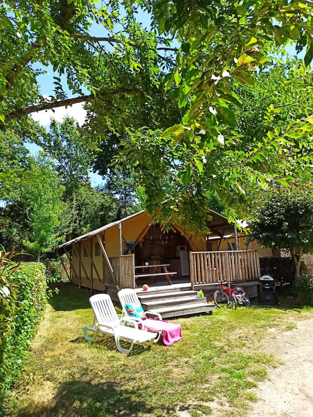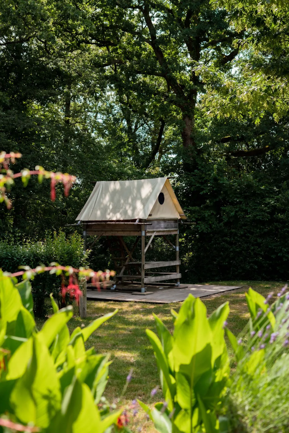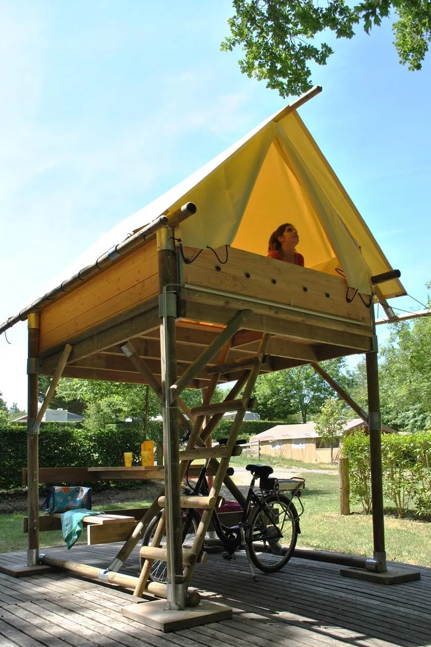 Das Biwak, geeignet für ein oder zwei Personen, ein Zelt von schweren Leinwand und auf hölzernen Stelzen. Stellplatz mit Schattigen.