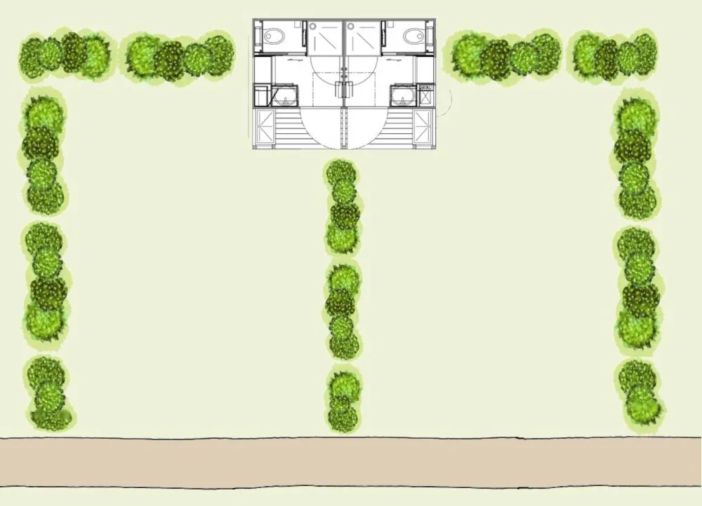Schattiger Stellplatz von 150 m², begrenzt durch Hecken von Büschen.