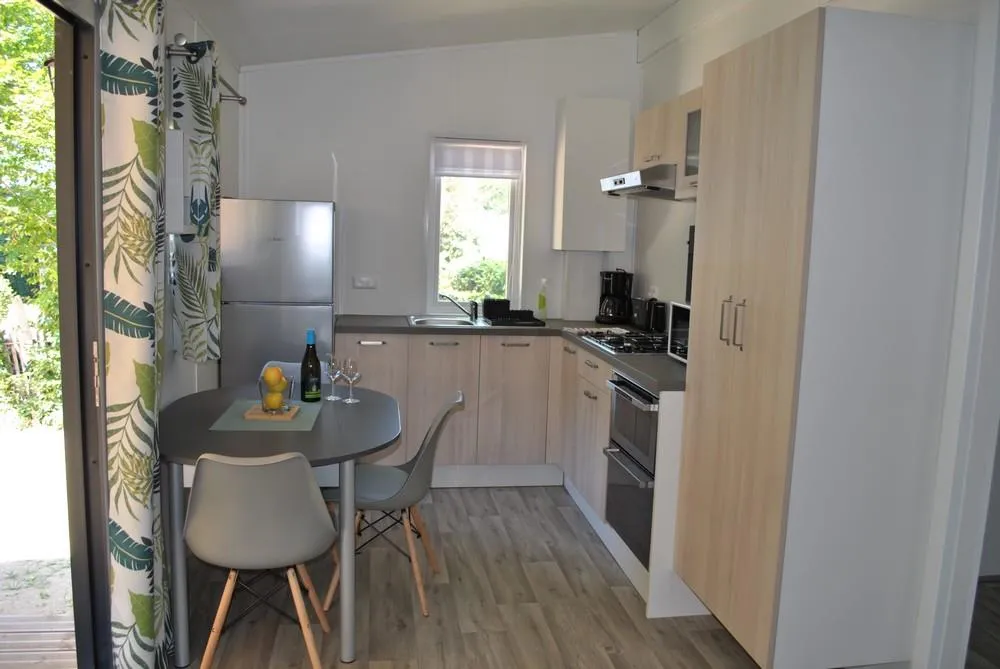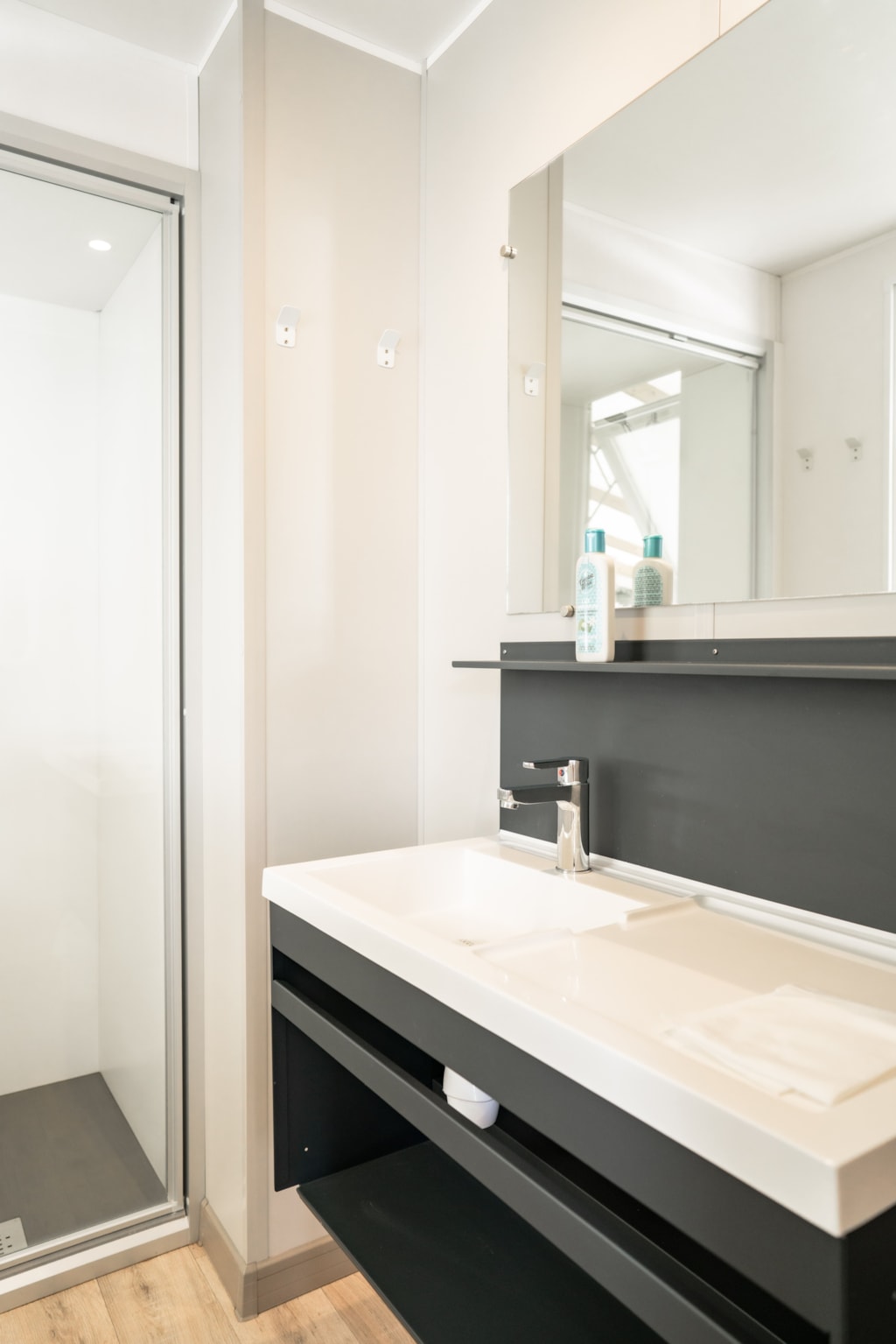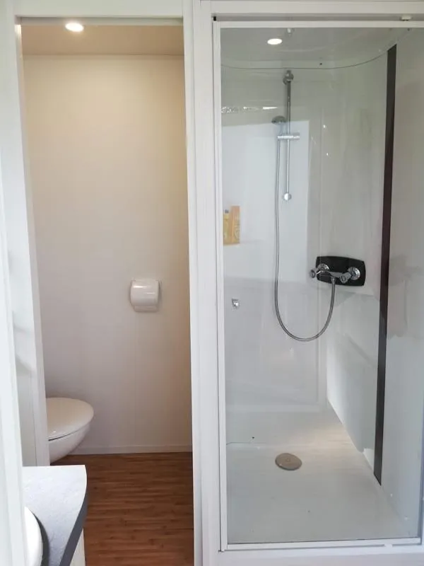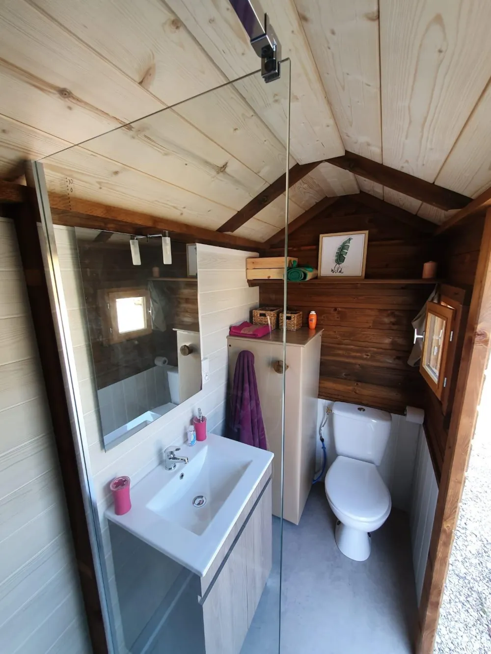 Private Sanitäranglage: WC, Dusche, Waschbecken; Spülbecken und Kühlschranke 45L auf der Terrasse.