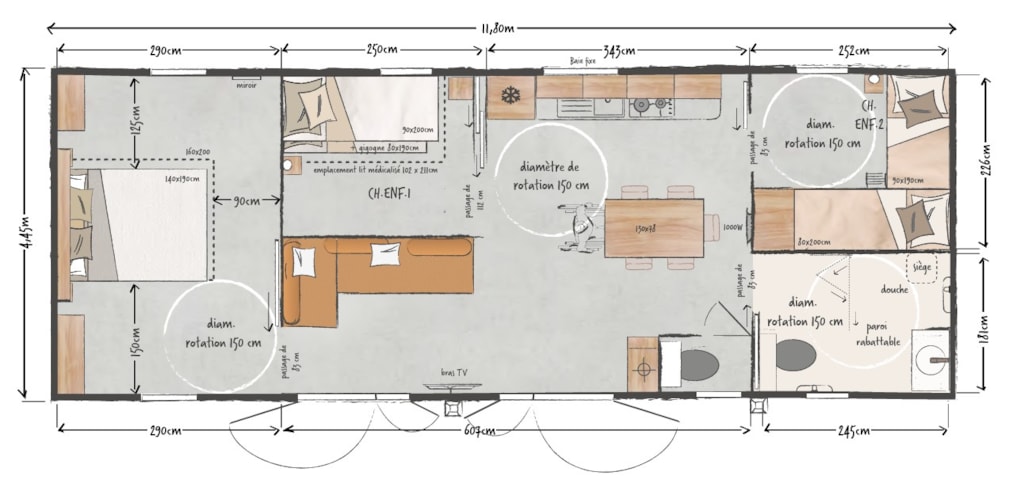 With a surface area ranging from 130m² to 179m², they are suitable for tent, caravans or motor-homes up to 7 meters.