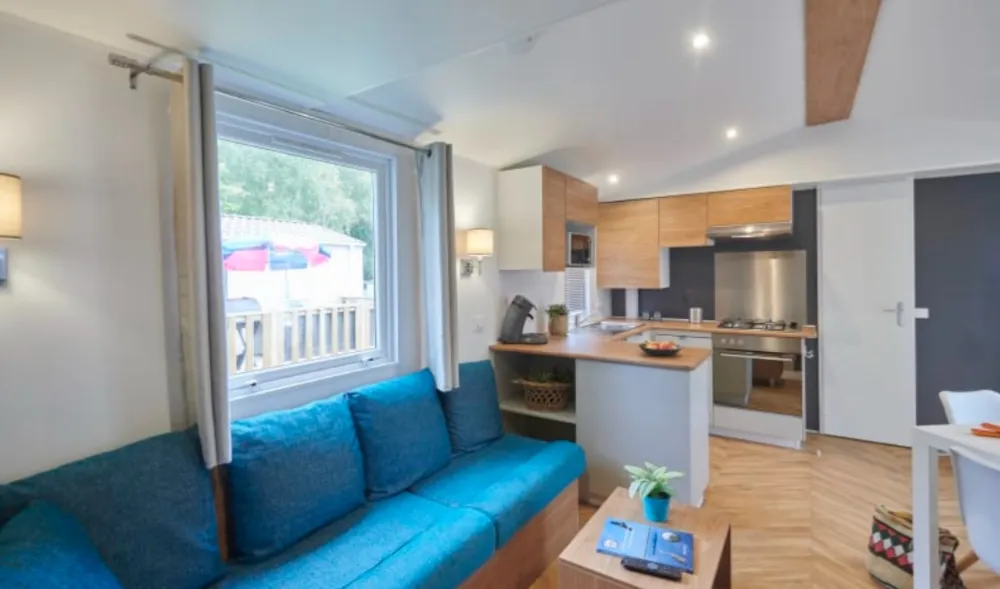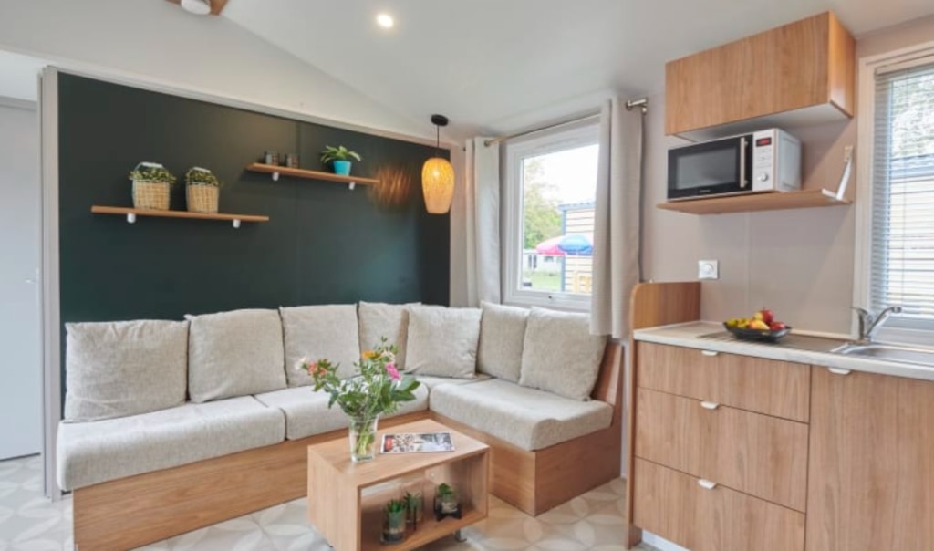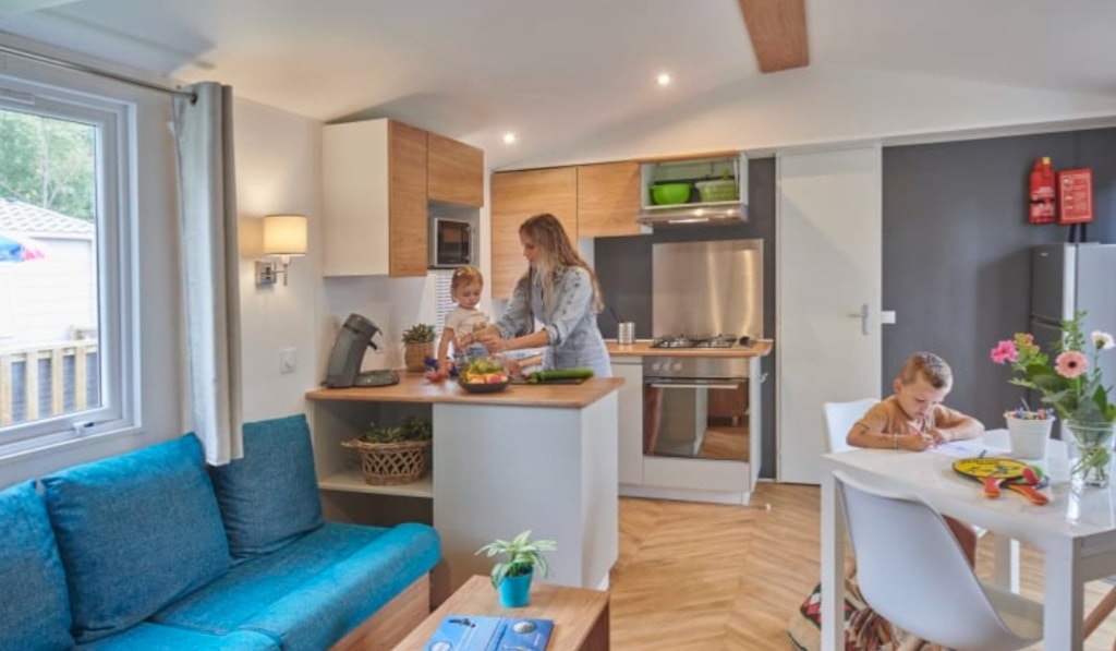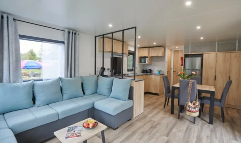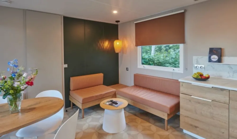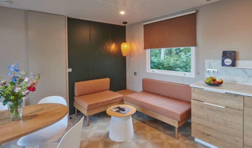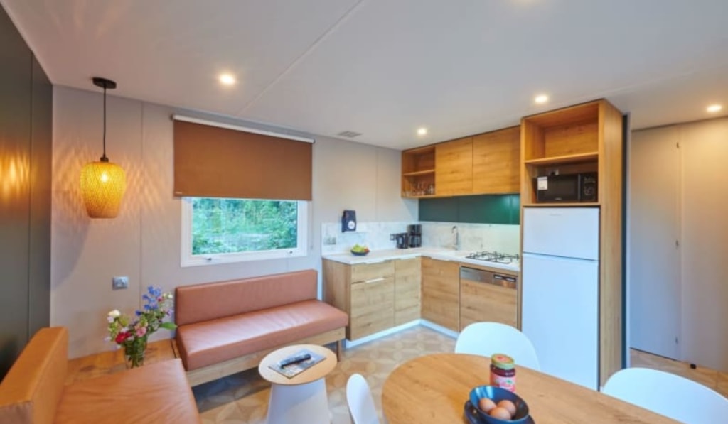 Das geräumige Zelt ist komplett möbliert und ausgestattet mit einem Sitz- und Essbereich, Schlafzimmern mit bequemen Betten, einer voll ausgestatteten Küche und einem Badezimmer mit Dusche und Toilette. Darüber hinaus hat dieses Glamping-Zelt eine schöne Veranda.