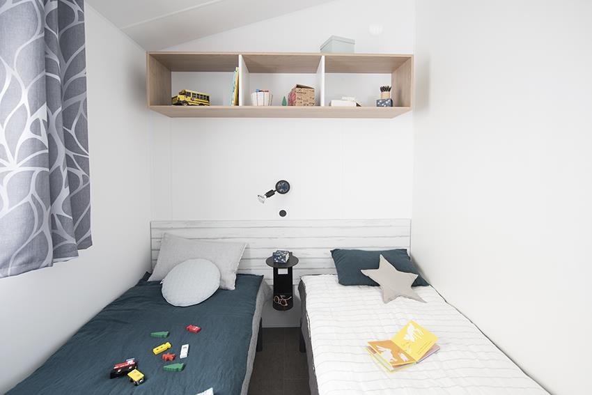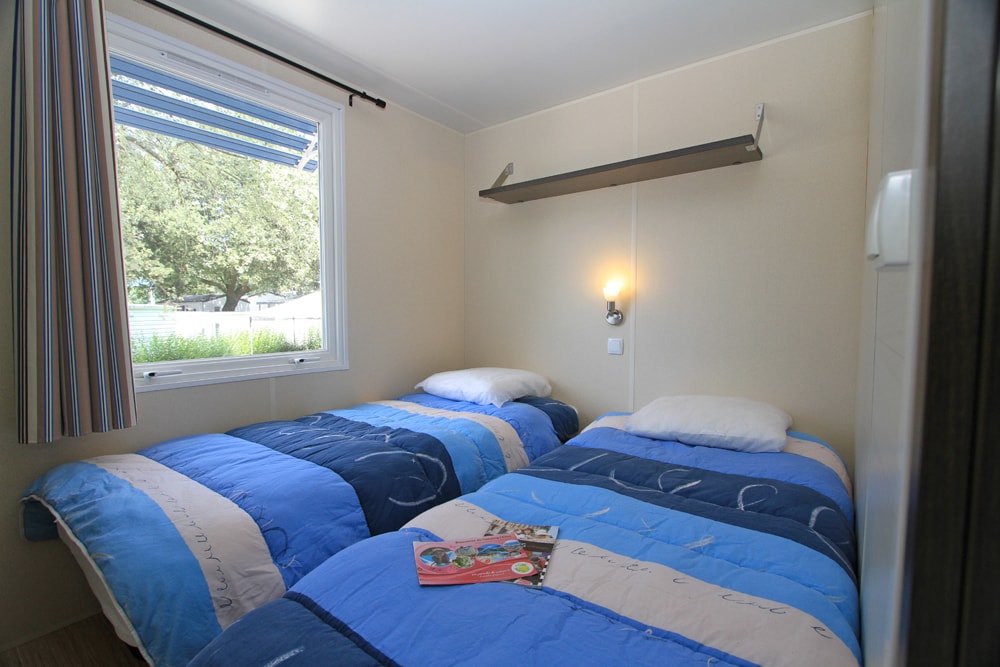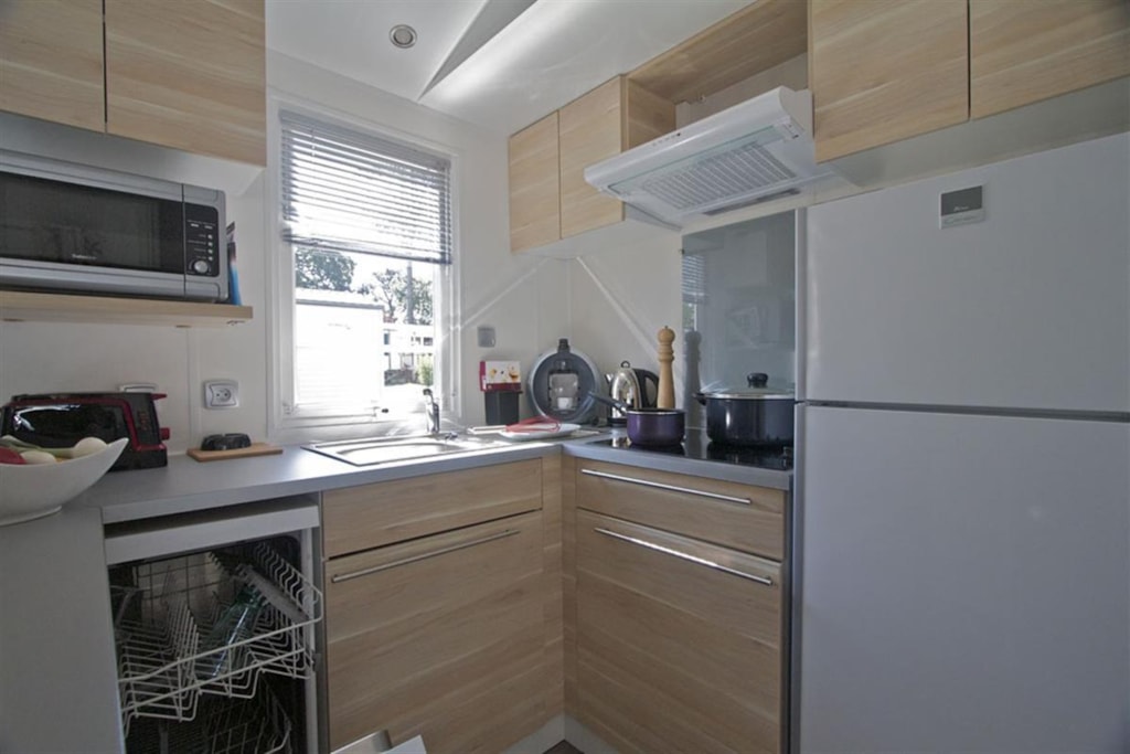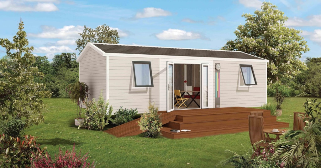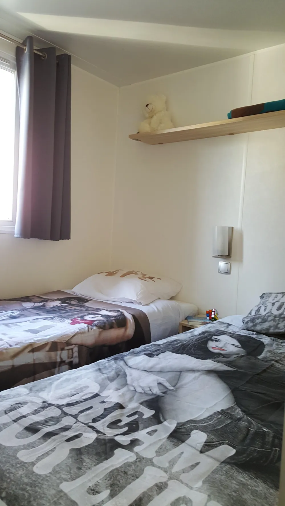 Mobil-home "Eco" between 8 and 12 years old 1 double bed 140 cm, 2 separate beds (80 cm x 2), kitchen, 1 fridge-freezer, microwave, 1 table, 2 chairs, 1 sofa, television, bathroom and separate WC, garden furniture, heating in each room.