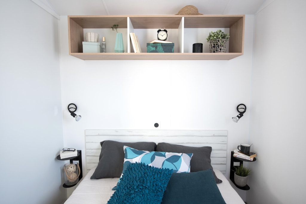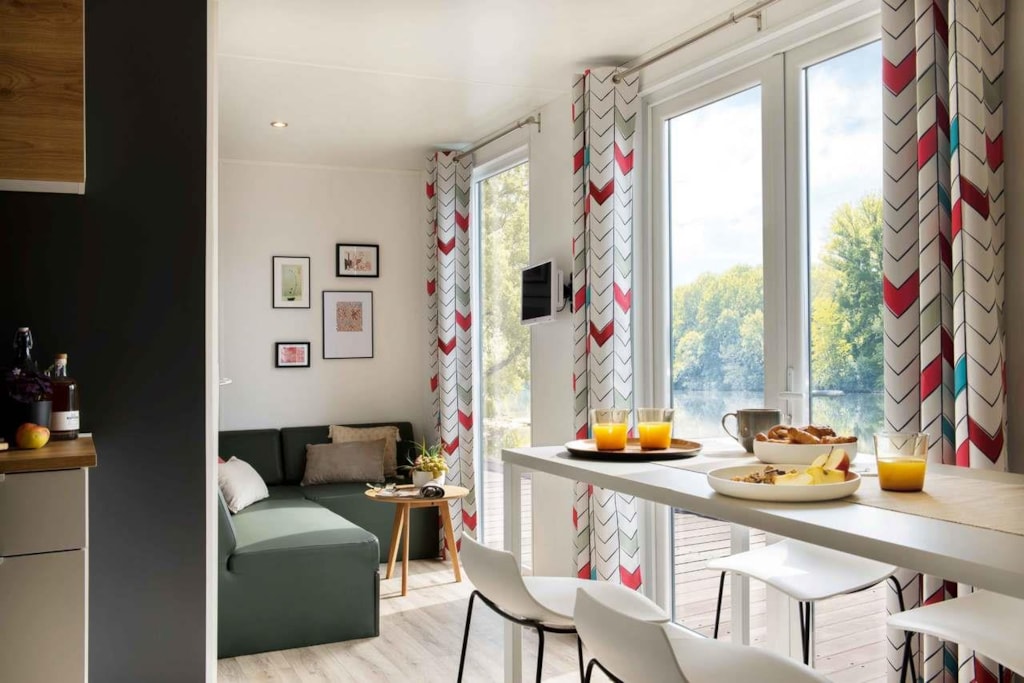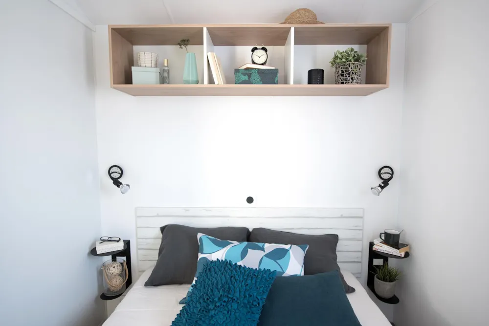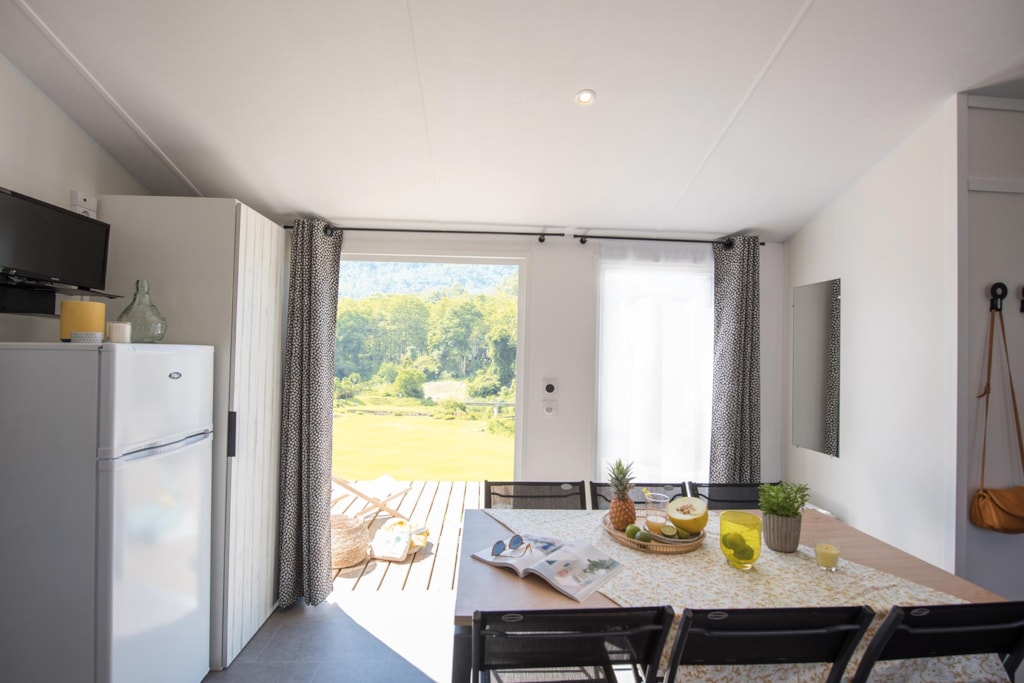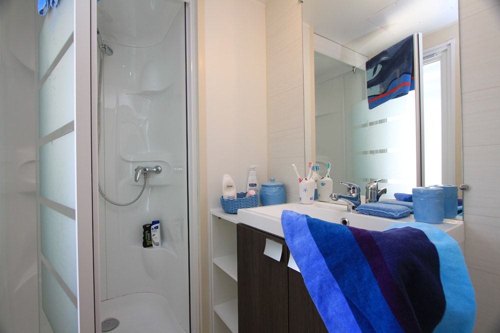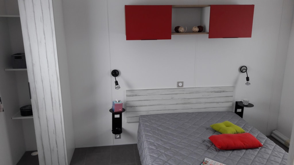 Mobil-home "Eco" between 8 and 12 years old 1 double bed 140 cm, 2 separate beds (80 cm x 2), kitchen, 1 fridge-freezer, microwave, 1 table, 2 chairs, 1 sofa, television, bathroom and separate WC, garden furniture, heating in each room.