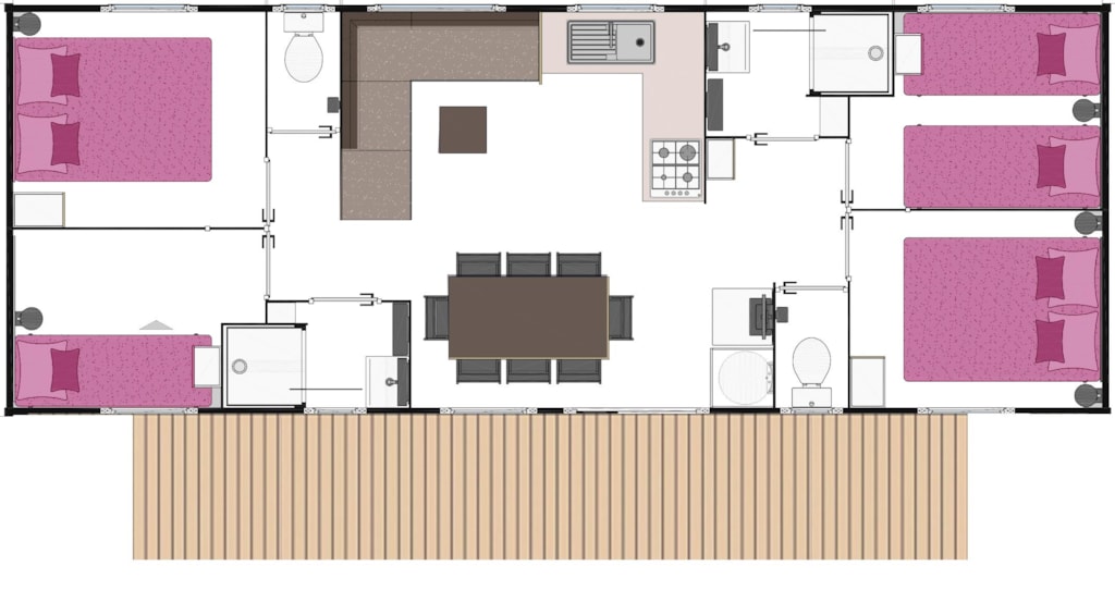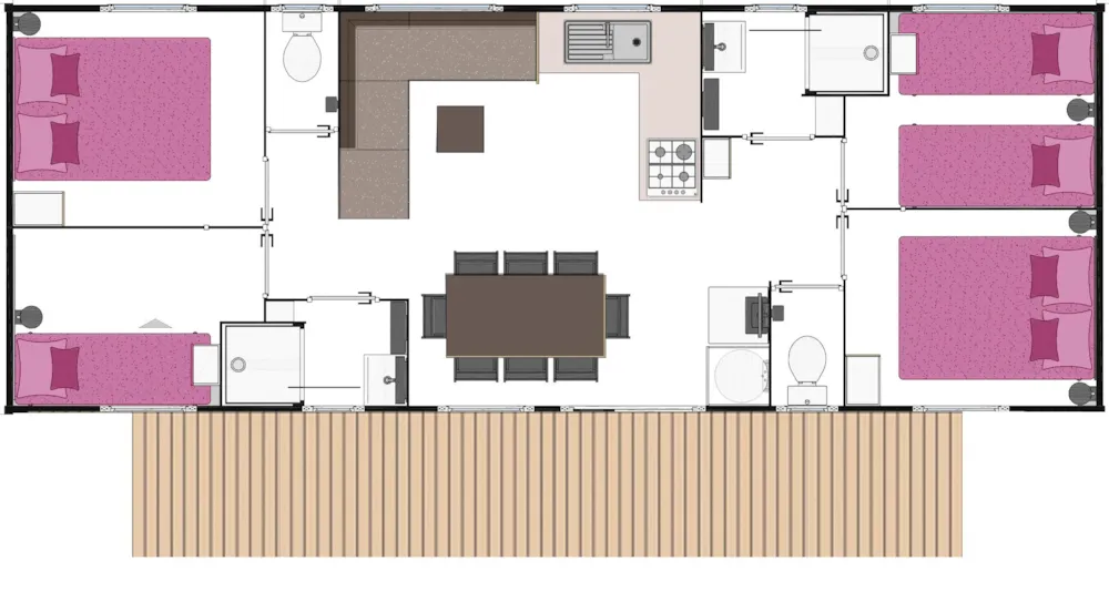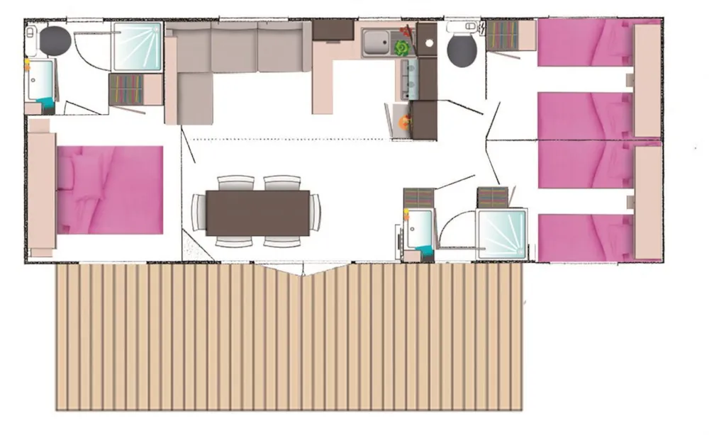 Mobile home suitable for people with reduced mobility, 1 double bed 140 cm, 2 separate beds (80 cm x 2), kitchen, 1 fridge-freezer, 1 microwave, 1 table, 2 chairs, 1 sofa, television, bathroom and separate WC, garden furniture, heating in each room.