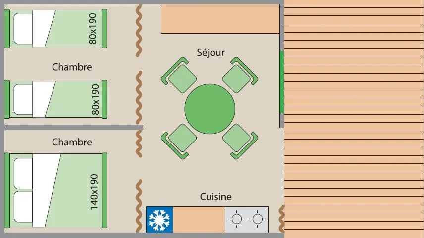 1 bedroom with 1 140cm bed, 1 bedroom with 2 80cm beds, living room / kitchen area with 1 table + 4 chairs, top fridge and hob.