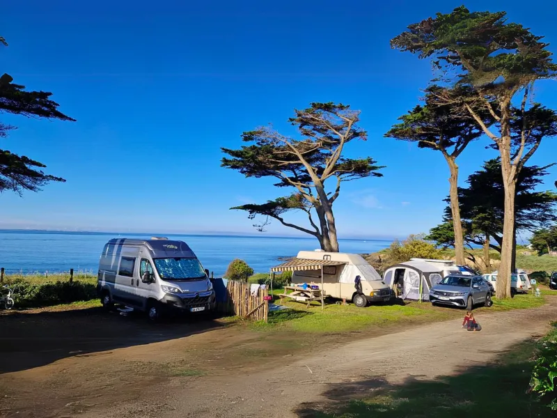 Auf den Stellplätzen am Meer (Erste 3 Zeilen) können Sie alle Ihre Mahlzeiten mit Blick auf das Meer einnehmen, den Sonnenaufgang und -untergang und die Boote am Horizont bewundern... Alle Stellplätze sind durch Hecken oder Absperrungen abgegrenzt und mit Stromanschluss ausgestattet. Ihre Fläche von 80 bis 110 m2 bietet Platz für ein Zelt, einen Wohnwagen oder ein Wohnmobil. Einige sind bewaldet, andere sonniger.