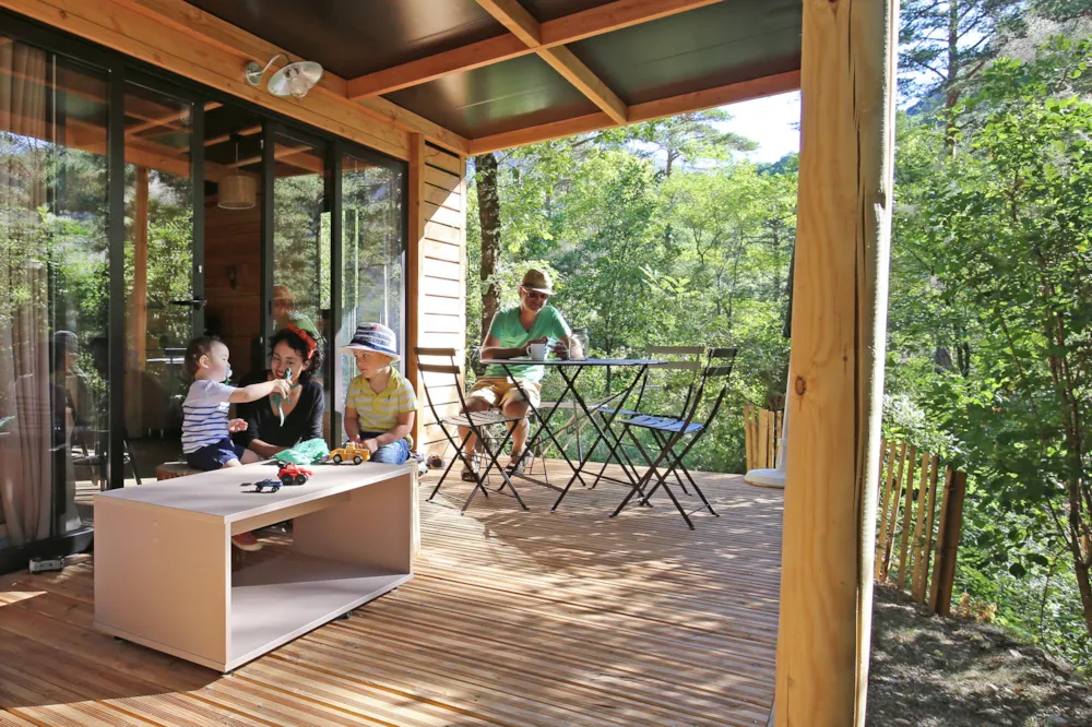 Sein großes Wohnzimmer mit Schiebefenstern und ausgestatteter Küche (Spüle, Kühlschrank, Mikrowelle...) bietet Ihnen einen Lebensraum innen/außen, der die Abgeschiedenheit und den Kontakt mit der Natur fördert.