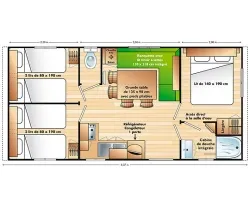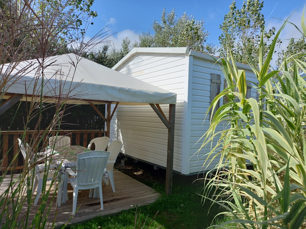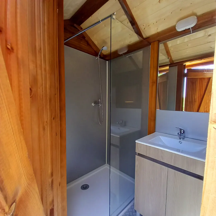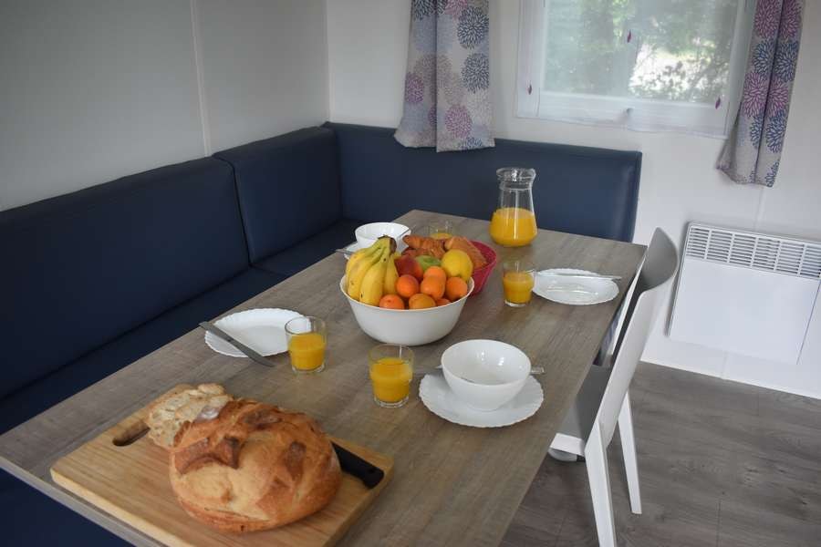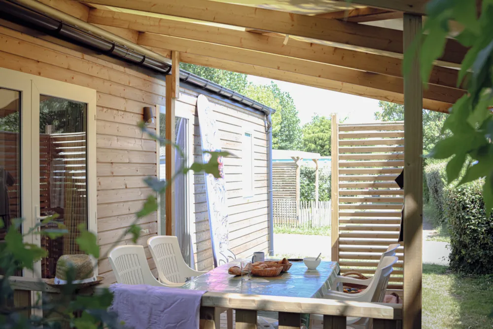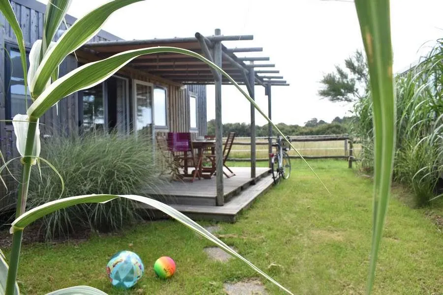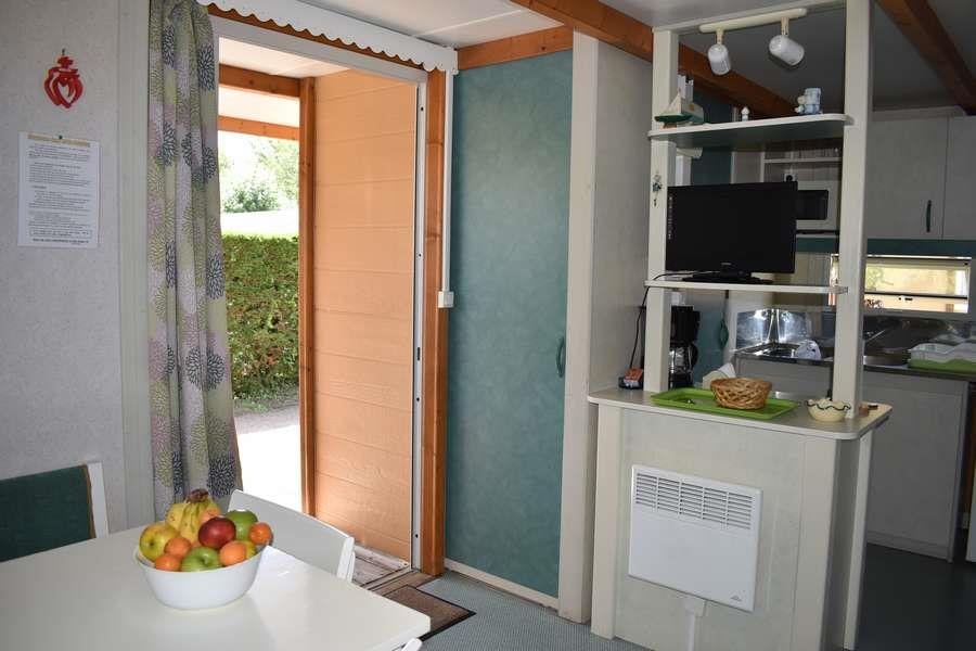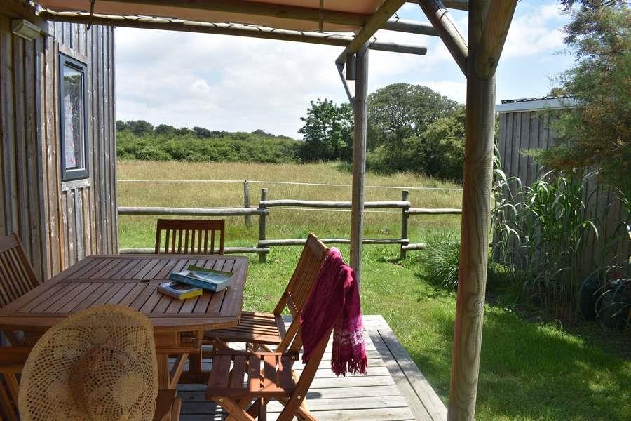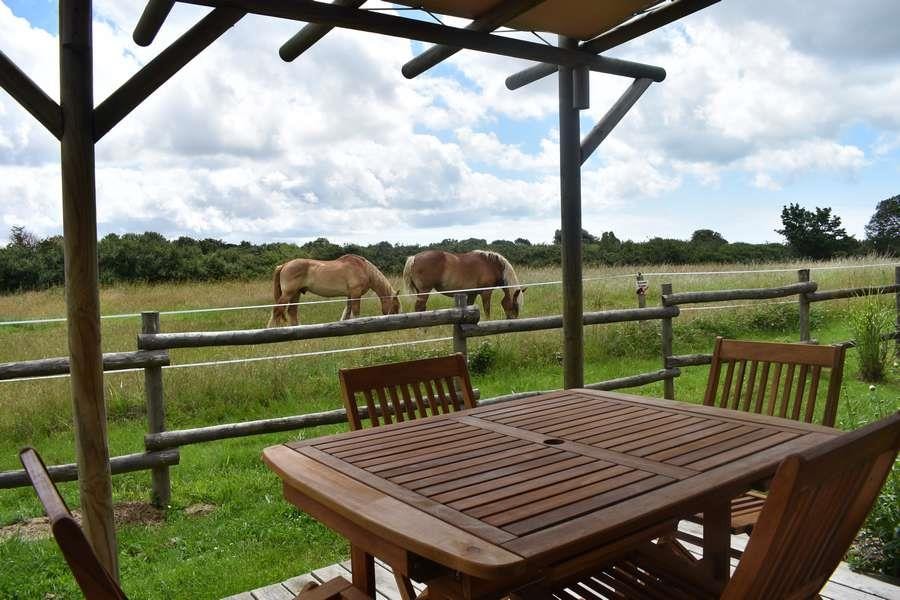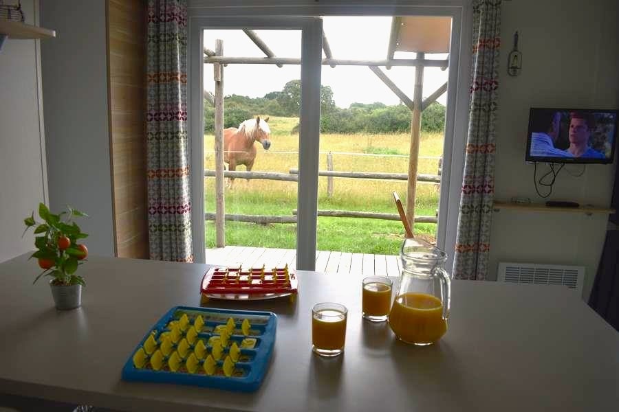 1 bedroom with 1 double bed (140 x 190), wardrobe, duvet, blanket and pillows. 2 bedrooms with 2 single beds (80 x 190) one of which a truckle bed, wardrobe, duvets, blankets and pillows. 1 equipped kitchen (dishwasher, 4 burner stove top, cooker hood, refrigerator/freezer, micro wave oven, electric Tassimo coffee maker, toaster, dishware and cupboards). 1 living area with sofa, television and heating. 1 bathroom with shower, sink, hair dryer, and heating. Separate toilet. Garden furniture + 2 sun loungers on covered wooden terrace. Bed linen and bathroom towels included (1 kit per bed/person and per stay) for a change during the stay, a supplement will be charged. Baby kit available upon request. Wi-Fi connection included. The pluses in the Premiums: located in the Premium sector with view of the meadow and our animals, dishwasher, bed linen and bathroom towels, illimited Wi-Fi, heating in the bathroom, baby kit, toaster, hair dryer, sun loungers.