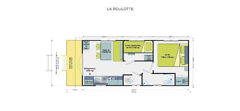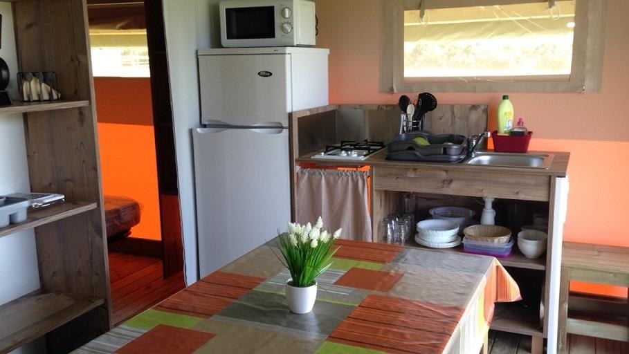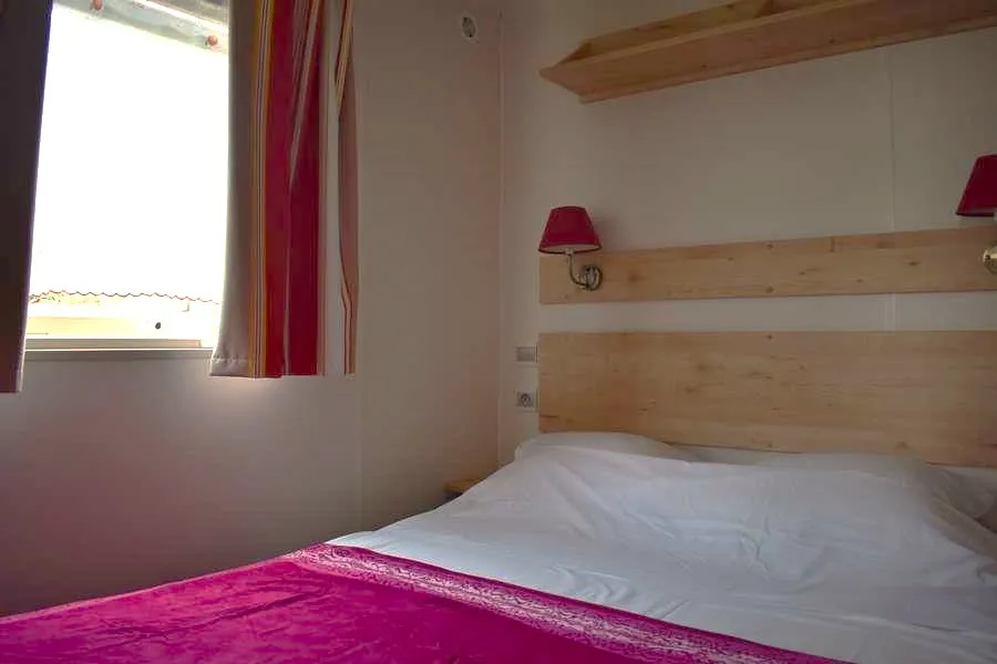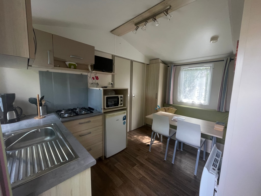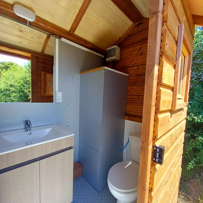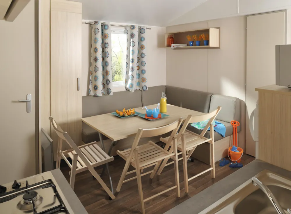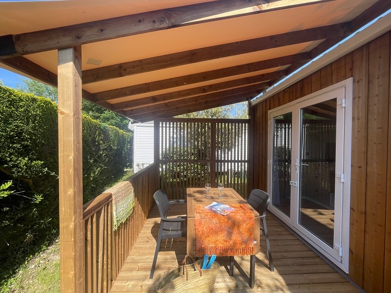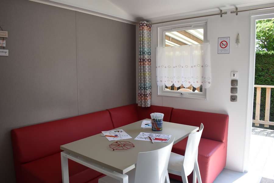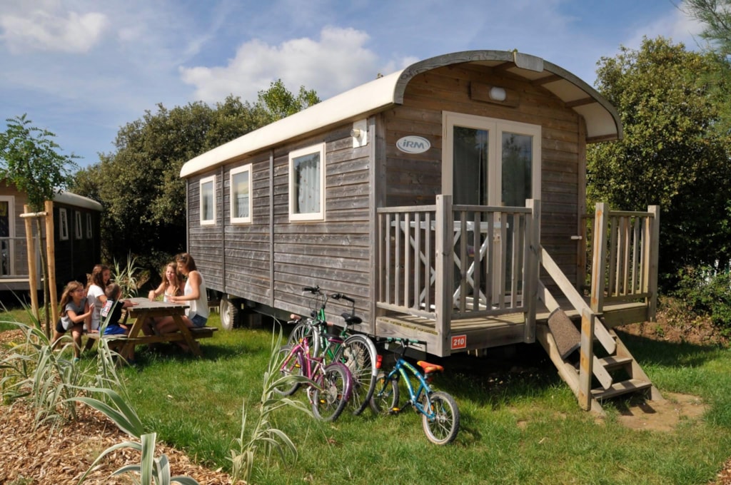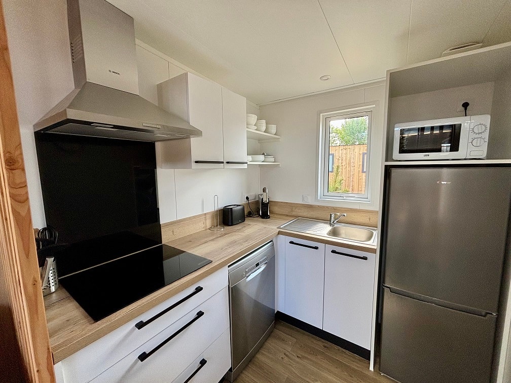 1 bedroom with 1 double bed (140 x 190), wardrobe, duvet, blanket and pillows. 2 bedrooms with 2 single beds (80 x 190) one of which a truckle bed, wardrobe, duvets, blankets and pillows. 1 equipped kitchen (dishwasher, 4 burner stove top, cooker hood, refrigerator/freezer, micro wave oven, electric Tassimo coffee maker, toaster, dishware and cupboards). 1 living area with sofa, television and heating. 1 bathroom with shower, sink, hair dryer, and heating. Separate toilet. Garden furniture + 2 sun loungers on covered wooden terrace. Bed linen and bathroom towels included (1 kit per bed/person and per stay) for a change during the stay, a supplement will be charged. Baby kit available upon request. Wi-Fi connection included. The pluses in the Premiums: located in the Premium sector with view of the meadow and our animals, dishwasher, bed linen and bathroom towels, illimited Wi-Fi, heating in the bathroom, baby kit, toaster, hair dryer, sun loungers.