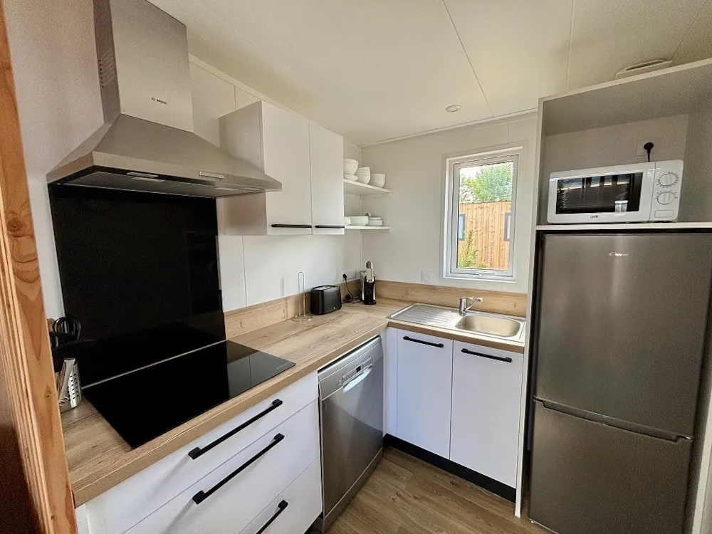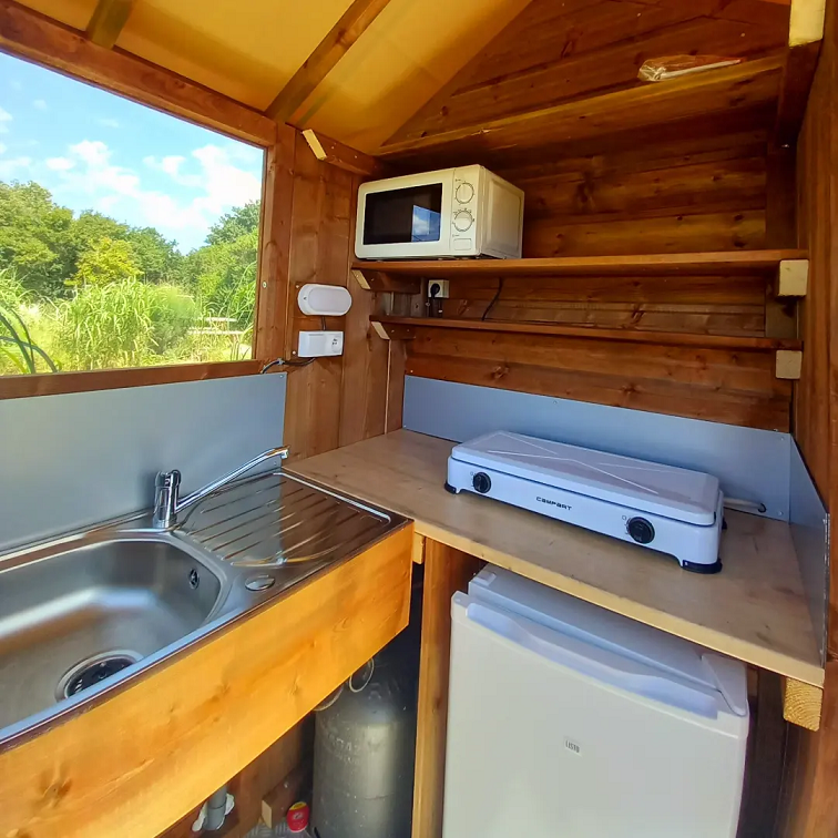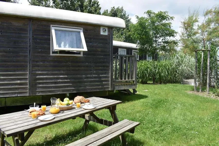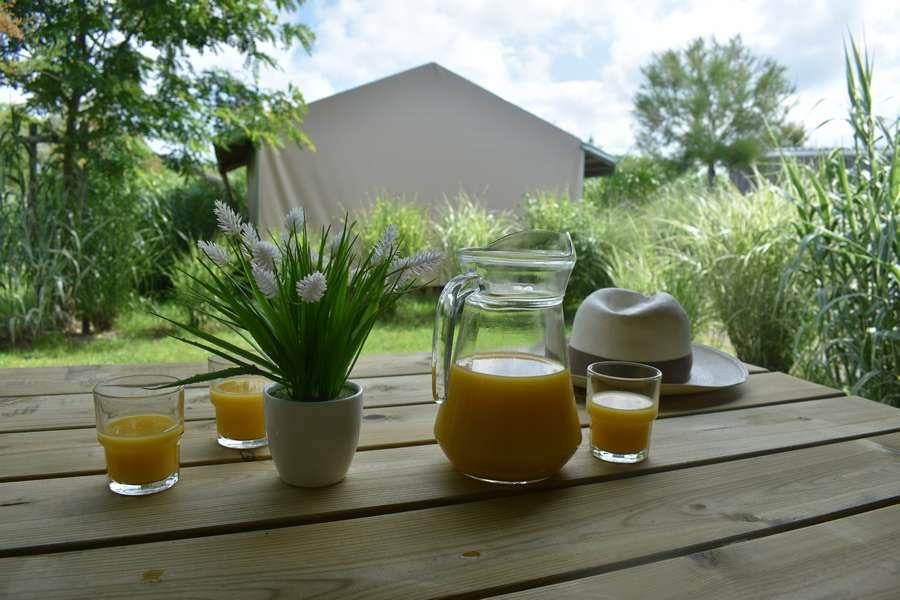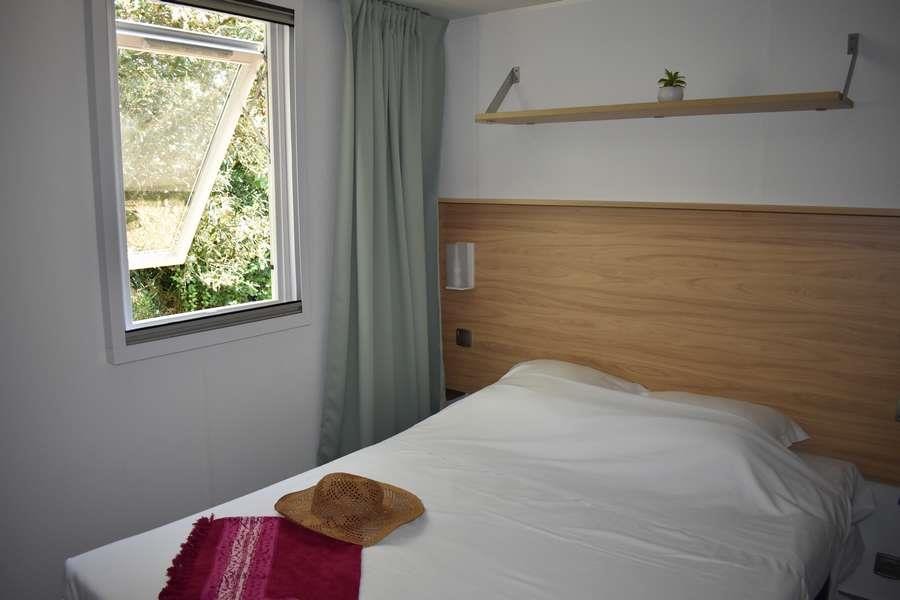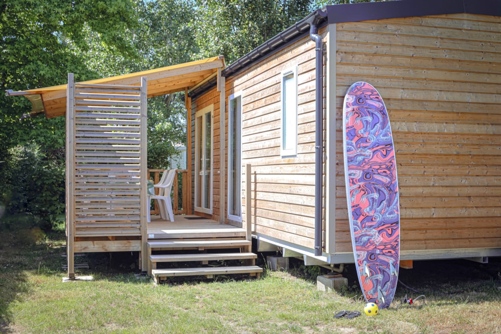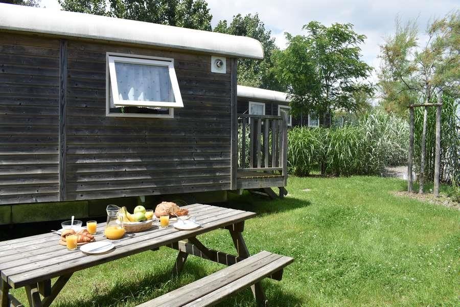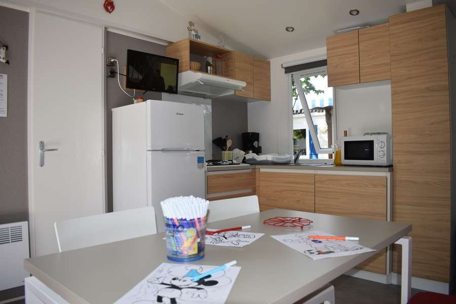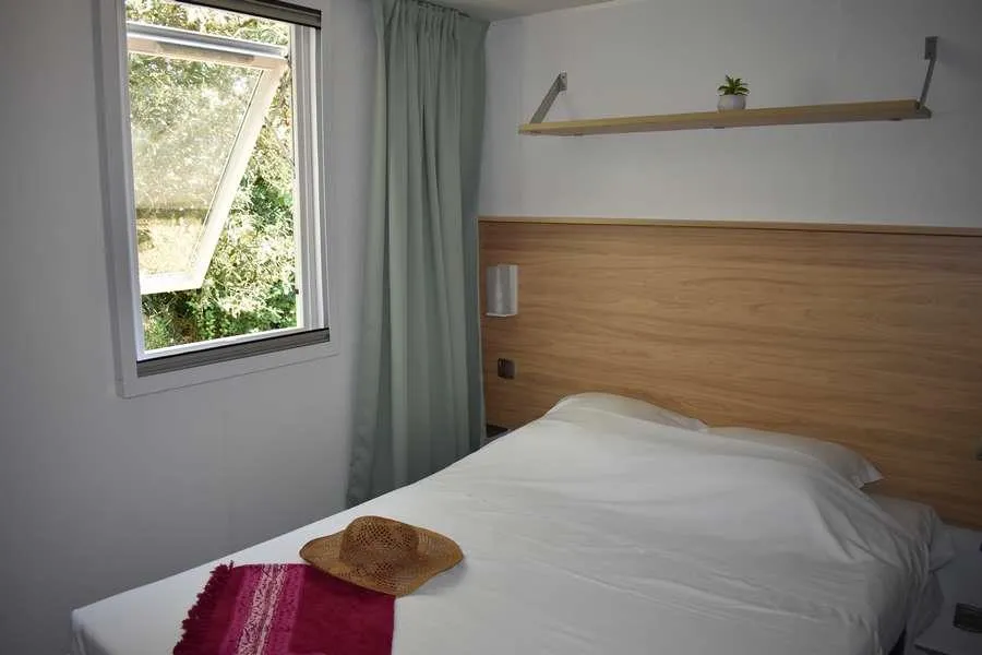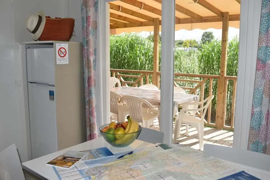 1 bedroom with 1 double bed (140 x 190), wardrobe, duvet, blanket and pillows. 2 bedrooms with 2 single beds (80 x 190) one of which a truckle bed, wardrobe, duvets, blankets and pillows. 1 equipped kitchen (dishwasher, 4 burner stove top, cooker hood, refrigerator/freezer, micro wave oven, electric Tassimo coffee maker, toaster, dishware and cupboards). 1 living area with sofa, television and heating. 1 bathroom with shower, sink, hair dryer, and heating. Separate toilet. Garden furniture + 2 sun loungers on covered wooden terrace. Bed linen and bathroom towels included (1 kit per bed/person and per stay) for a change during the stay, a supplement will be charged. Baby kit available upon request. Wi-Fi connection included. The pluses in the Premiums: located in the Premium sector with view of the meadow and our animals, dishwasher, bed linen and bathroom towels, illimited Wi-Fi, heating in the bathroom, baby kit, toaster, hair dryer, sun loungers.