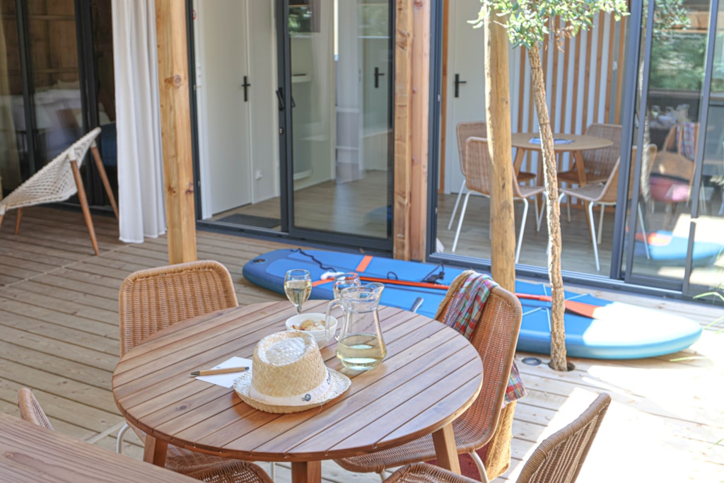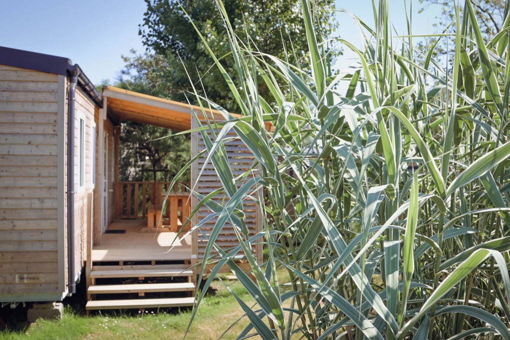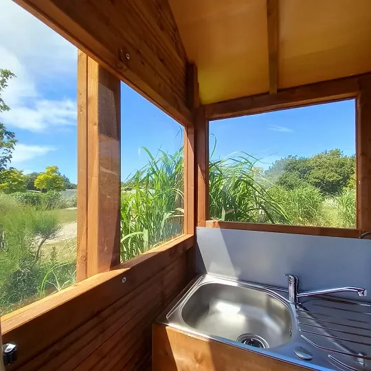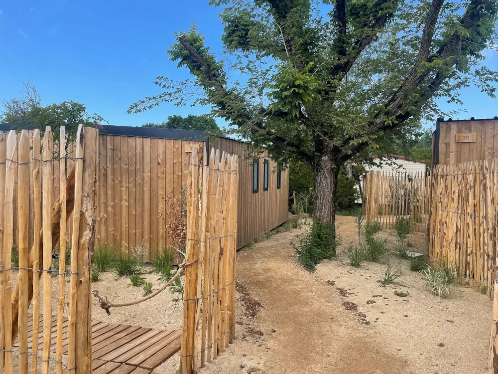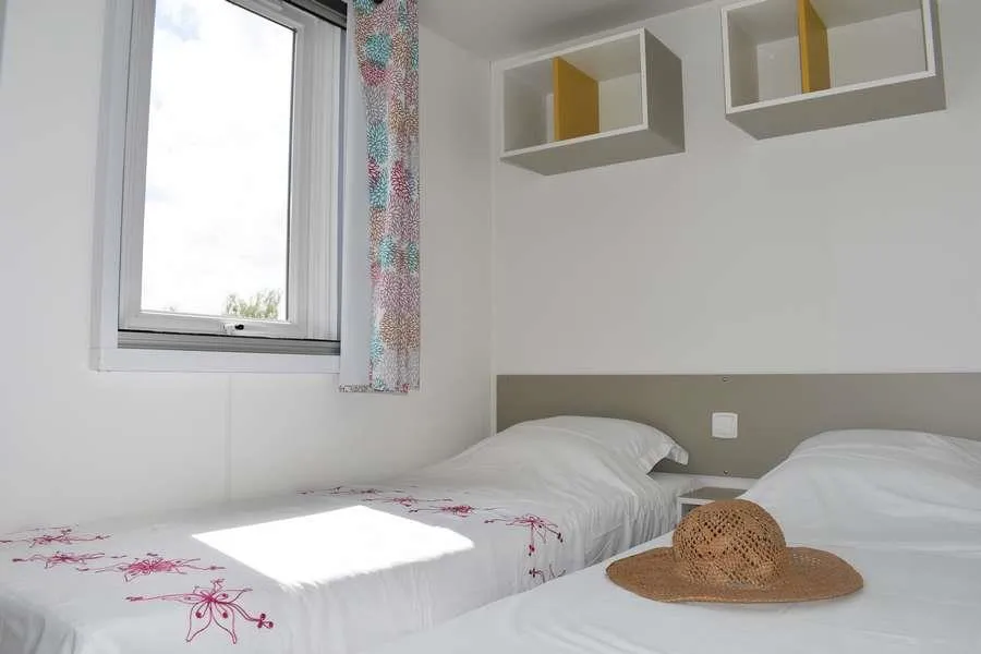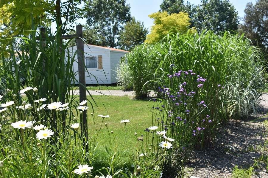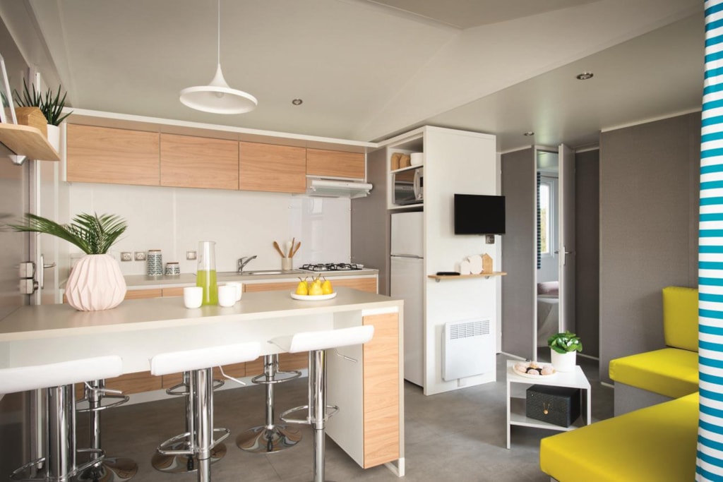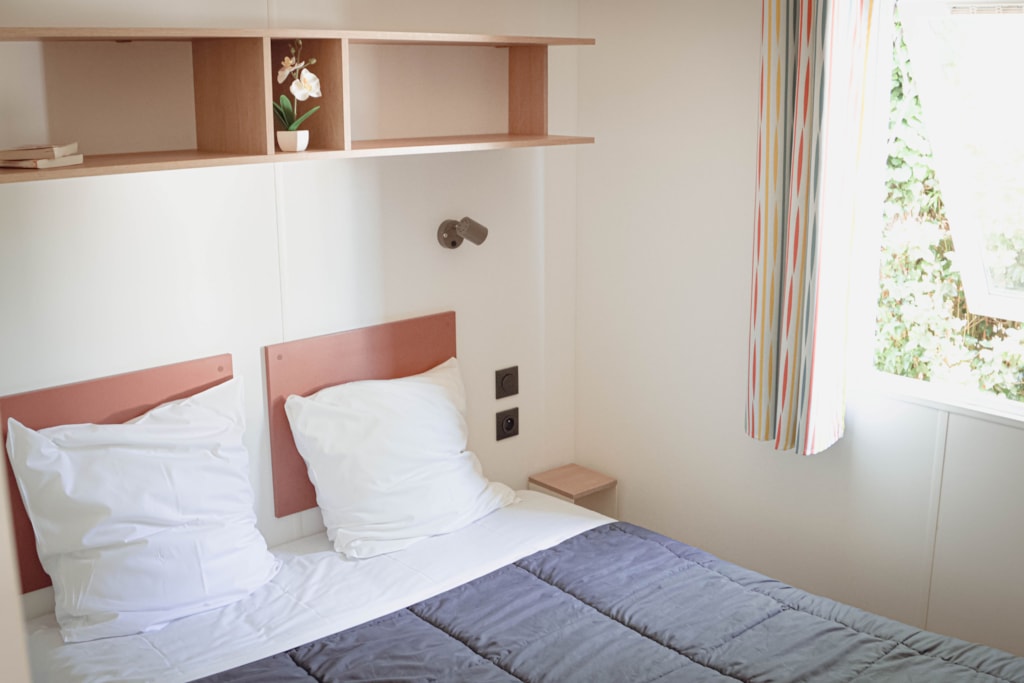 1 bedroom with 1 double bed (140 x 190), wardrobe, duvet, blanket and pillows. 2 bedrooms with 2 single beds (80 x 190) one of which a truckle bed, wardrobe, duvets, blankets and pillows. 1 equipped kitchen (dishwasher, 4 burner stove top, cooker hood, refrigerator/freezer, micro wave oven, electric Tassimo coffee maker, toaster, dishware and cupboards). 1 living area with sofa, television and heating. 1 bathroom with shower, sink, hair dryer, and heating. Separate toilet. Garden furniture + 2 sun loungers on covered wooden terrace. Bed linen and bathroom towels included (1 kit per bed/person and per stay) for a change during the stay, a supplement will be charged. Baby kit available upon request. Wi-Fi connection included. The pluses in the Premiums: located in the Premium sector with view of the meadow and our animals, dishwasher, bed linen and bathroom towels, illimited Wi-Fi, heating in the bathroom, baby kit, toaster, hair dryer, sun loungers.