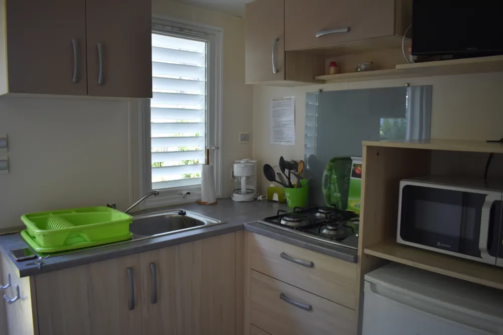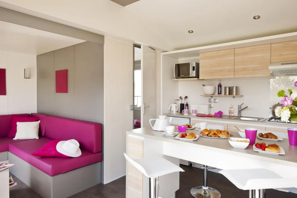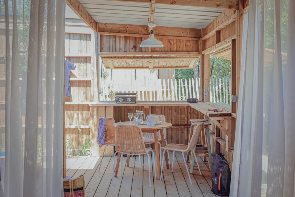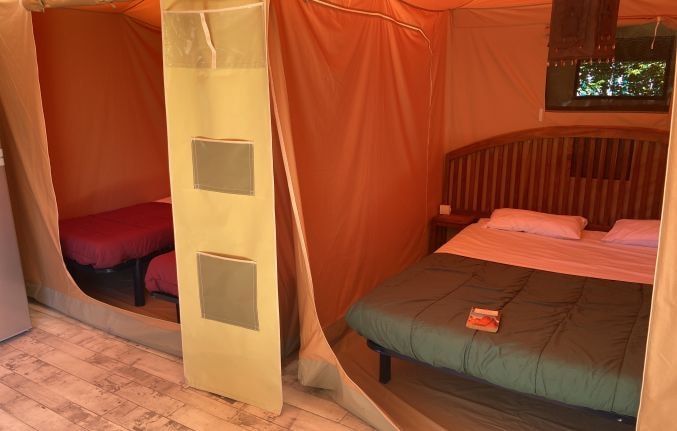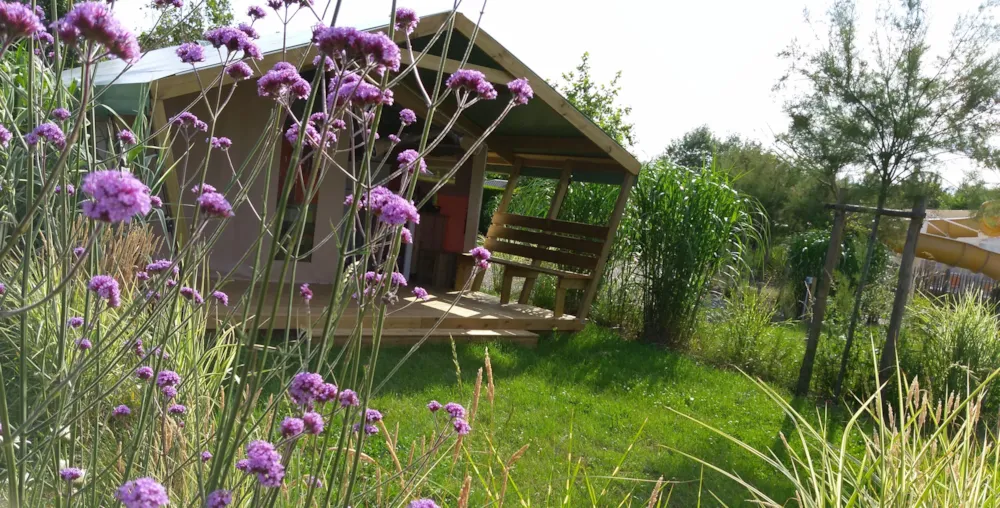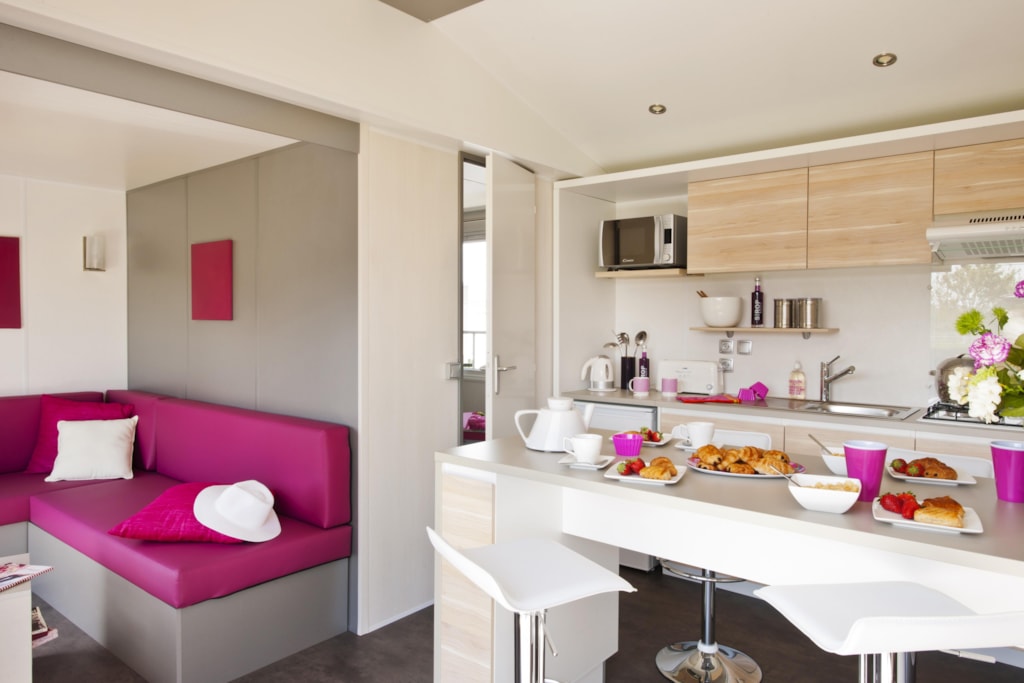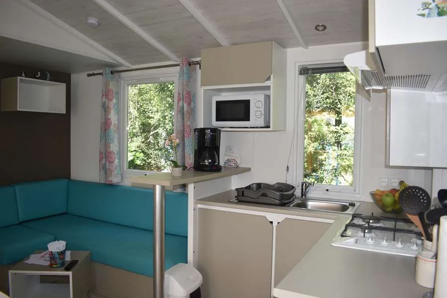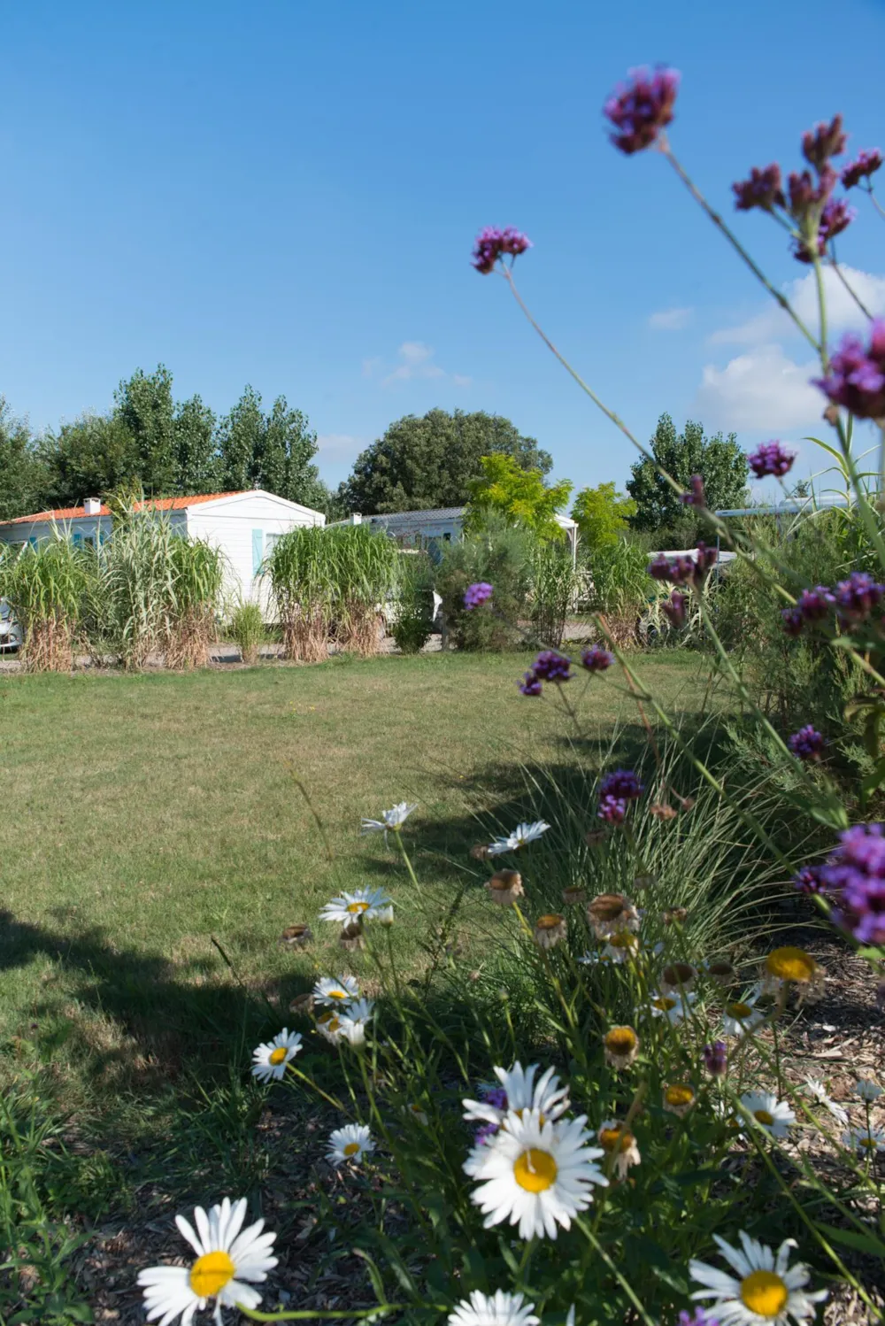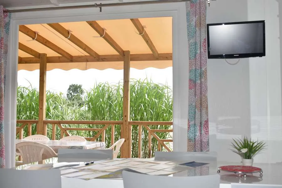 1 bedroom with 1 double bed (140 x 190), wardrobe, duvet, blanket and pillows. 2 bedrooms with 2 single beds (80 x 190) one of which a truckle bed, wardrobe, duvets, blankets and pillows. 1 equipped kitchen (dishwasher, 4 burner stove top, cooker hood, refrigerator/freezer, micro wave oven, electric Tassimo coffee maker, toaster, dishware and cupboards). 1 living area with sofa, television and heating. 1 bathroom with shower, sink, hair dryer, and heating. Separate toilet. Garden furniture + 2 sun loungers on covered wooden terrace. Bed linen and bathroom towels included (1 kit per bed/person and per stay) for a change during the stay, a supplement will be charged. Baby kit available upon request. Wi-Fi connection included. The pluses in the Premiums: located in the Premium sector with view of the meadow and our animals, dishwasher, bed linen and bathroom towels, illimited Wi-Fi, heating in the bathroom, baby kit, toaster, hair dryer, sun loungers.