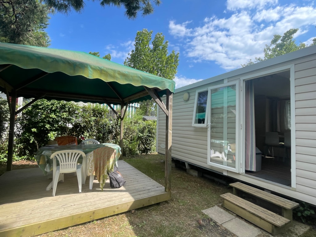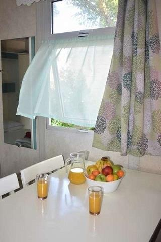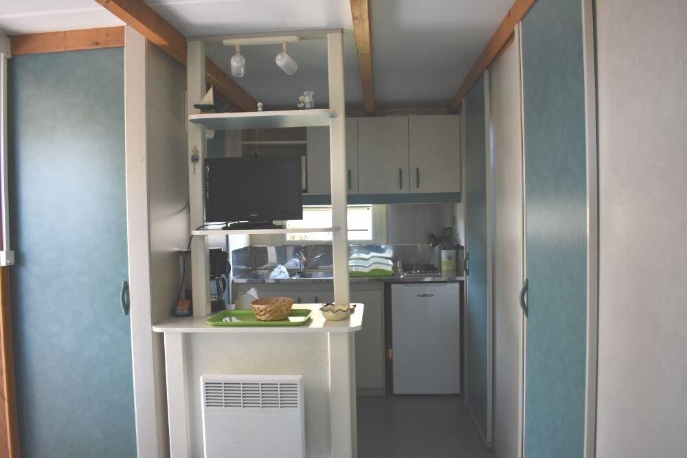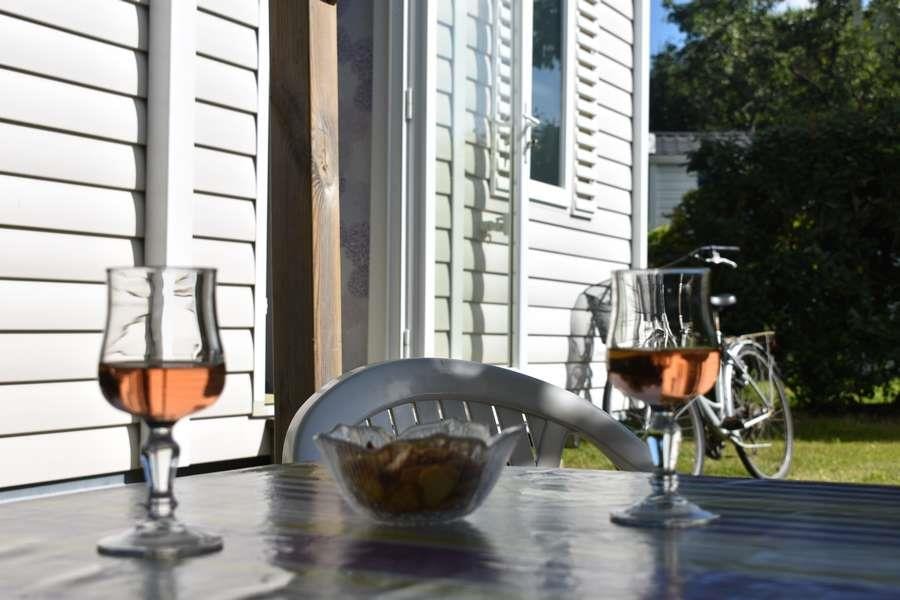 1 bedroom with 1 double bed (140 x 190), wardrobe, duvet, blanket and pillows. 1 equipped kitchen (dishwasher, 4 burner stove top, cooker hood, refrigerator/freezer, micro wave oven, electric Tassimo coffee maker, toaster, dishware and cupboards). 1 living area with sofa, television and heating. 1 bathroom with shower, sink, toilet, hair dryer, and heating. Garden furniture + 2 sun loungers on covered wooden terrace. Bed linen and bathroom towels included (1 kit per bed/person and per stay) for a change during the stay, a supplement will be charged. Wi-Fi connection included. The pluses in the Premiums: dishwasher, bed linen and bathroom towels , illimited Wi-Fi, heating in the bathroom, toaster, hair dryer, sun loungers.
