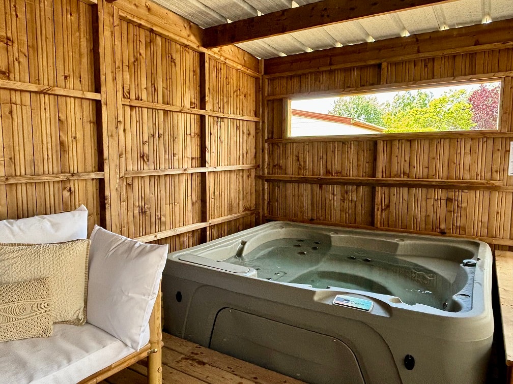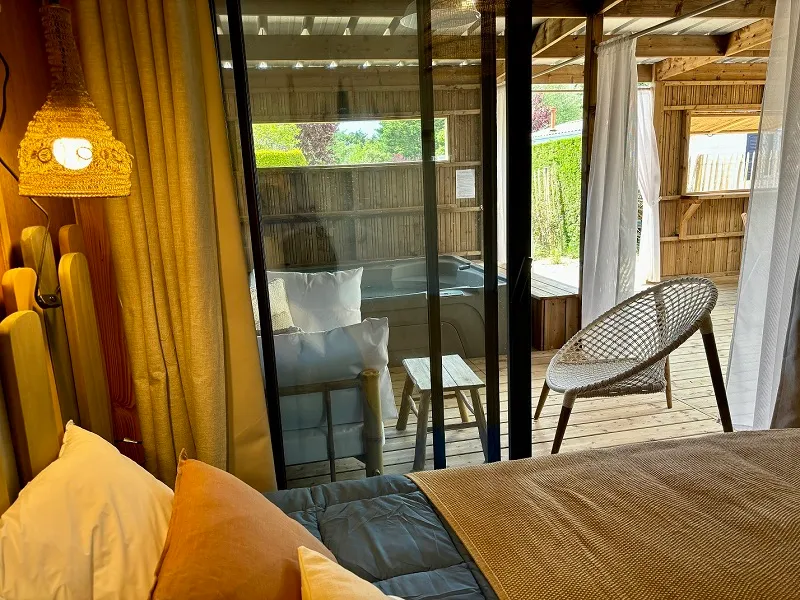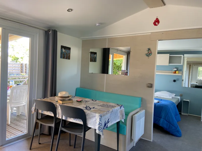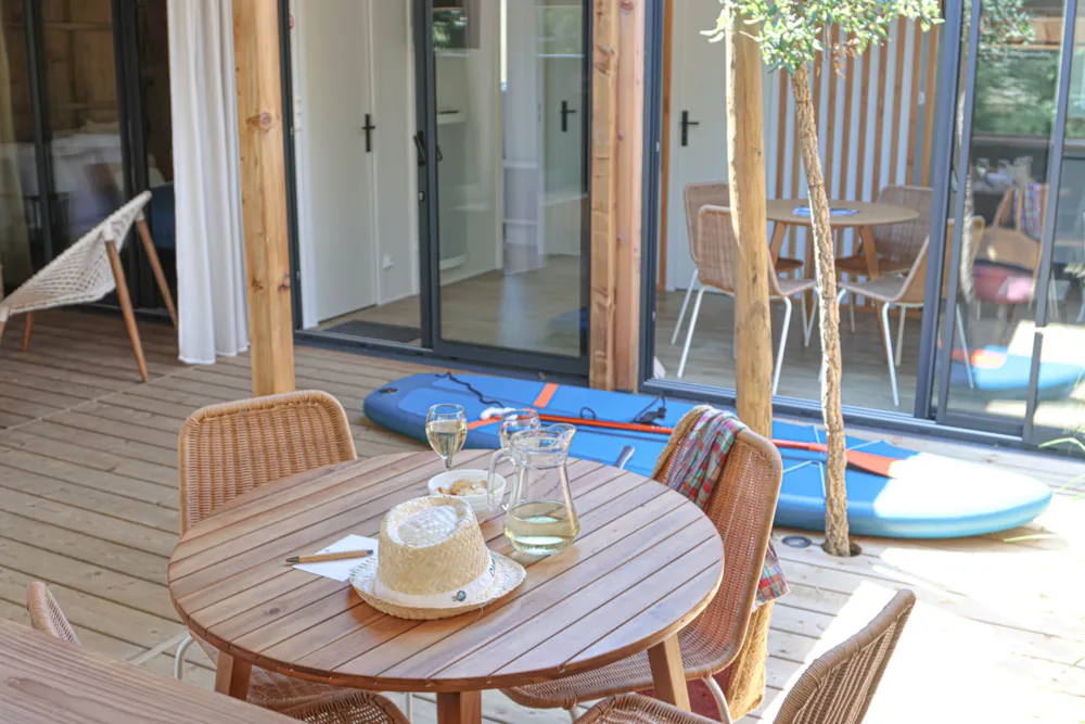 1 bedroom with 1 double bed (160*200), wardrobe, duvet, blanket, pillows. 1 bedroom with 1 single bed, 1 loft bed + 1 trundle bed (all 80 x 190), wardrobe, duvets, blankets and pillows. 1 equipped kitchen (dishwasher, 4-burner hob, hood, fridge/freezer, microwave, coffee maker, toaster, crockery and storage cupboards). 1 living area with sofa, television and heating. 1 bathroom with XL shower, sink, heated towel rail and hair dryer. Separate WC. Jacuzzi, garden furniture and plancha on covered wooden terrace. Bed linen and bath towels provided (1 kit per bed/person and per stay) for a change during the stay, a supplement will be charged. Baby kit available upon request. WIFI connection. The +: Jacuzzi, dishwasher, toaster, linen and towels, plancha, heating in living room and the bedrooms, unlimited WiFi, heated towel rail in bathroom , baby kit.