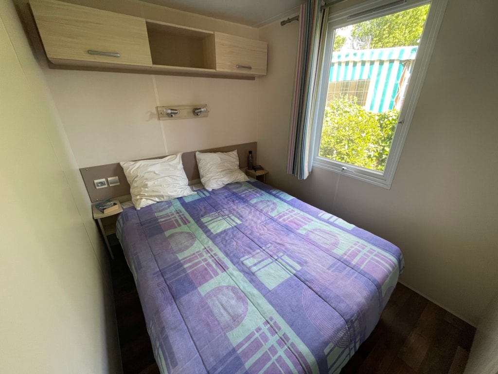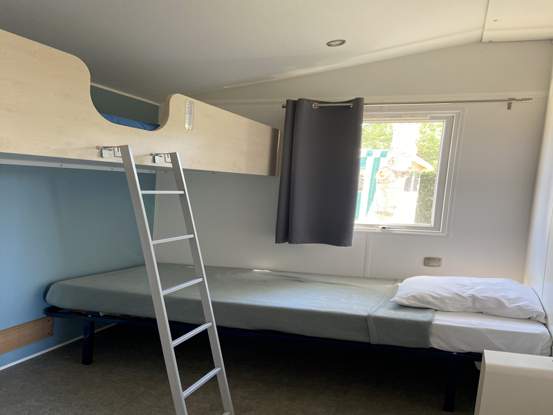 1 large bedroom with 1 double bed (160 x 200), wardrobe, duvet, blanket and pillows. 1 bedroom with 1 loft bed (70 x 190) and 1 single bed (90 x190), wardrobe, duvets, blankets and pillows. Bed linen included (1 kit per bed and per stay) for a change during the stay, a supplement will be charged. 1 equipped kitchen (4 burner stove top, refrigerator, micro wave oven, electric coffee maker, dishware and cupboards). 1 living area with sofa bed (140 x 190), television and heating. 1 large bathroom with shower, sink and toilet. Garden furniture on covered wooden terrace with access ramp.