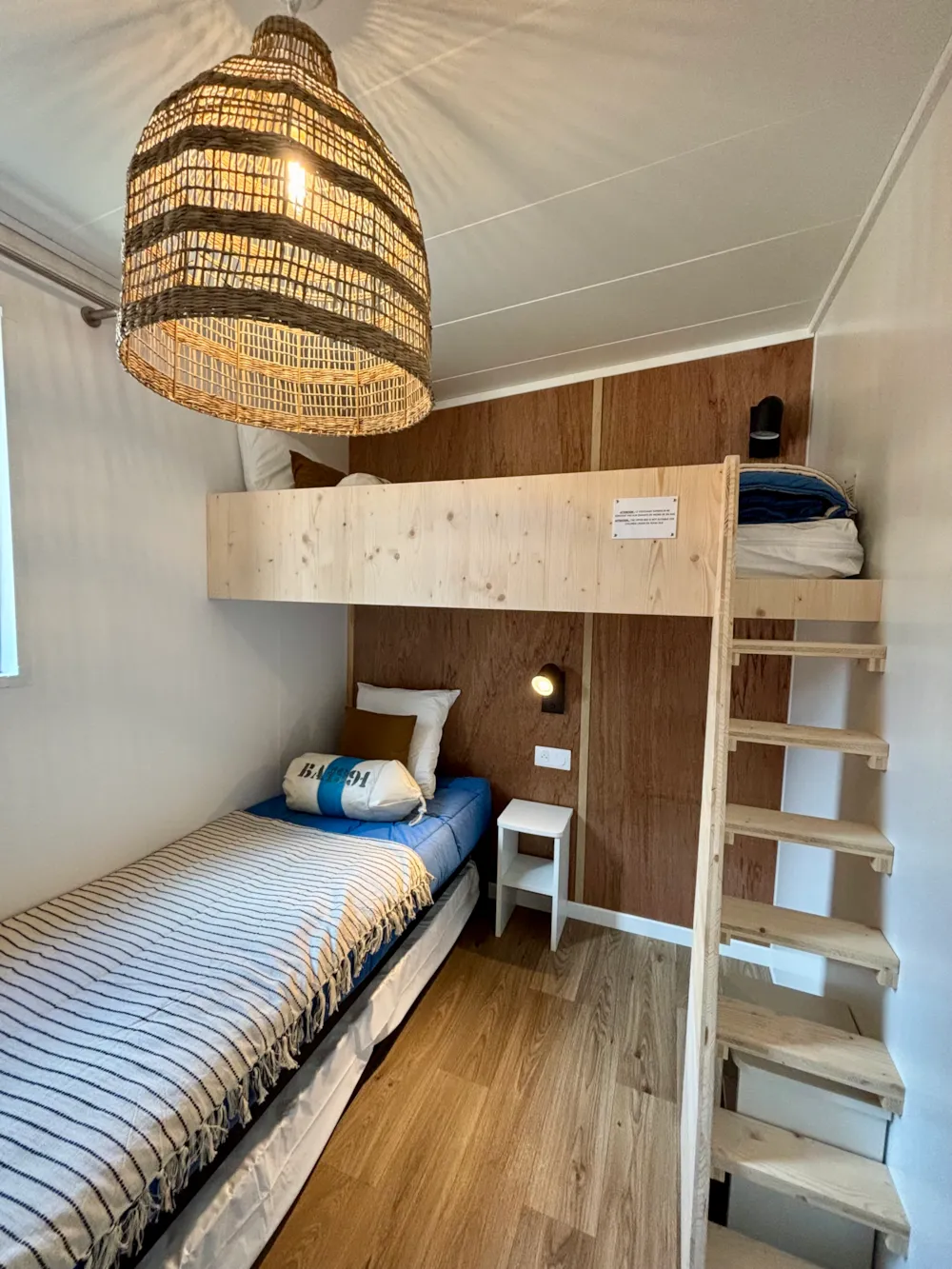 1 bedroom with 1 double bed (160*200), wardrobe, duvet, blanket, pillows. 1 bedroom with 1 single bed, 1 loft bed + 1 trundle bed (all 80 x 190), wardrobe, duvets, blankets and pillows. 1 equipped kitchen (dishwasher, 4-burner hob, hood, fridge/freezer, microwave, coffee maker, toaster, crockery and storage cupboards). 1 living area with sofa, television, air-conditionning and heating. 1 bathroom with XL shower, sink, heated towel rail and hair dryer. Separate WC. Jacuzzi, garden furniture and plancha on covered wooden terrace. Bed linen and bath towels provided (1 kit per bed/person and per stay) for a change during the stay, a supplement will be charged. Baby kit available upon request. WIFI connection. The +: Jacuzzi, dishwasher, toaster, linen and towels, plancha, heating in living room and the bedrooms, unlimited WiFi, heated towel rail in bathroom , baby kit.