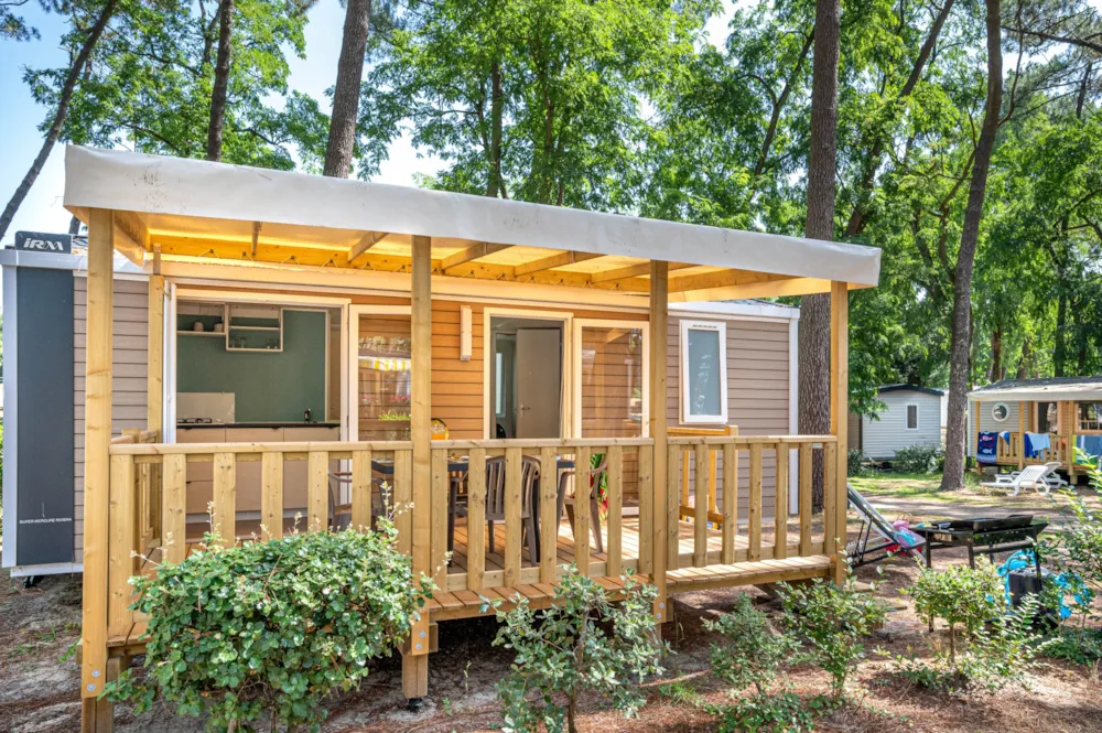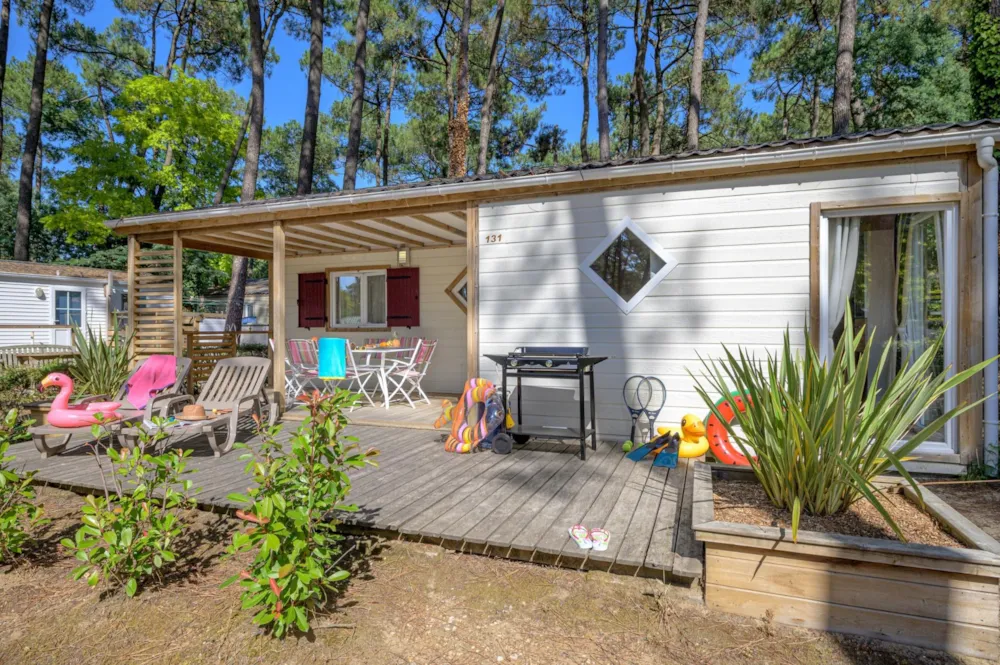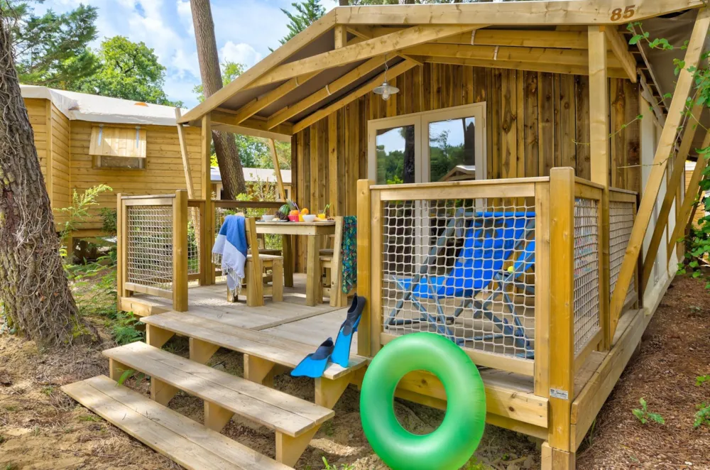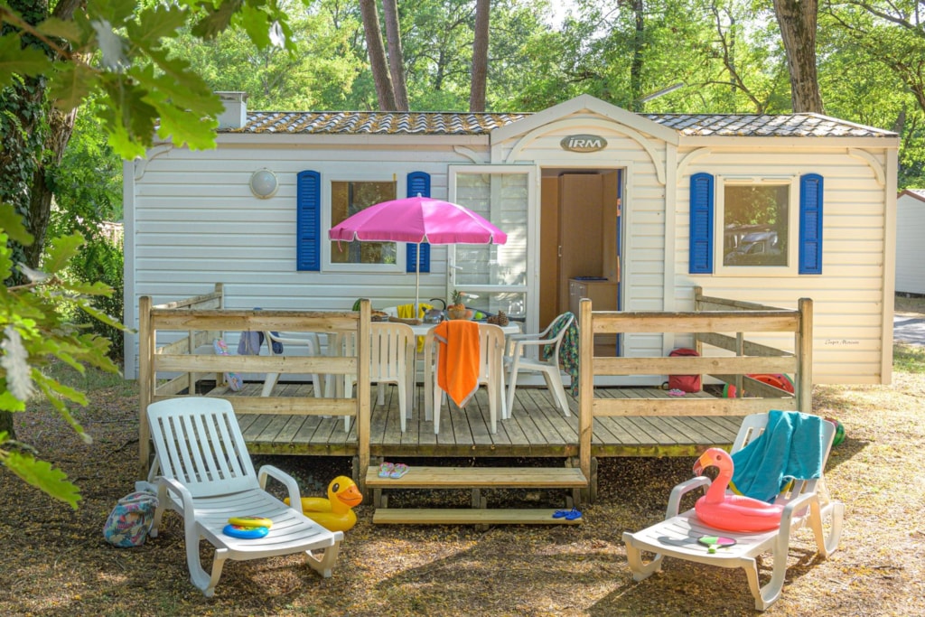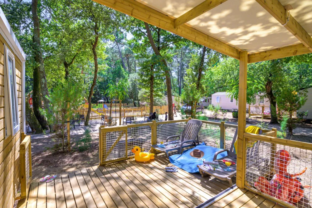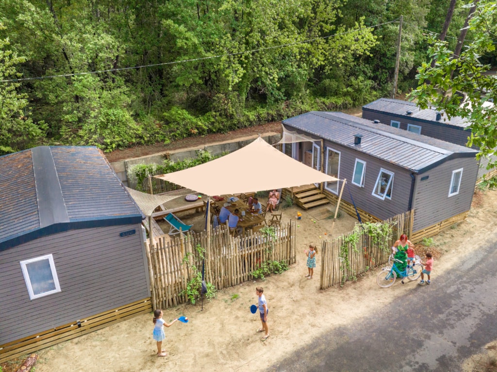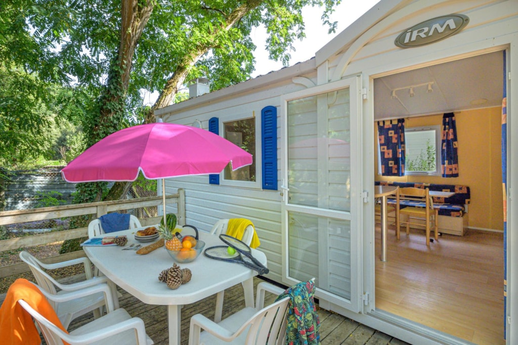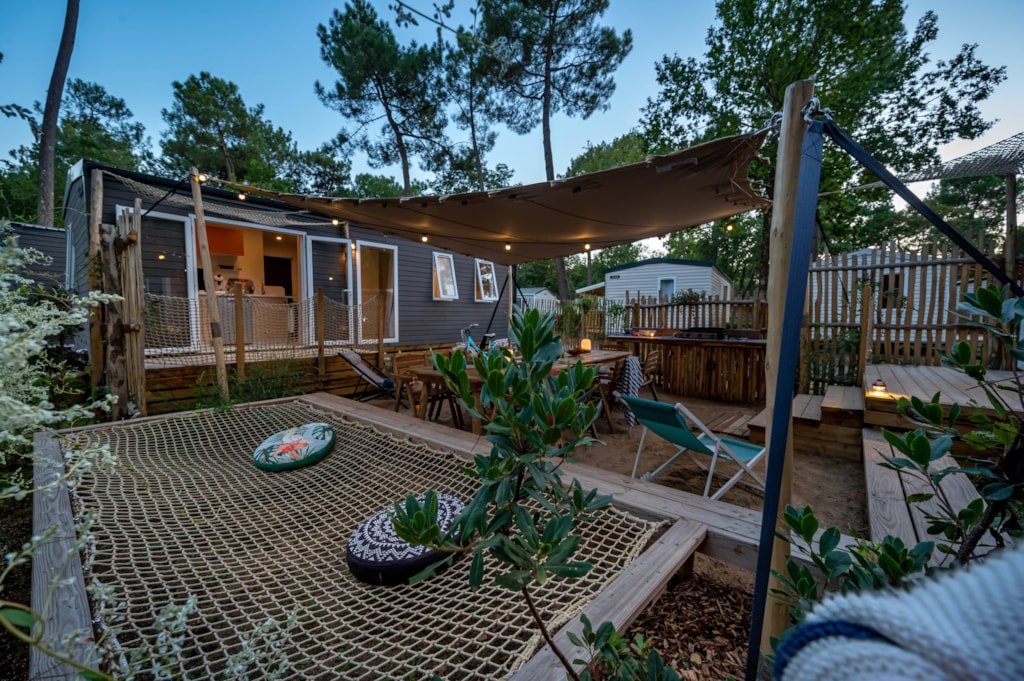 Gelegen in unserem Tribu-Bereich im ruhigen Wald am äußersten Ende des Campingplatzes, besteht diese Tribu aus 2 Mobilheimen, die sich gegenüberstehen und einen gemeinsamen Außenbereich teilen, auf einem Stellplatz von ca. 300 m².