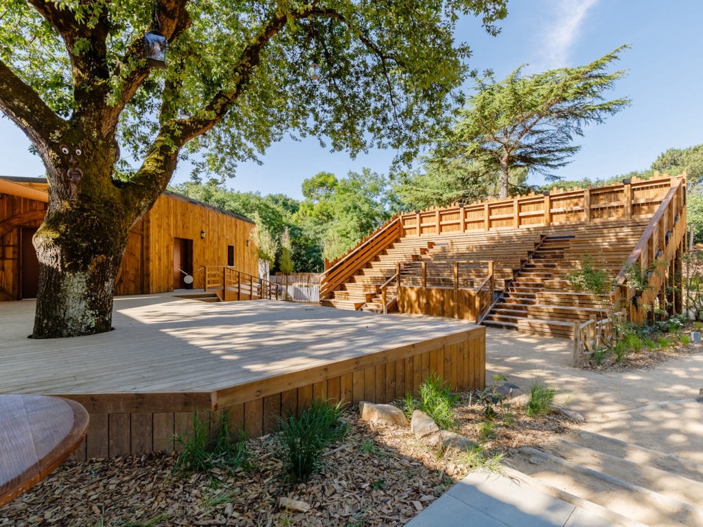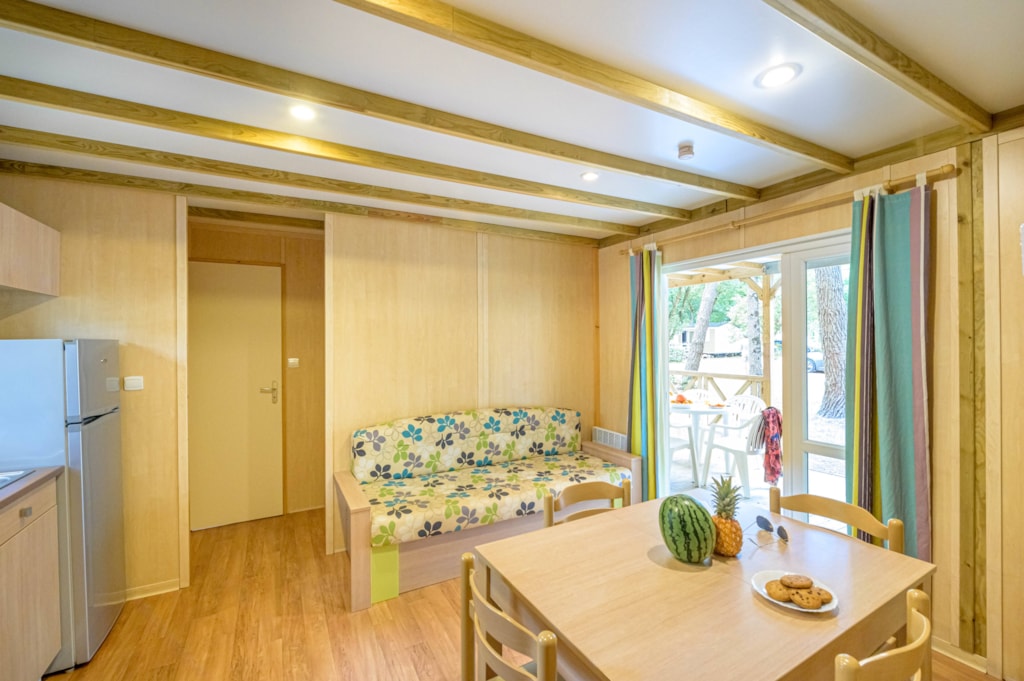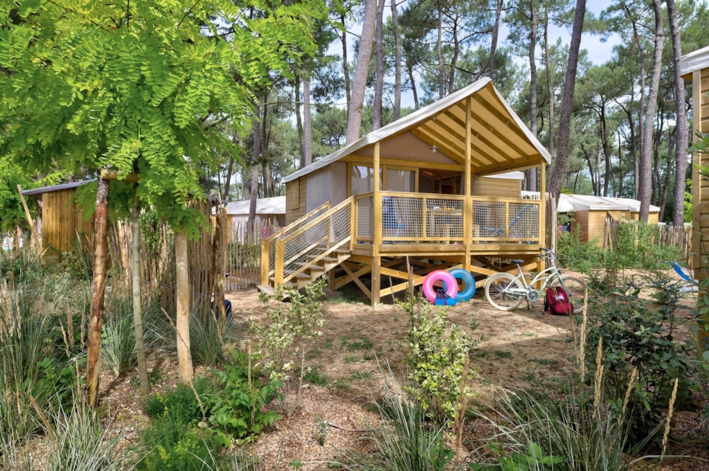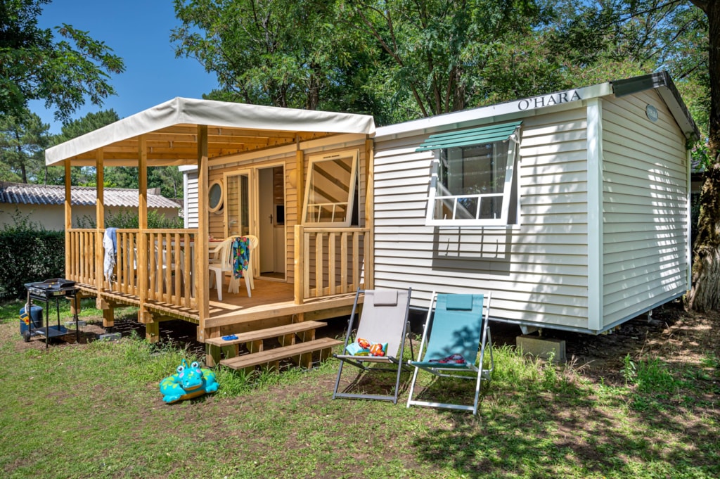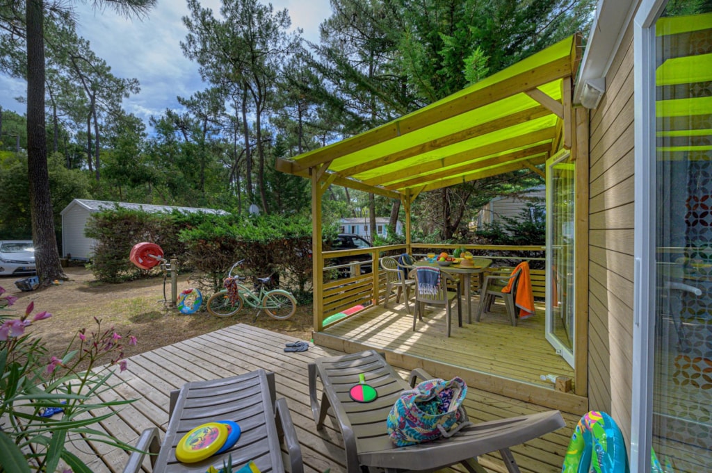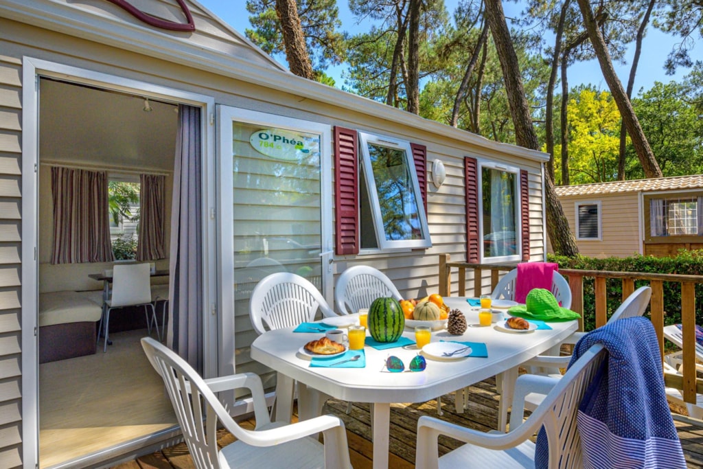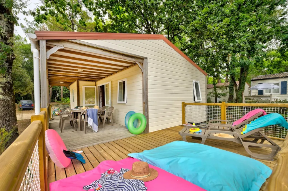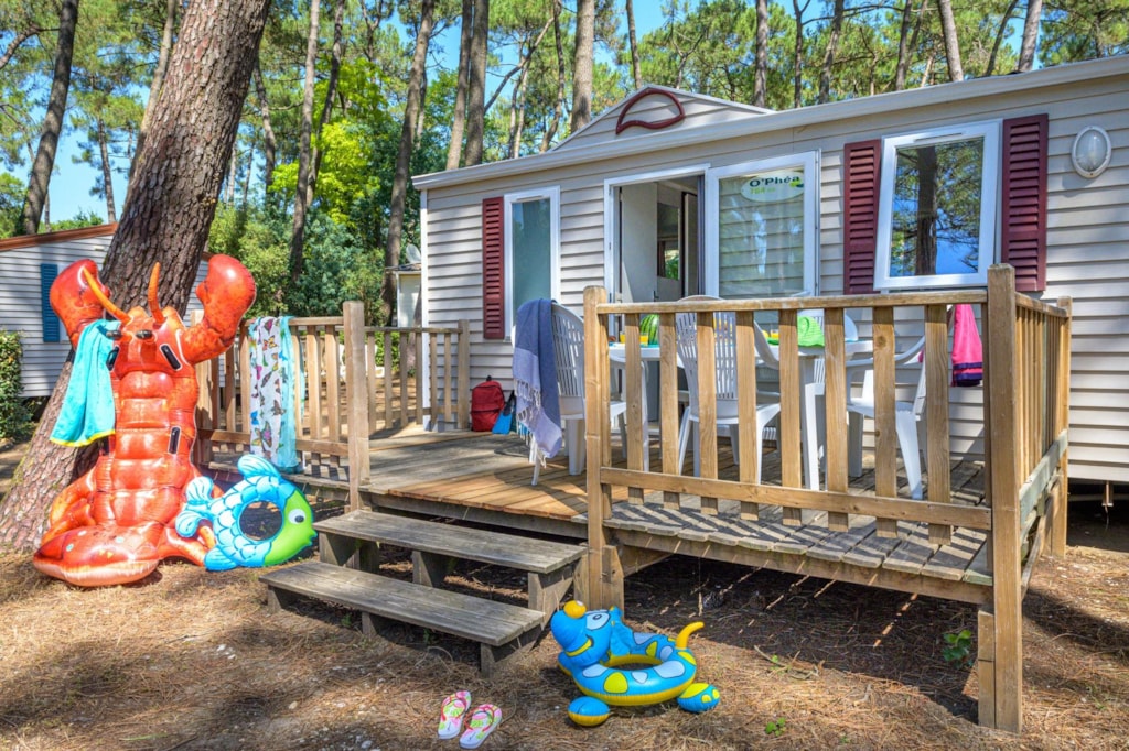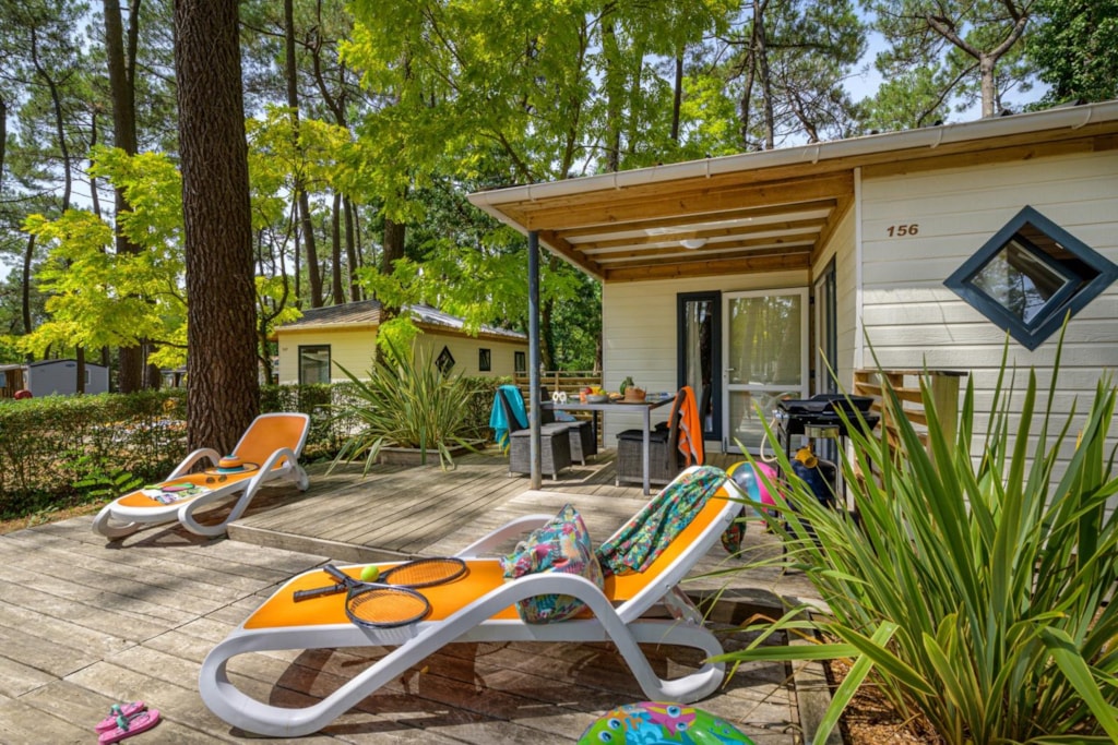Gelegen in unserem Tribu-Bereich im ruhigen Wald am äußersten Ende des Campingplatzes, besteht diese Tribu aus 2 Mobilheimen, die sich gegenüberstehen und einen gemeinsamen Außenbereich teilen, auf einem Stellplatz von ca. 300 m².