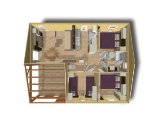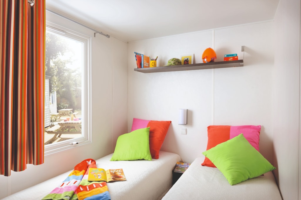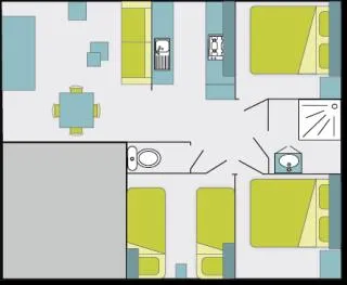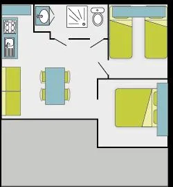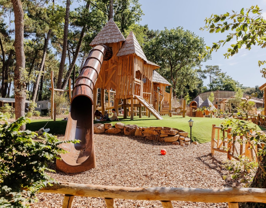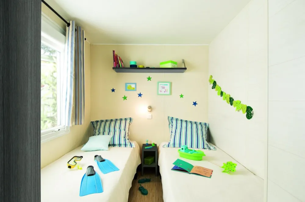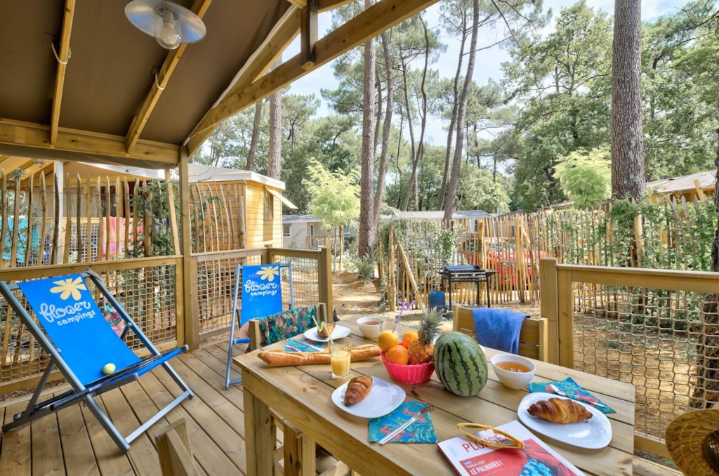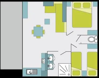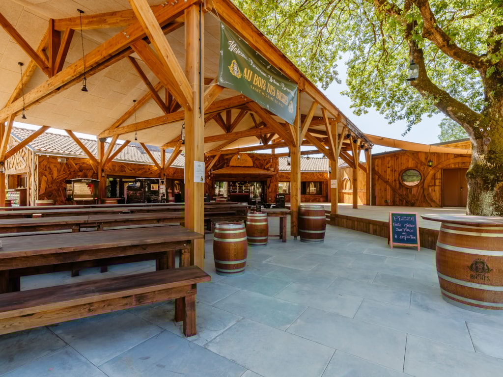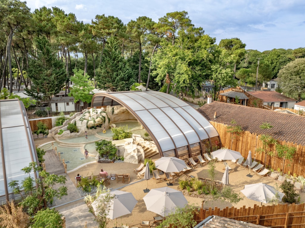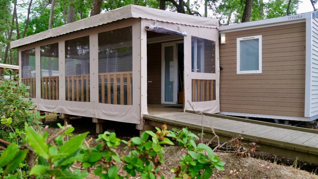 Gelegen in unserem Tribu-Bereich im ruhigen Wald am äußersten Ende des Campingplatzes, besteht diese Tribu aus 2 Mobilheimen, die sich gegenüberstehen und einen gemeinsamen Außenbereich teilen, auf einem Stellplatz von ca. 300 m².