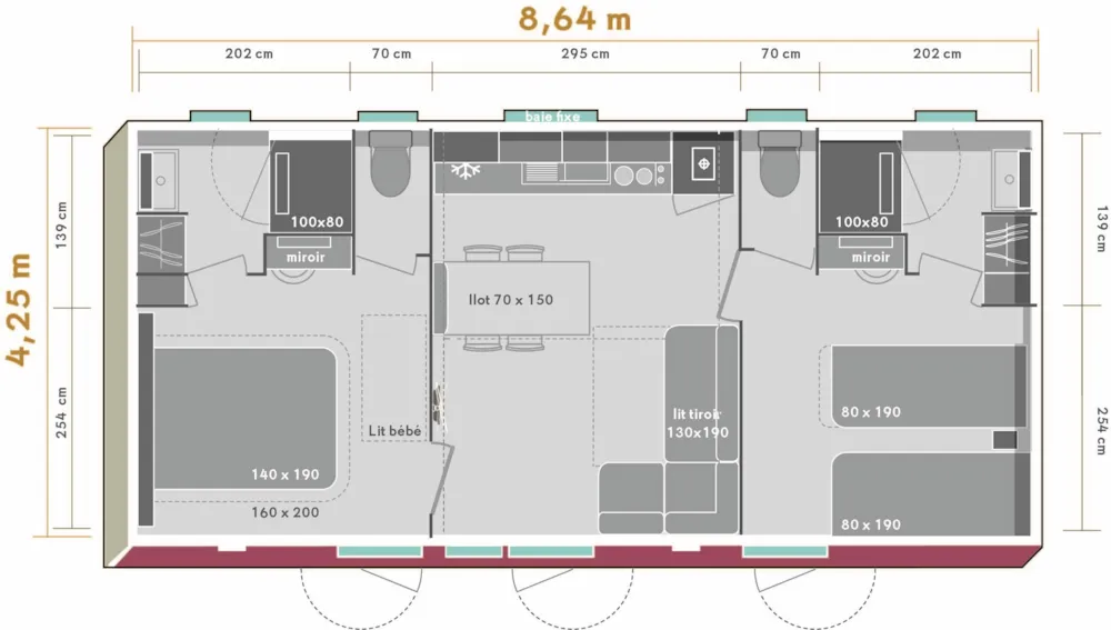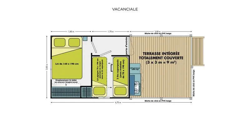 *Decken und Kissen vorhanden. Matratzen und Kissen sind mit einem wasserfesten Bezug geschützt, der zwischen jedem Aufenthalt desinfiziert wird. Baby-Set (Hochstuhl + Kinderbett) auf Anfrage erhältlich.