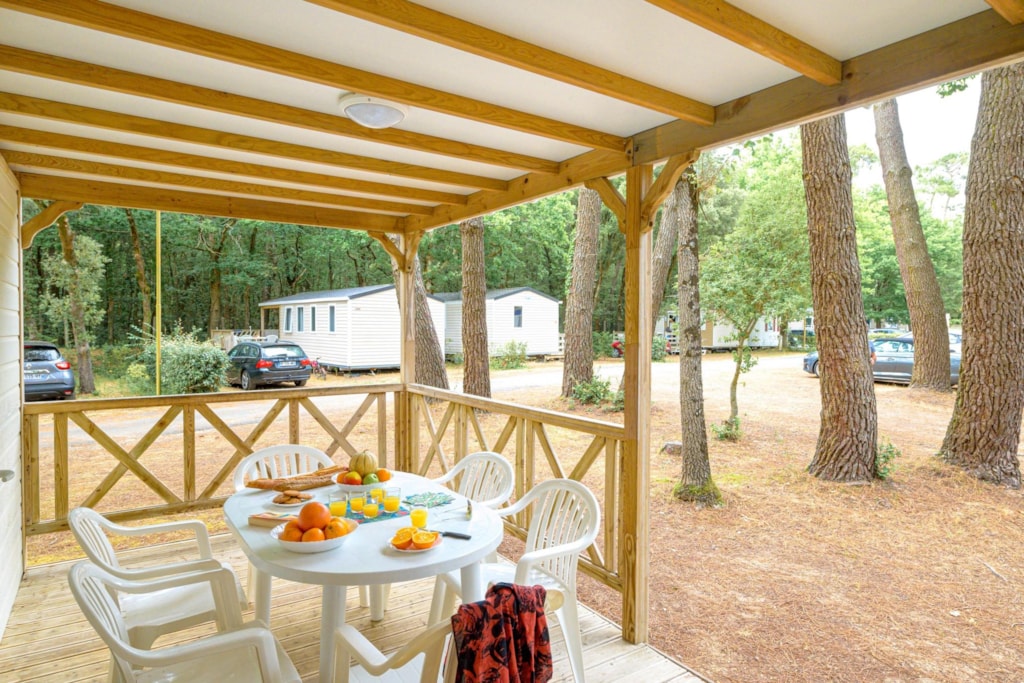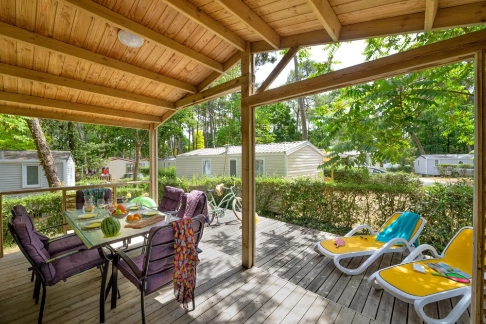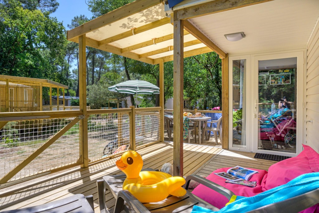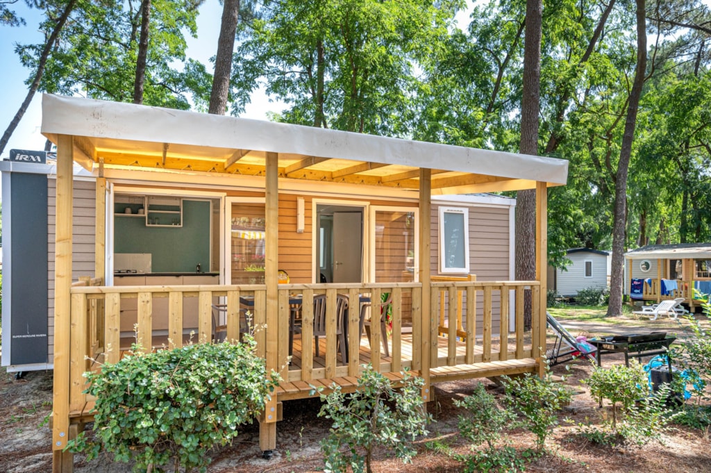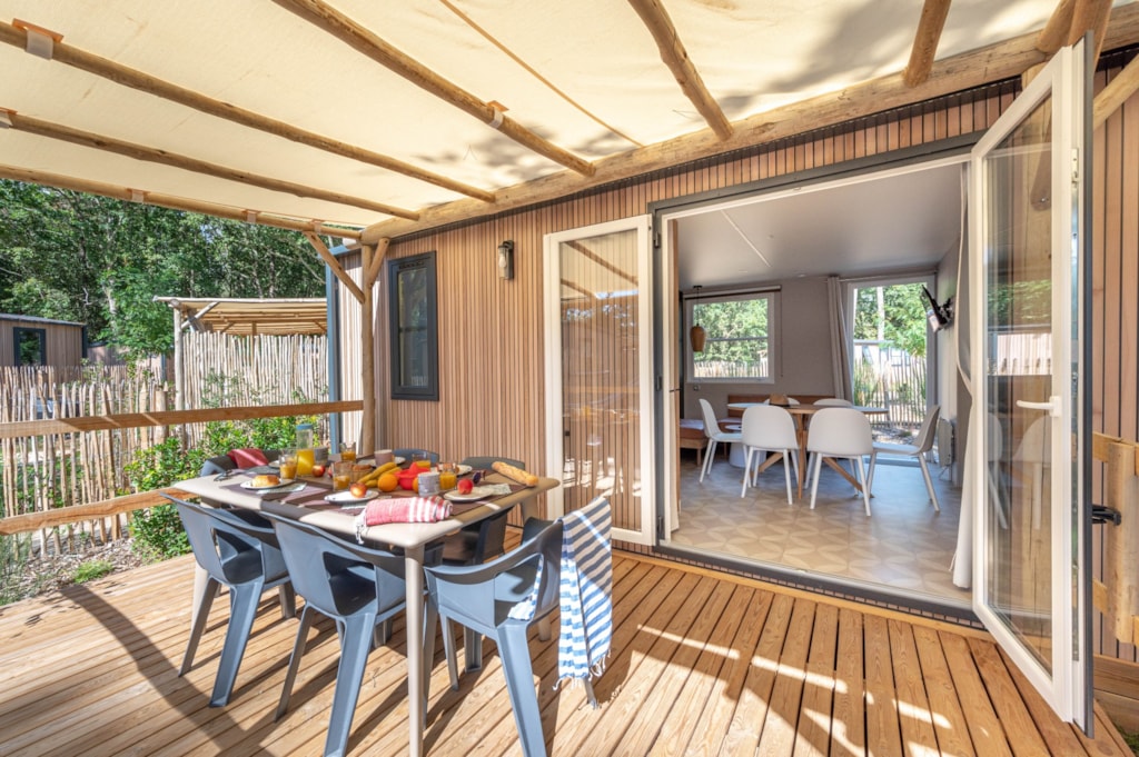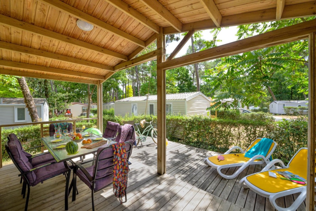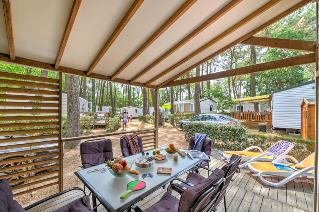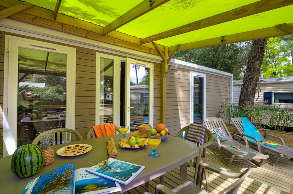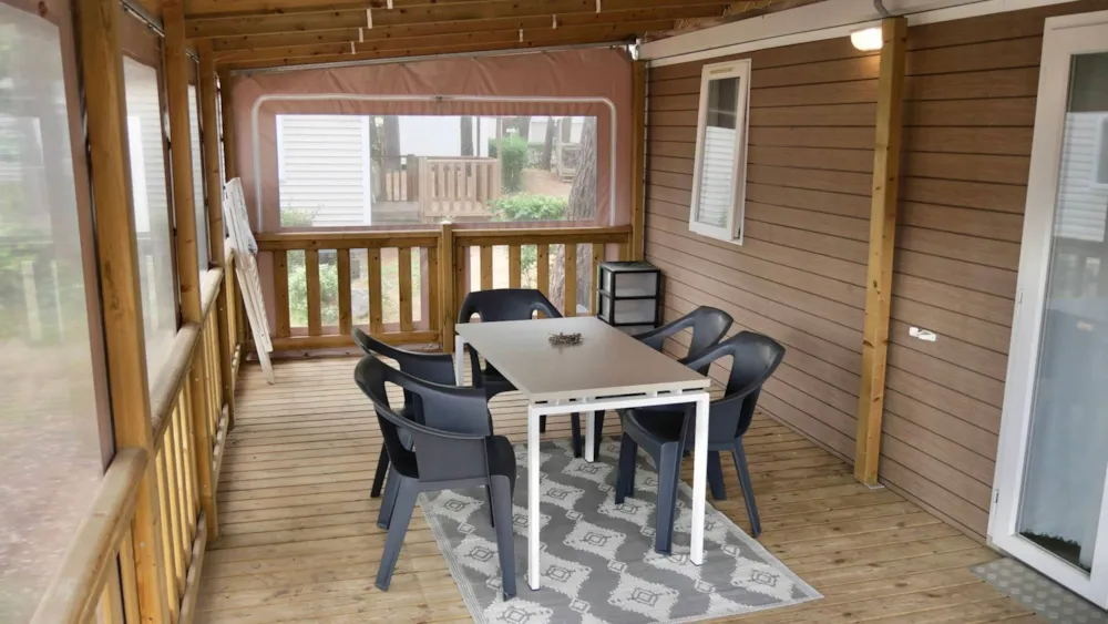 - Der Wohnbereich öffnet sich auf eine überdachte Holzterrasse mit Tisch, Gartenstühlen und einer Gasplancha, um Ihre Familienmahlzeiten zu genießen