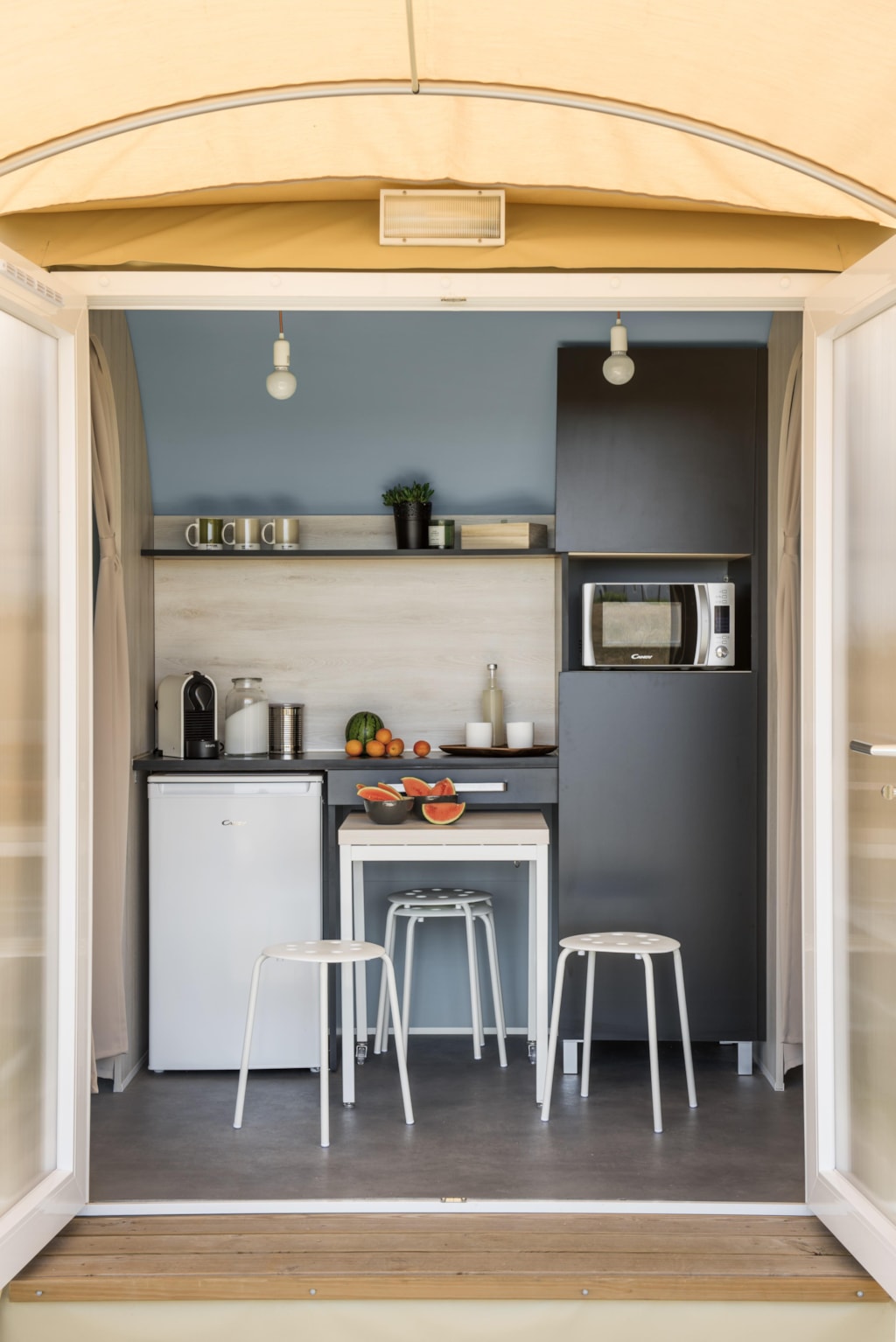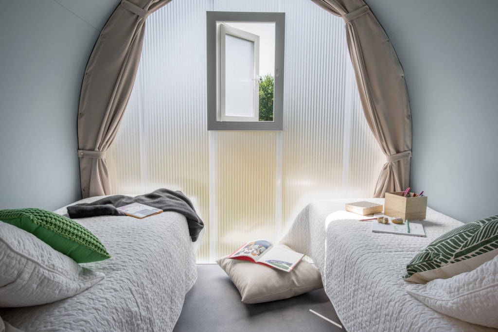 Das Lodge-Zelt Coco Sweet ist ein Konzept, das Funktionalität und Gemütlichkeit, Spaß und Komfort vereint – eine neue Art, Campingferien zu erleben, besonders ansprechend und erschwinglich für bis zu 4 Personen. In der Nähe der Sanitäranlagen gelegen und mit einer abschließbaren Tür versehen, besticht diese ungewöhnliche Unterkunft mit ihren abgerundeten Formen und der robusten Canvas-Bespannung