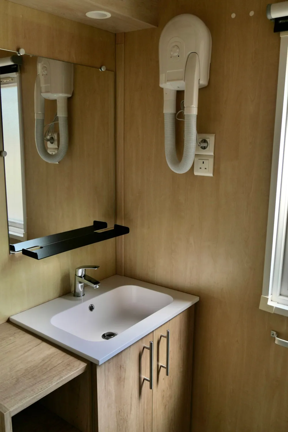 - 1 Badezimmer mit Dusche (100x80cm), Waschbecken, Handtuchtrockner und Föhn