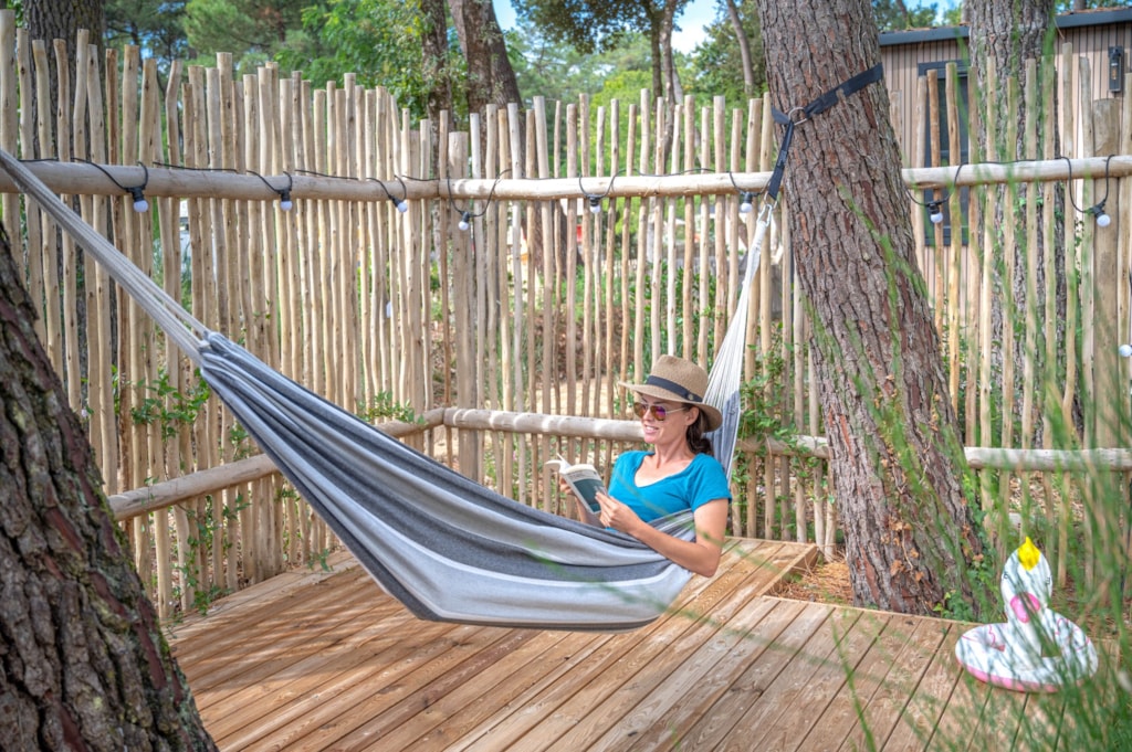 - Folgen Sie dem Weg zu einer Zen-Terrasse, die mit einer Hängematte ausgestattet ist