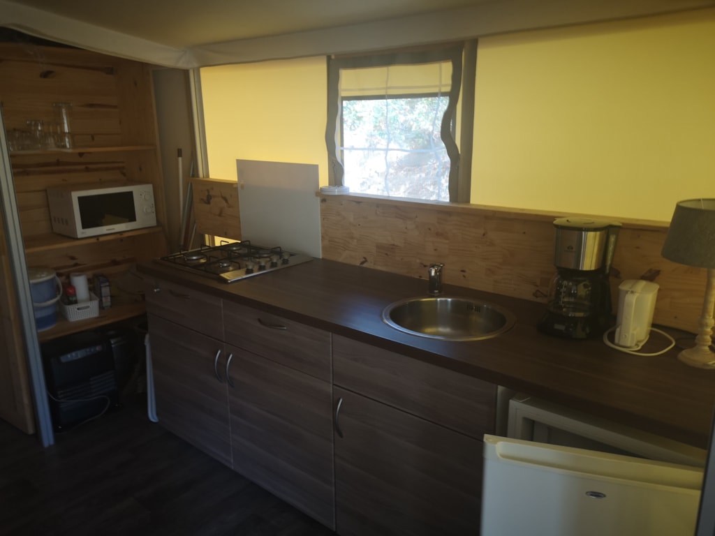 Coco Sweet Is een kleine Mobil Home van 11m2 overdekt met tent- doek , een ronde vorm met het uiterlijk van een lodge tent.Geisoleerde stevige wanden , de ingang een met sleutel afsluitbare deur.Dit model Duo is geschikt voor 2 personen, met een 2 pers. Bed 1,40 x 190 , koelkast ,waterkoker , induktie kookplaatje, magnetron , koffiezet apparaat , eet en keukengerei. 2 zitjes . Een houten voorterras met luifel en een tuinset en 2 ligstoelen om heerlijk ontpannen te genieten van het buitenleven. Sanitair is in het nabijgelegen sanitair gebouw.De WIFI is niet inbegrepen in de huurprijs.