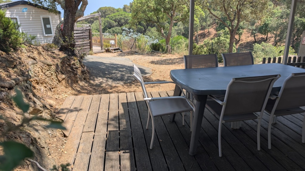 Dit Comfort-model is voorzien van airconditioning, enkele van deze typen hebben een prachtig uitzicht richting de Middellandse Zee, veel ruimte en comfort voor het hele gezin. Een centrale woonkamer, 2 slaapkamers, een met een tweepersoonsbed, 1.60m breed, de andere met 2 eenpersoonsbedden. 0.80m breed. Dekens en kussens (lakens niet inbegrepen) Mogelijkheid om lakens te huren. . Uitgeruste keuken: serviesgoed, elektrisch koffiezetapparaat, koelkast / met vriesvak, magnetron, houten terras met luifel, tuinmeubelen, parasol, comfortabele ligstoelen, badkamer (douche en wastafel) en apart toilet. Veilig. WIFI is niet bij de prijs inbegrepe