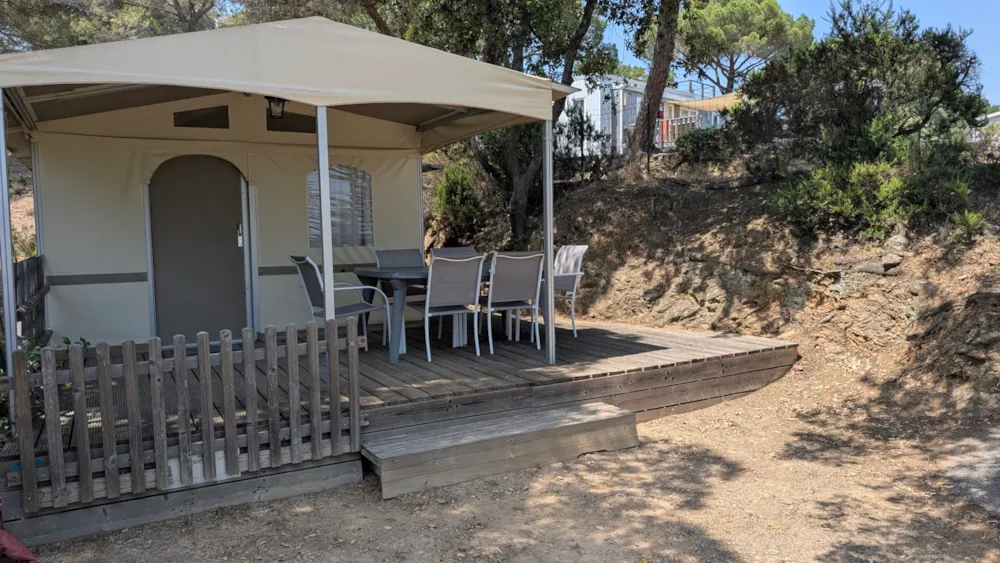 Deze lodgetent 30m2 is maximaal voor 4 personen. Er zijn 2 slaapkamers, 1 met 2 stapelbedden 0,80 x 190 en 1 met een tweepersoonsbed 160x200 .De lodge is voorzien van een badkamer met toilet, douche en wastafel. Daarnaast is er een compleet ingerichte keuken met een gasfornuis, een koel/vriescombinatie . Aan de voorzijde van de lodge ligt een mooi aangelegd terras. Vanaf dit terras heb je uitzicht over de middelandse zee.