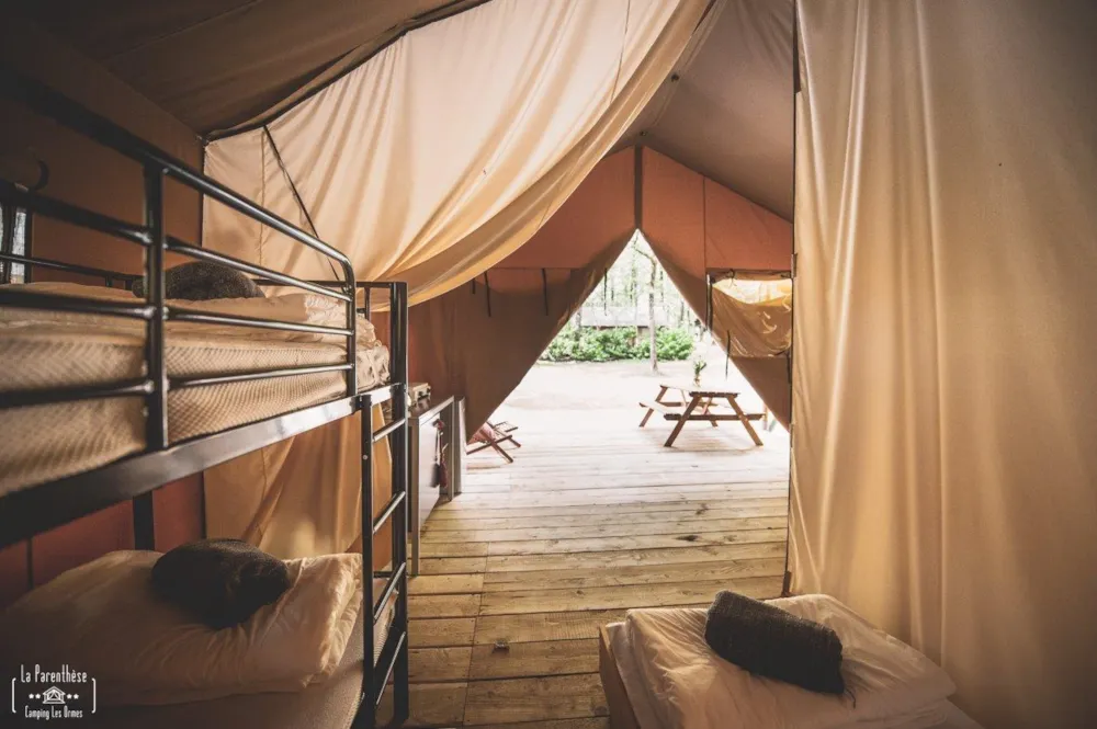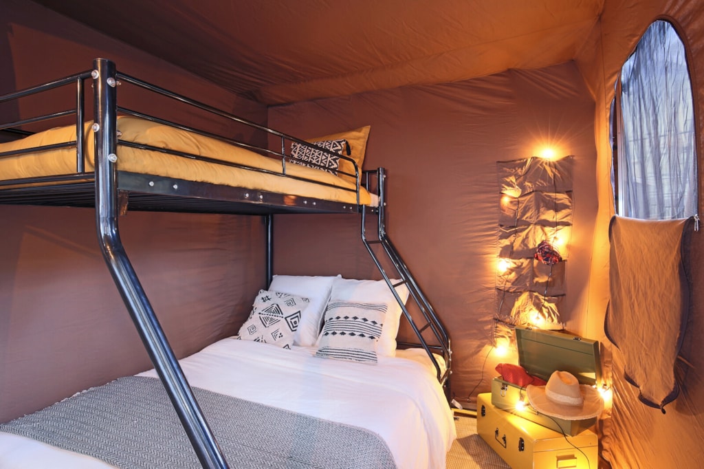 Schlafbereich: Die Arizona-Mietunterkunft verfügt über ein schönes Schlafzimmer mit Doppelbett (140x200) und ein zweites Schlafzimmer im Zelttuchbereich mit einem Doppelbett und einem darüber aufgestockten Einzelbett.