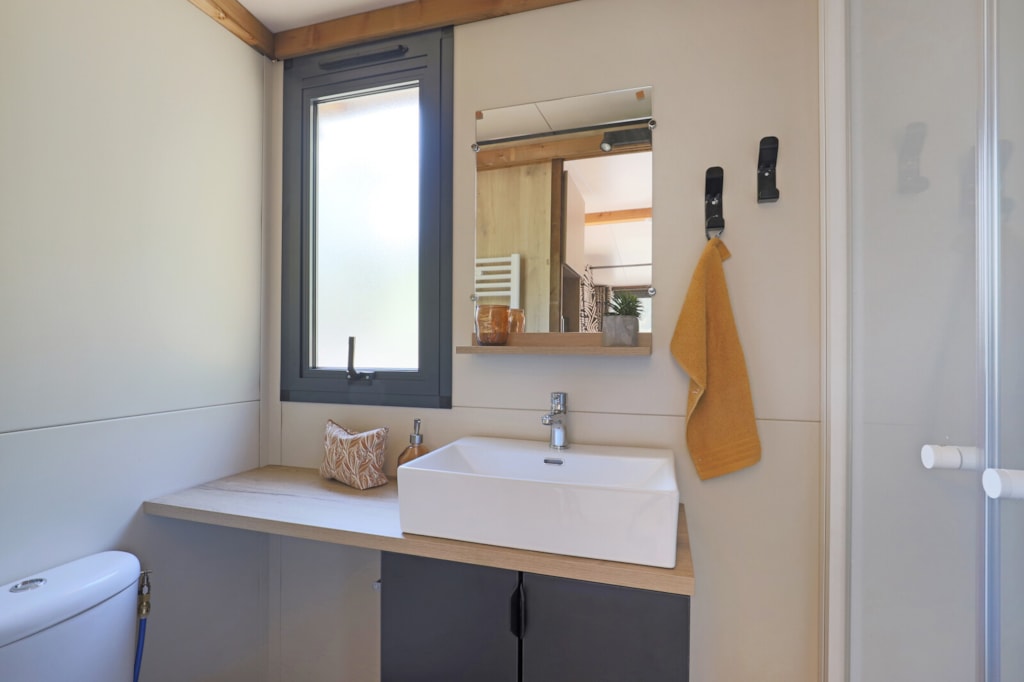 Für gemütliche Momente untertags bietet die Unterkunft einen mit allem Notwendigen ausgestatteten Küchenbereich, ein modernes Badezimmer mit großer Dusche (100x80) und einen 18m2 großen Außenbereich unter einem Vordach, der sich ideal für Ihre gemeinsamen Mahlzeiten an der frischen Luft, Ihre morgendlichen Frühstücke und zum Entspannen im Schatten eignet.