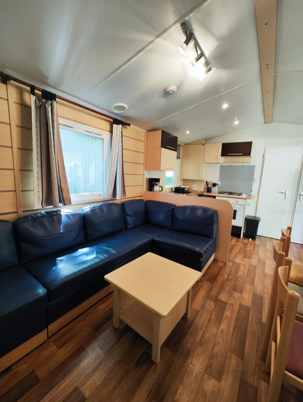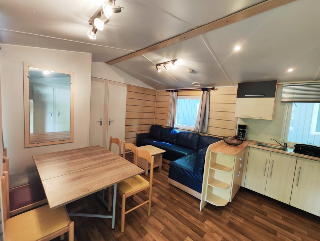 Nos Mobil Homes "Confort " peuvent accueillir de 6 à 7 personnes. Ils se composent d'un salon cuisine, table à manger, avec une banquette qui peut faire office de couchage 2 personnes. Une chambre avec un lit double et une autre chambre avec deux lits simples et une autre chambre avec deux lits simples. Une salle de bain avec WC. Une terrasse couverte.