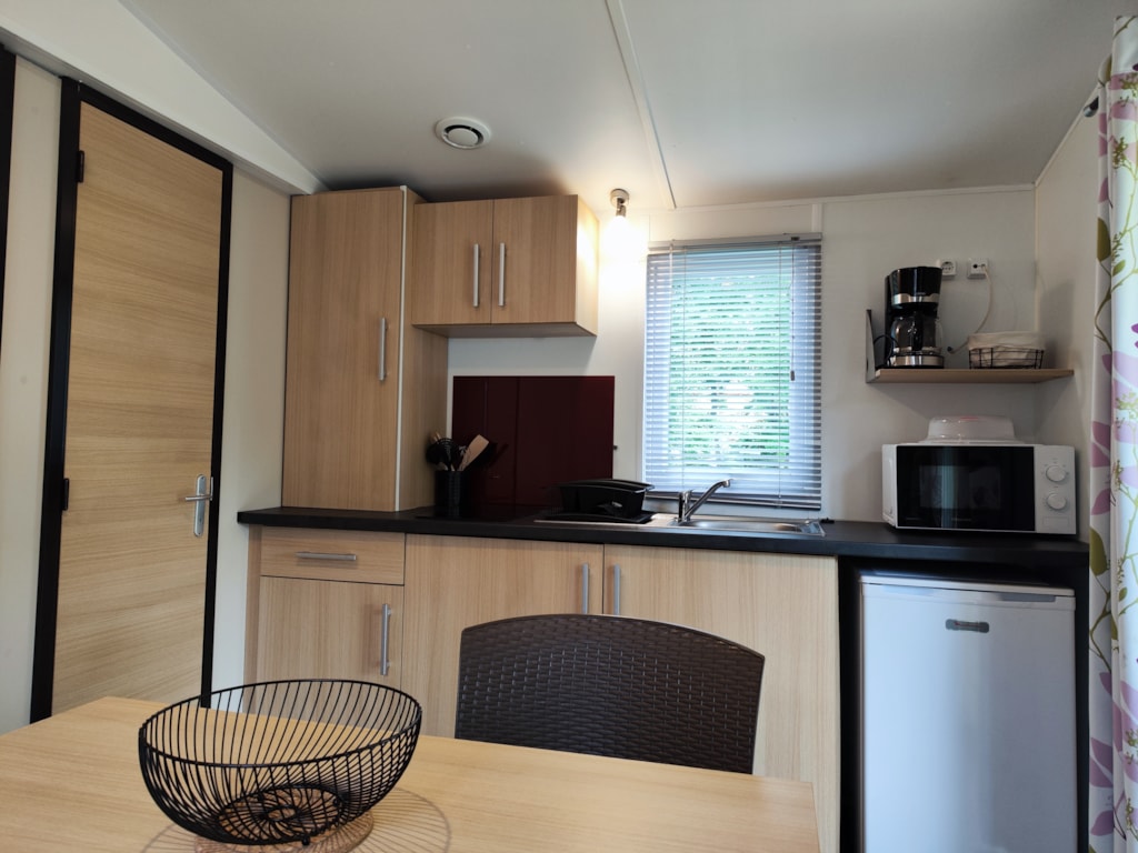 Nos Mobil Homes "Duo" peuvent accueillir 2 personnes. Ils se composent d'un salon cuisine avec une table à manger. Une chambre avec un lit double. Une salle de bain avec WC. Une terrasse couverte.