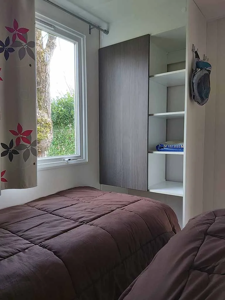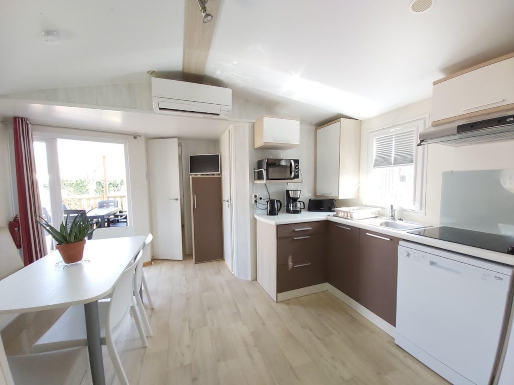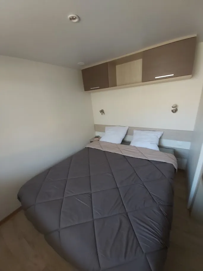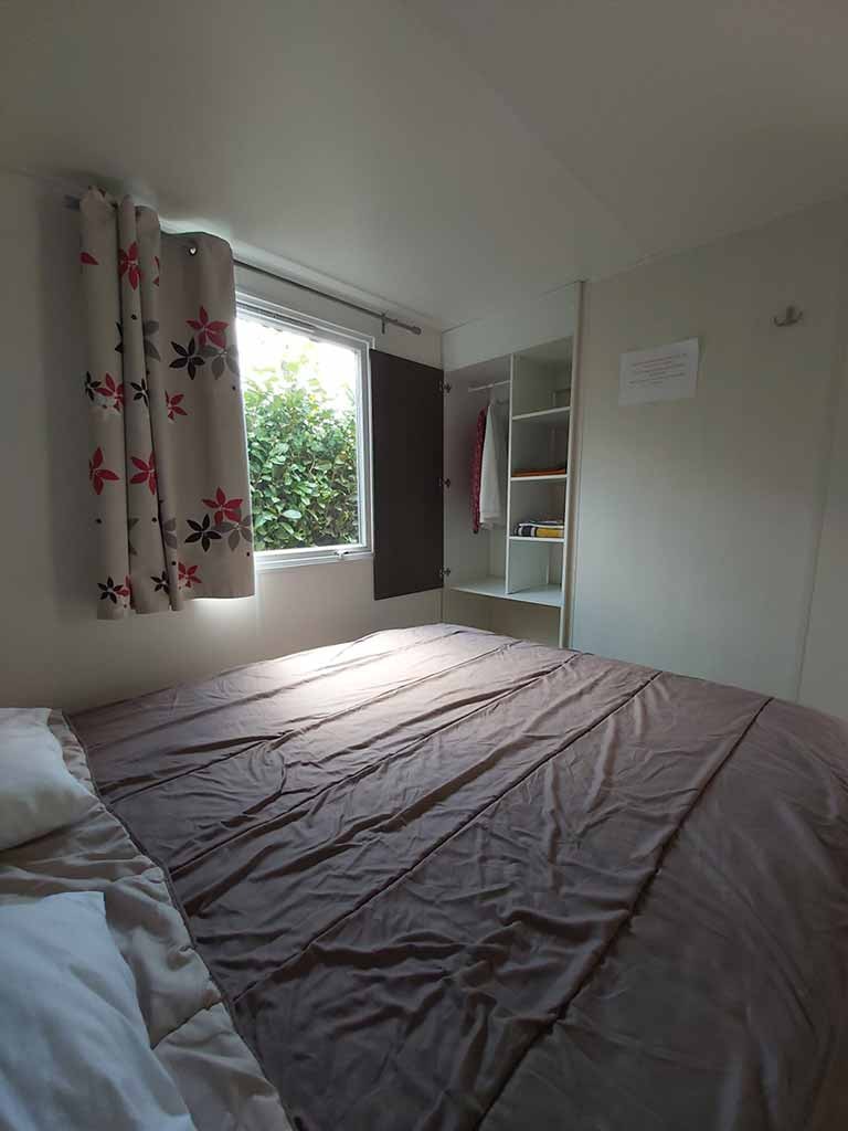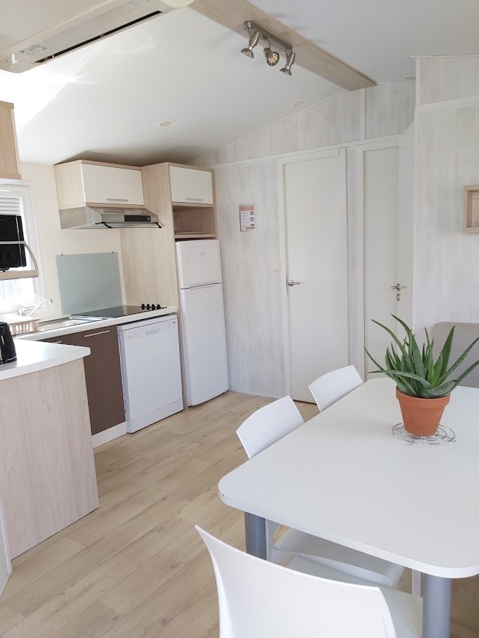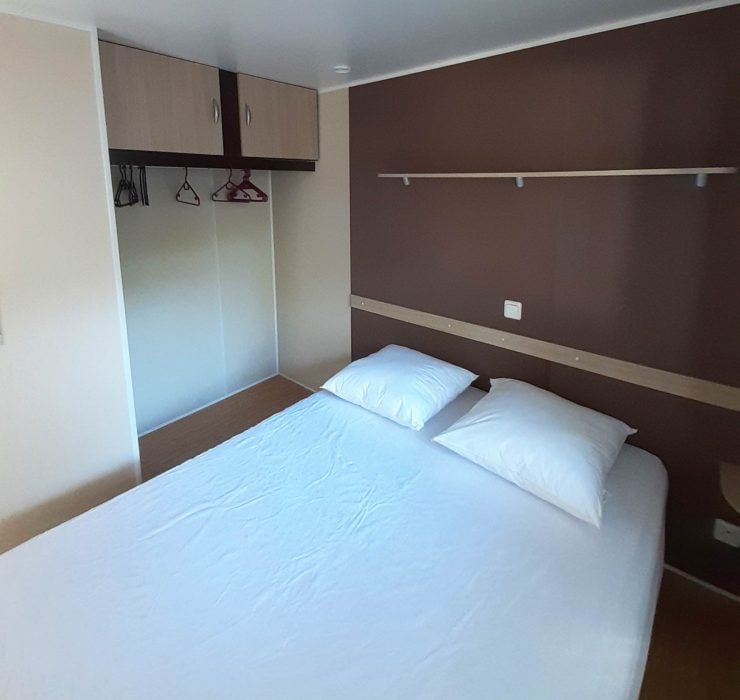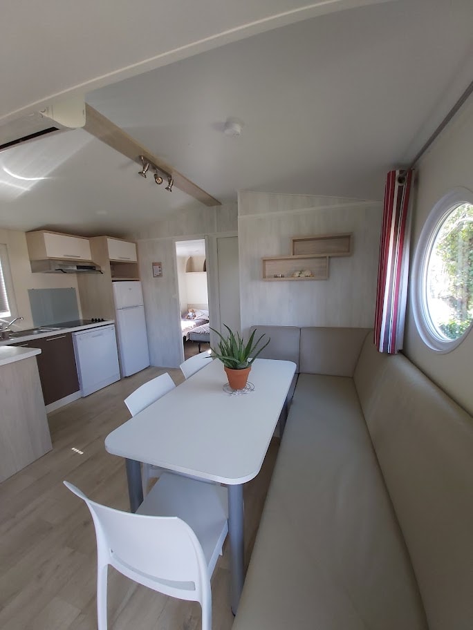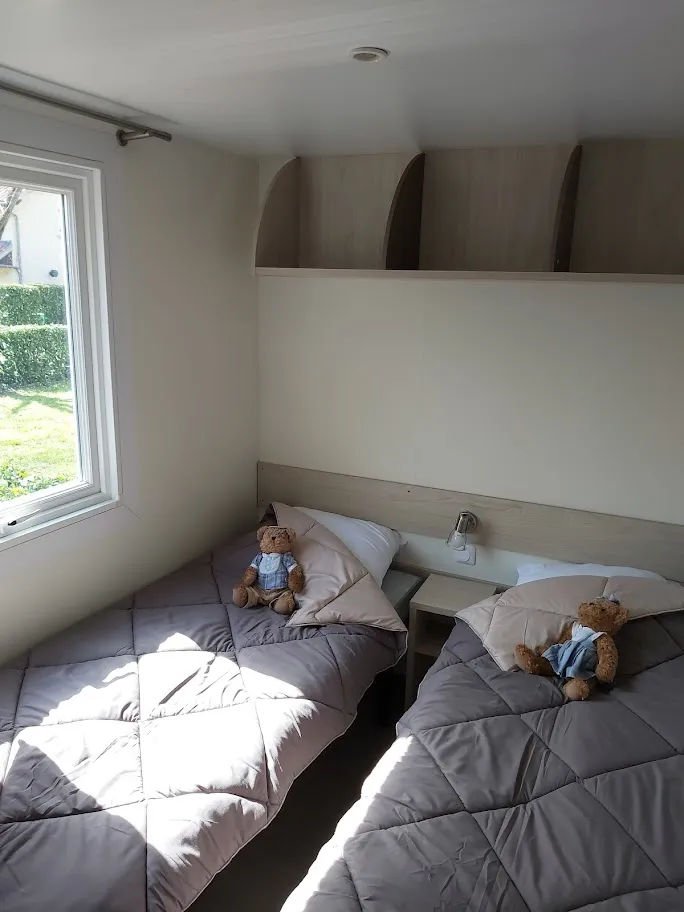 Jolis mobil home de 4/5 couchages. Ils sont munis de deux chambres séparées avec pour les enfants 2 lits en 80 et les parents 1 lit en 140/190. Pour la literie des couettes et oreillers sont fournis, il faut apporter les draps. La cinquième personne ( en supplément) pourra dormir sur la banquette du salon qui n'est pas convertible. Si plus de 5 personnes, possibilité de mettre une tente sur la parcelle afin d’ accueillir les personnes . Ajoutez alors tente et personnes supplémentaires. La cuisine est équipée avec vaisselle, hôte, grand frigo avec partie congélateur, micro onde, cafetière à filtre, bouilloire et grille pain. Il y a une télévision. Les wc sont séparés de la salle de douche La terrasse est entièrement couverte.