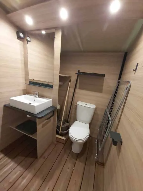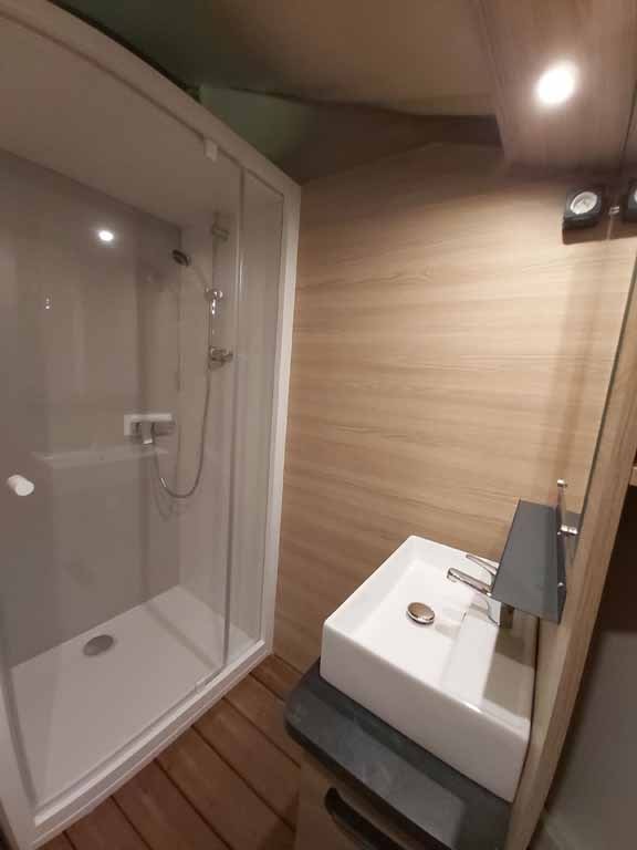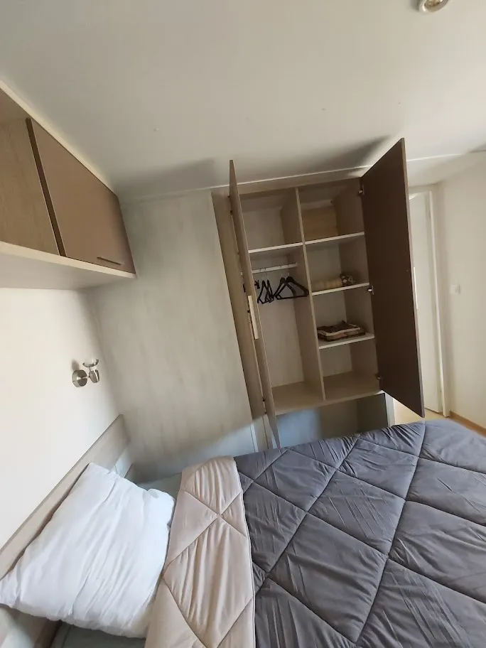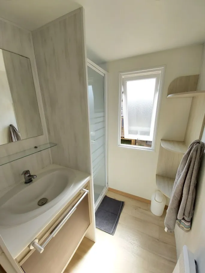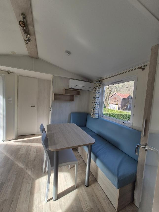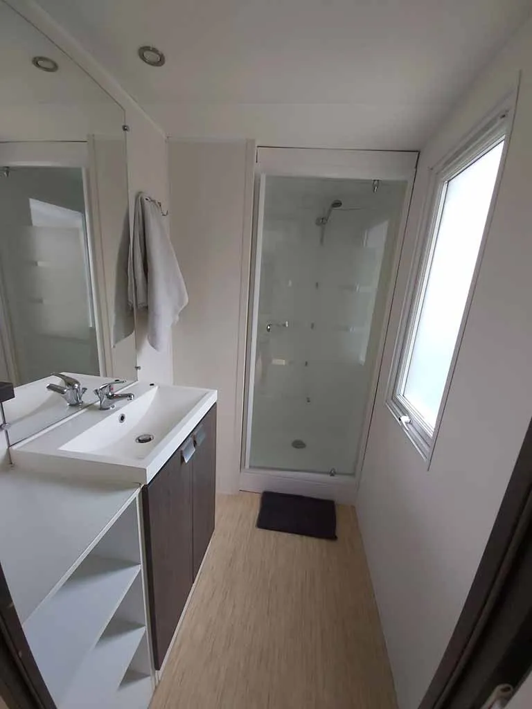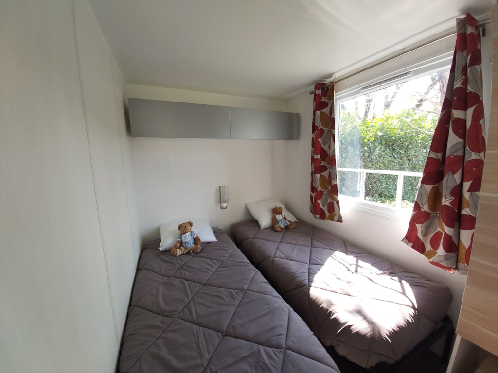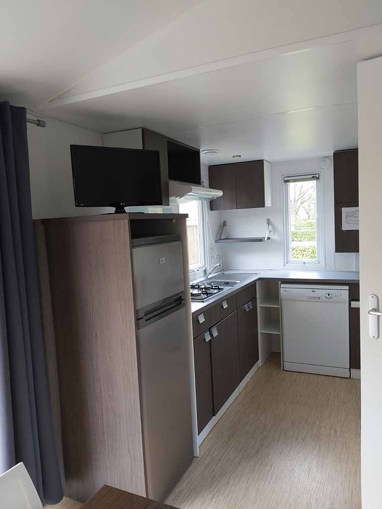 Jolis mobil home de 4/5 couchages. Ils sont munis de deux chambres séparées avec pour les enfants 2 lits en 80 et les parents 1 lit en 140/190. Pour la literie des couettes et oreillers sont fournis, il faut apporter les draps. La cinquième personne ( en supplément) pourra dormir sur la banquette du salon qui n'est pas convertible. Si plus de 5 personnes, possibilité de mettre une tente sur la parcelle afin d’ accueillir les personnes . Ajoutez alors tente et personnes supplémentaires. La cuisine est équipée avec vaisselle, hôte, grand frigo avec partie congélateur, micro onde, cafetière à filtre, bouilloire et grille pain. Il y a une télévision. Les wc sont séparés de la salle de douche La terrasse est entièrement couverte.