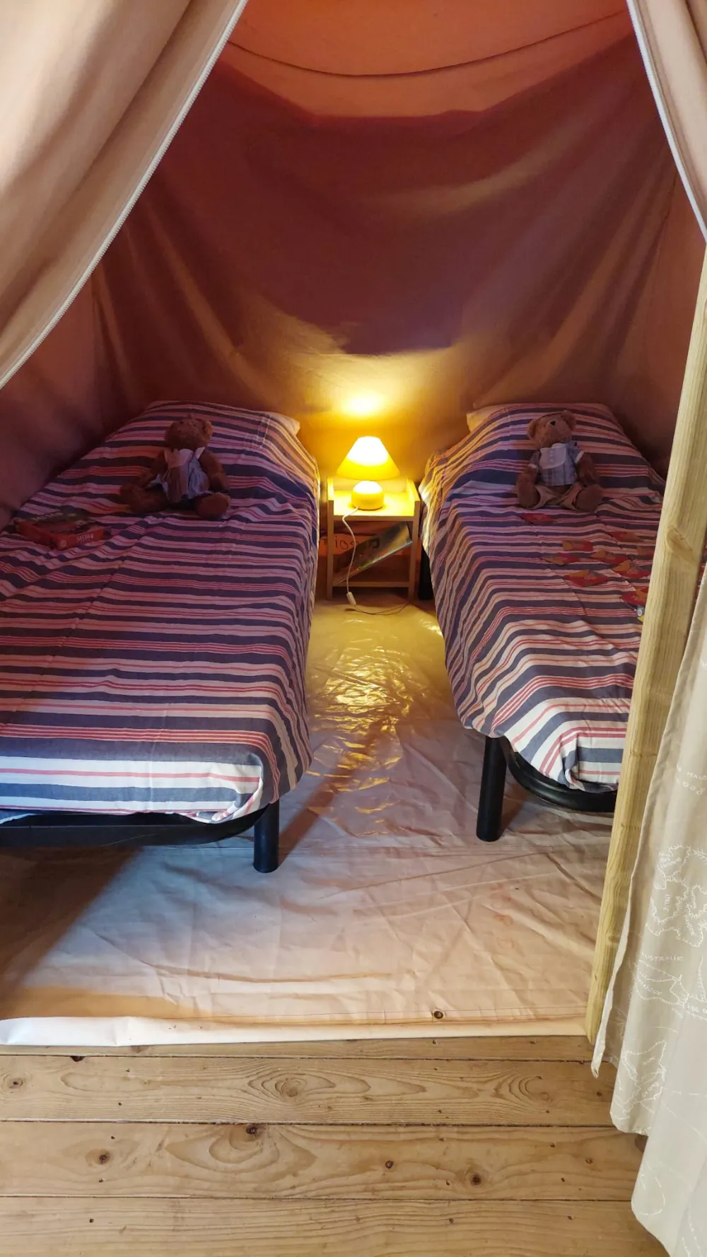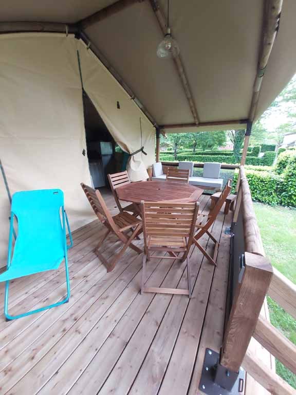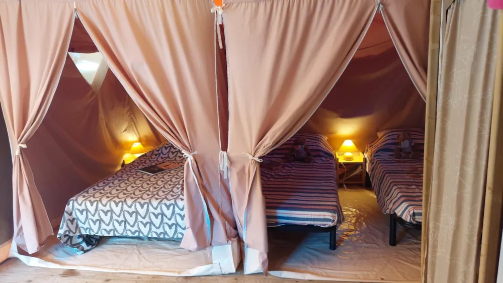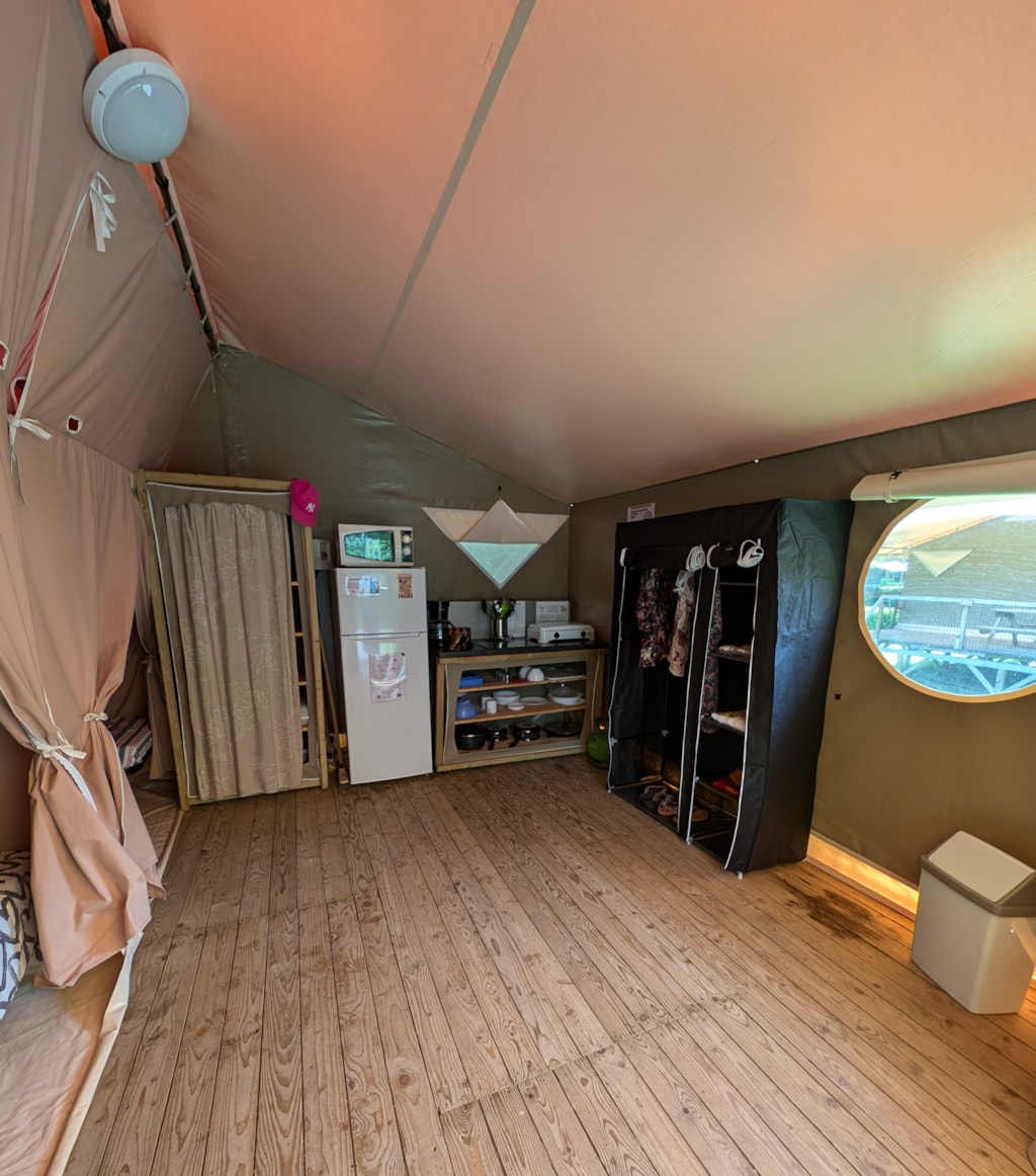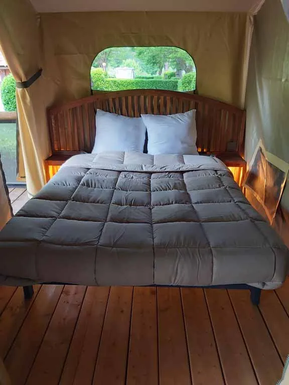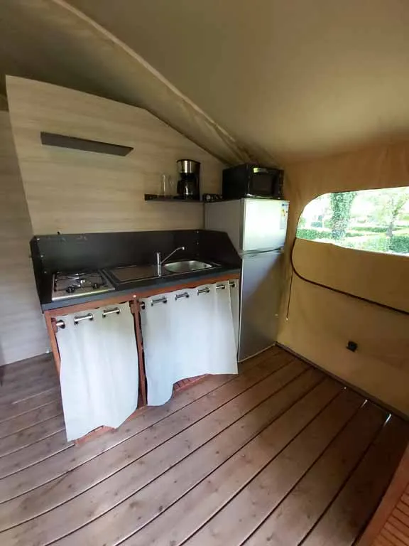 Jolie tente Canada pour un camping plus proche de la nature. Elles sont munies de 2 chambres séparées avec pour les enfant 2 lits en 90/190 et 140/190 pour la chambre parentale. Pour la literie des couettes et oreillers sont fournis, il faut apporter les draps. Si plus de 4 personnes, possibilité de mettre une tente sur la parcelle afin d’ accueillir les personnes . Ajoutez alors tente et personnes supplémentaires. La cuisine est équipée avec vaisselle, frigo TOP , micro onde, cafetière à filtre et bouilloire . Le tente ne possède pas de sanitaire. La terrasse est entièrement couverte