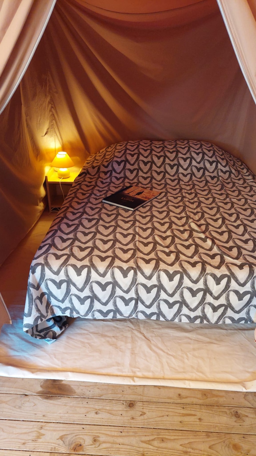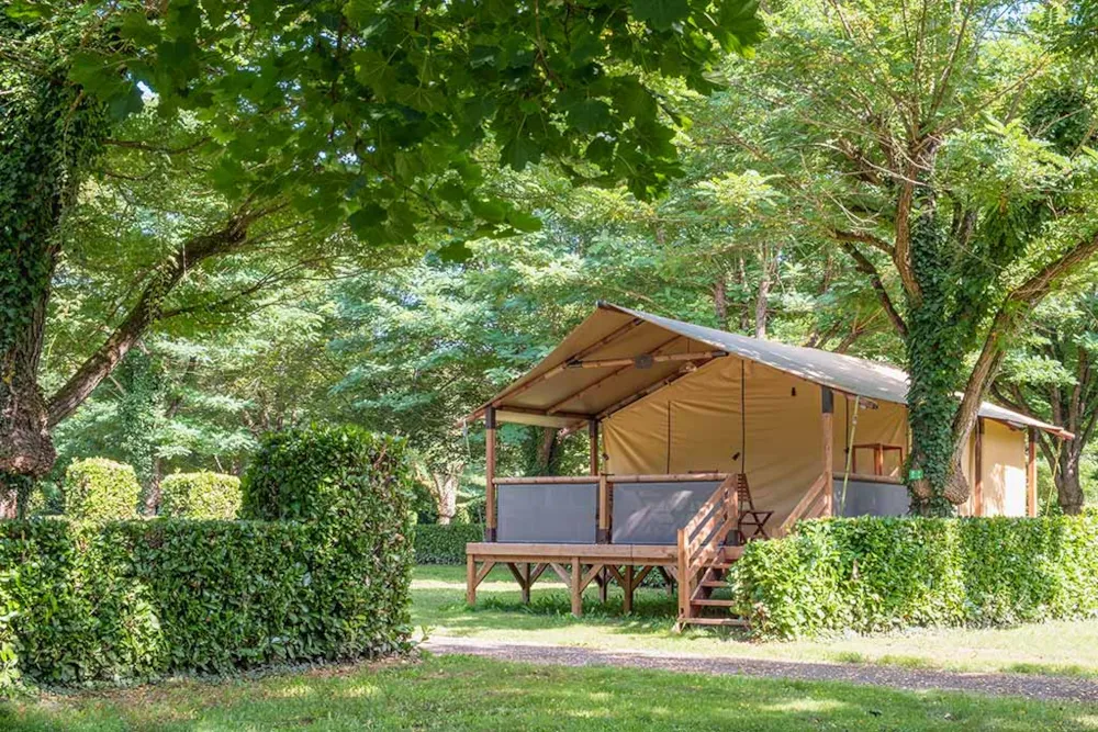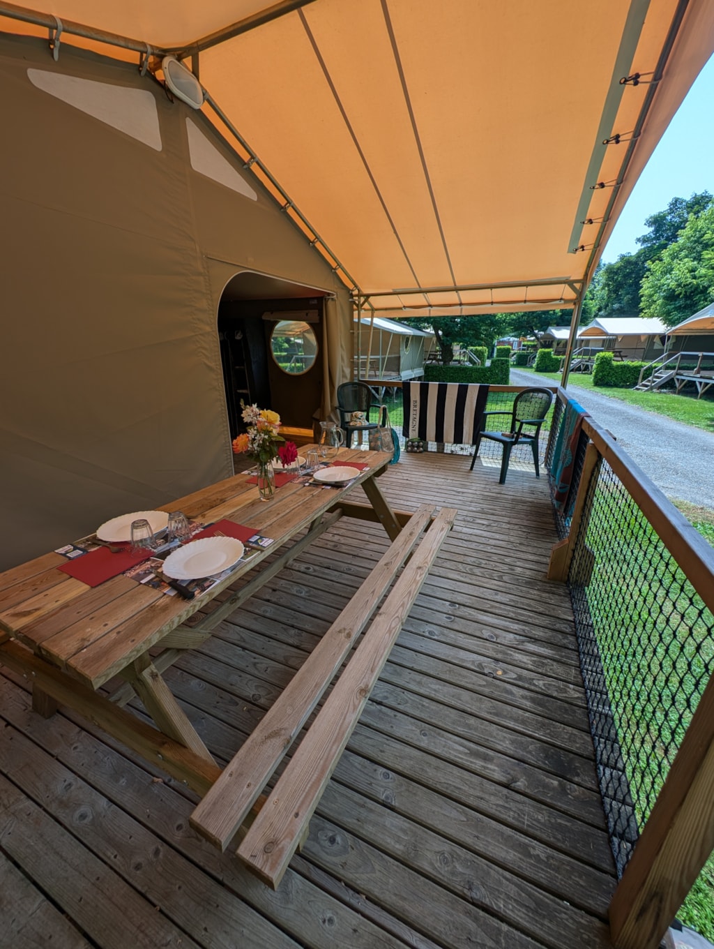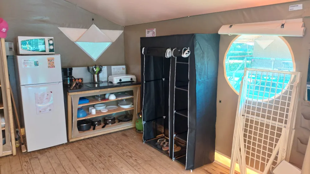 Jolie tente Canada pour un camping plus proche de la nature. Elles sont munies de 2 chambres séparées avec pour les enfant 2 lits en 90/190 et 140/190 pour la chambre parentale. Pour la literie des couettes et oreillers sont fournis, il faut apporter les draps. Si plus de 4 personnes, possibilité de mettre une tente sur la parcelle afin d’ accueillir les personnes . Ajoutez alors tente et personnes supplémentaires. La cuisine est équipée avec vaisselle, frigo TOP , micro onde, cafetière à filtre et bouilloire . Le tente ne possède pas de sanitaire. La terrasse est entièrement couverte