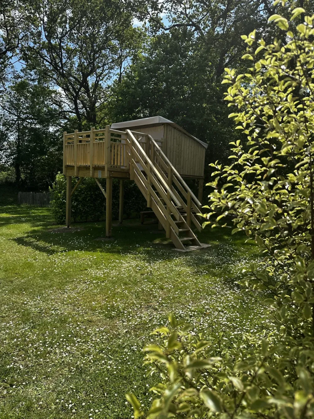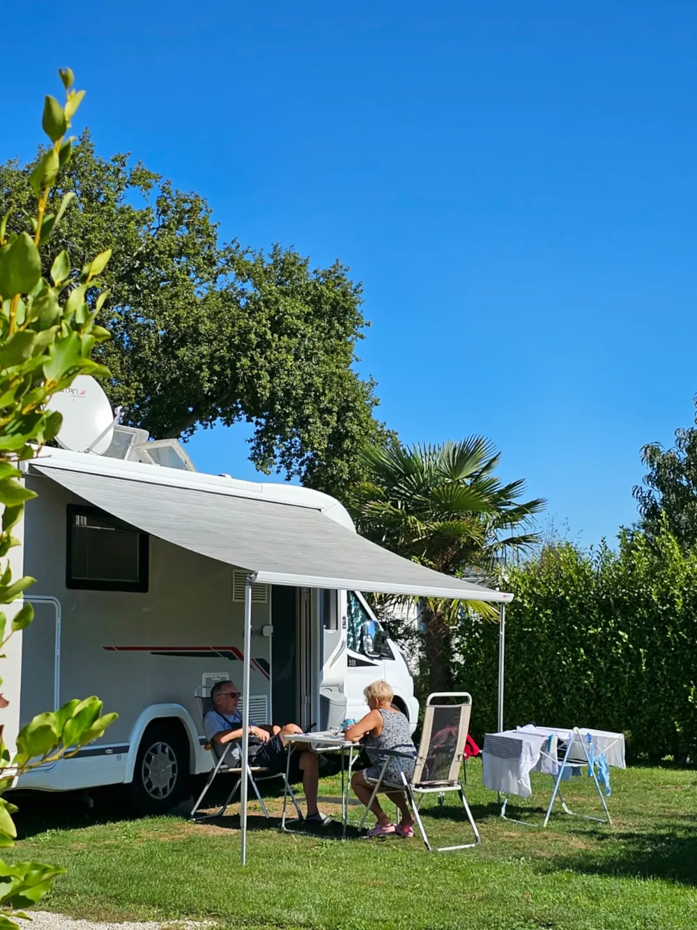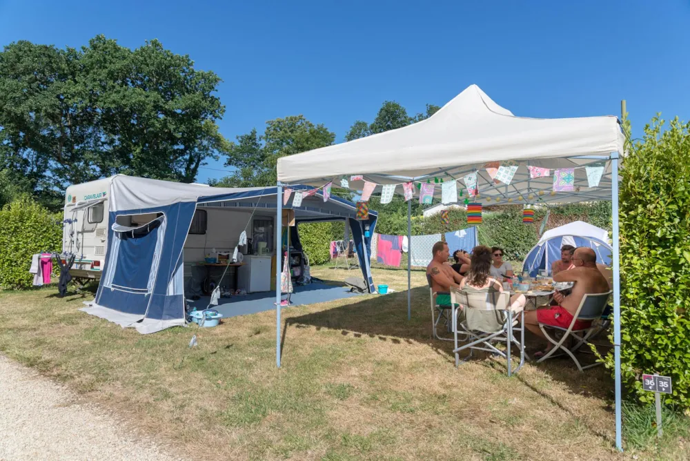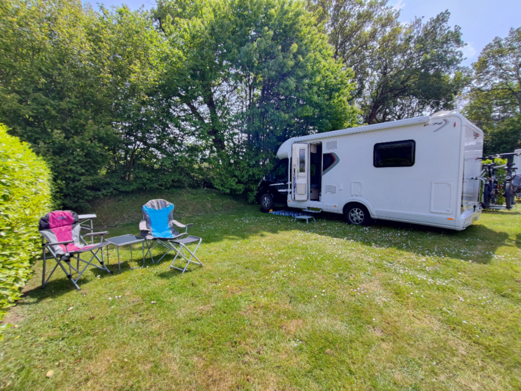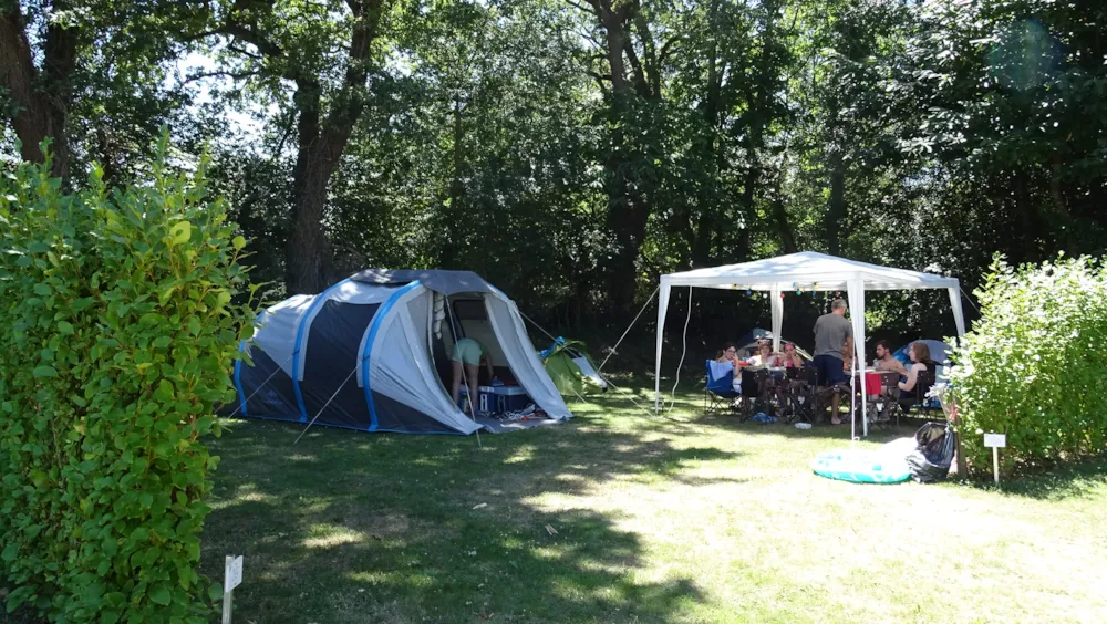 Our spacious pitches of about 120m² are grassy, delimited by hedges and either sunny or semi-shaded.