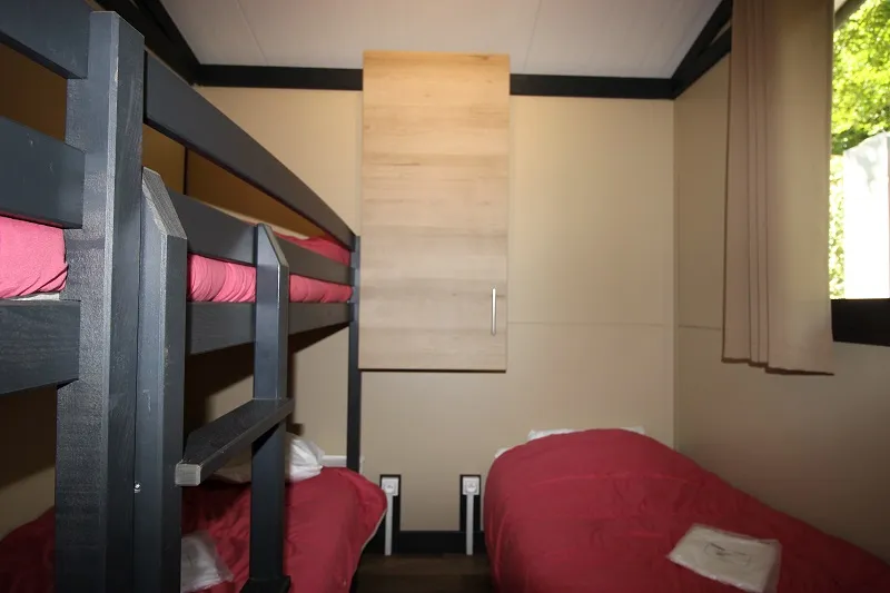 Our largest accommodation, ideal for large families with its 3 bedrooms. You will appreciate its parental suite with direct access to the bathroom and its 100x80 cm shower, a hair dryer, a bedroom with 2 single beds that can be pushed together and a mezzanine bedroom that will delight children. Its strong points : a dining room with its oval table and 6 chairs, living room, television, kitchen equipped with a dishwasher, combi blinds blackout mosquito net in each bedroom. Access the "Garden Side" terrace thanks to its large bay window on the rear facade with its garden furniture and 2 relax chairs !